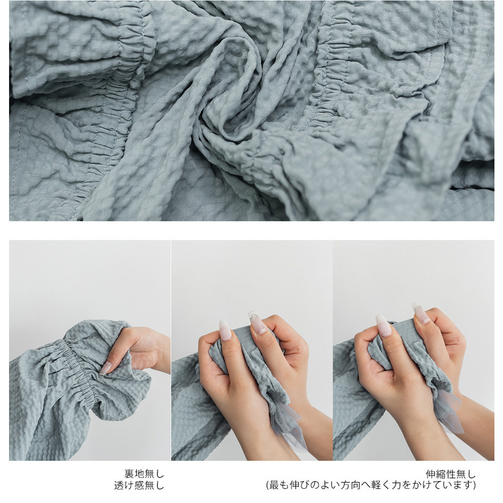 素材 ■素材 【表地】ポリエステル100%、【裏地】ポリエステル100% ■裏地・透け感・伸縮性 裏地有り、透け感少し有り、伸縮性無し ■ポケット 無し ■生地感 表面感があり程よくハリのある軽い素材です。 ※裏地は伸縮性のあるチュール素材です。