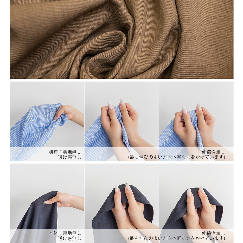 素材 ■素材 【本体表地】ポリエステル95%、ポリウレタン5%、【別布】その他70%、ポリエステル25%、ポリウレタン5% ■裏地・透け感・伸縮性 本体:裏地無し、透け感無し、伸縮性無し / 別布:裏地無し、透け感少し有り、伸縮性無し ■ポケット 無し ■生地感 本体:程よくしっかりさらっとした素材です。 別布部分:少し表面感のある柔らかいシャツ素材です。