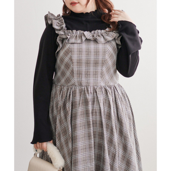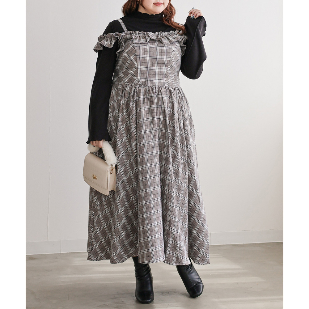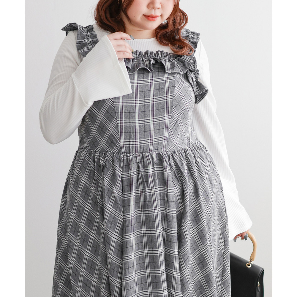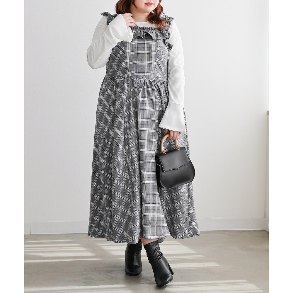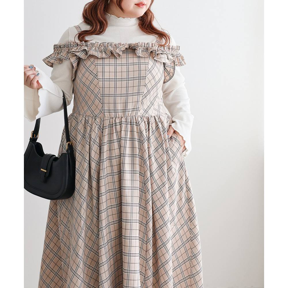 3Lサイズを着用しましたが、ちょうどいいサイズ感です。さらりとした生地で着心地が軽く、長時間着ても快適そうです◎フリルが顔まわりを華やかに見せてくれ、ウエストの切替デザインがスタイルをすっきり見せてくれます。肩紐のフリルは2WAY仕様で、フリルを下げて着ると抜け感が出てすっきりメリハリのある印象でしかも可愛いです!!チェック柄が今っぽくて、オールシーズン使えるのがうれしいポイントです! |