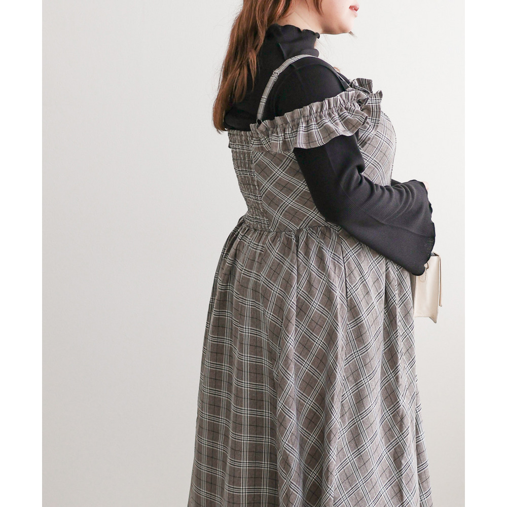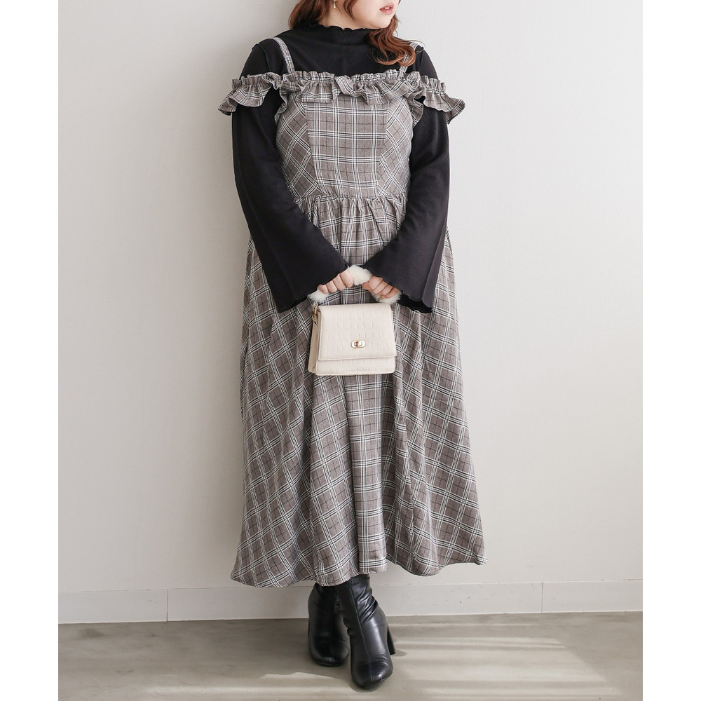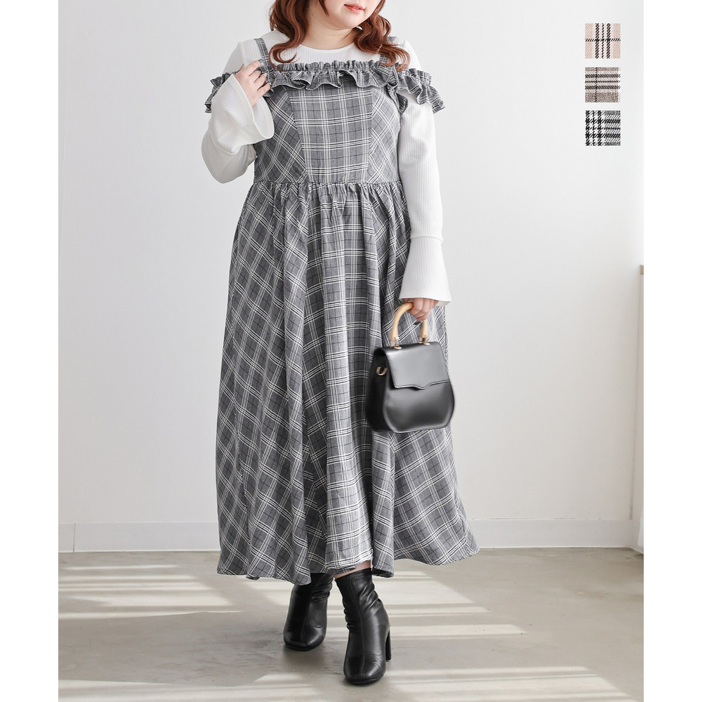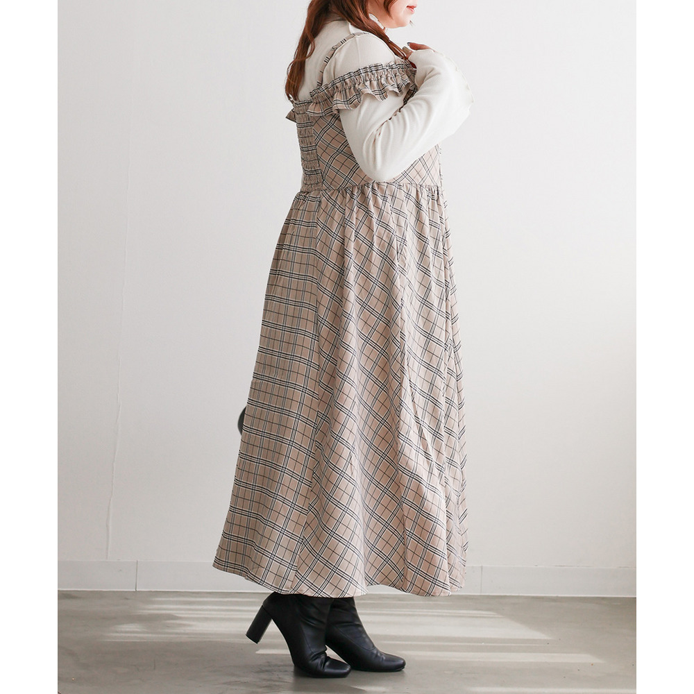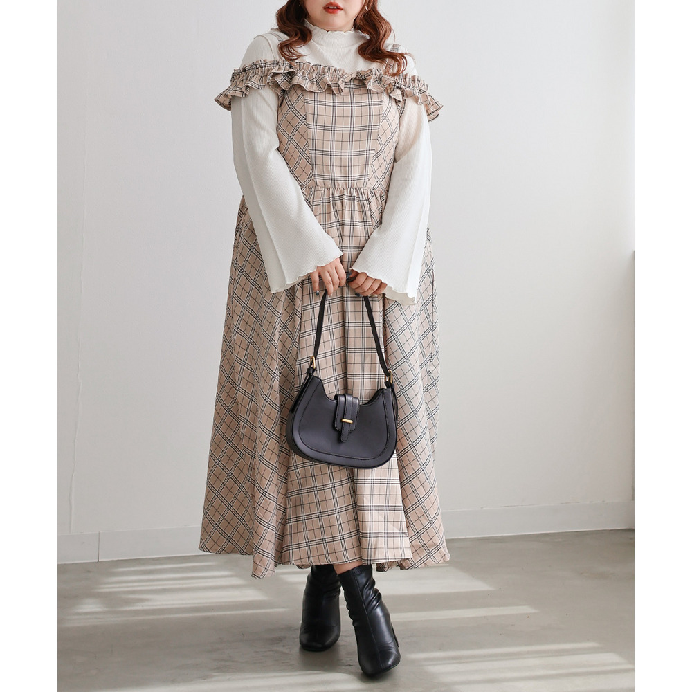 3Lサイズを着用しましたが、ちょうどいいサイズ感です。さらりとした生地で着心地が軽く、長時間着ても快適そうです◎フリルが顔まわりを華やかに見せてくれ、ウエストの切替デザインがスタイルをすっきり見せてくれます。肩紐のフリルは2WAY仕様で、フリルを下げて着ると抜け感が出てすっきりメリハリのある印象でしかも可愛いです!!チェック柄が今っぽくて、オールシーズン使えるのがうれしいポイントです! |