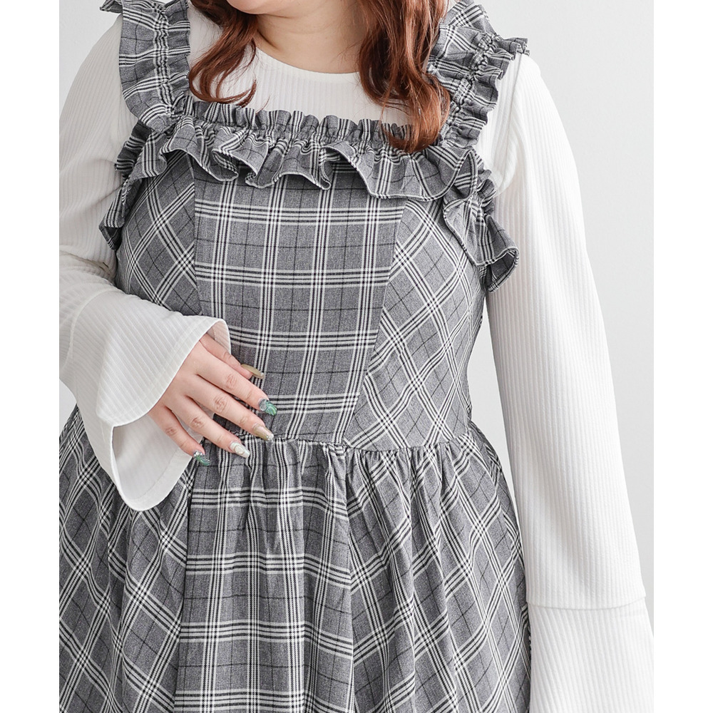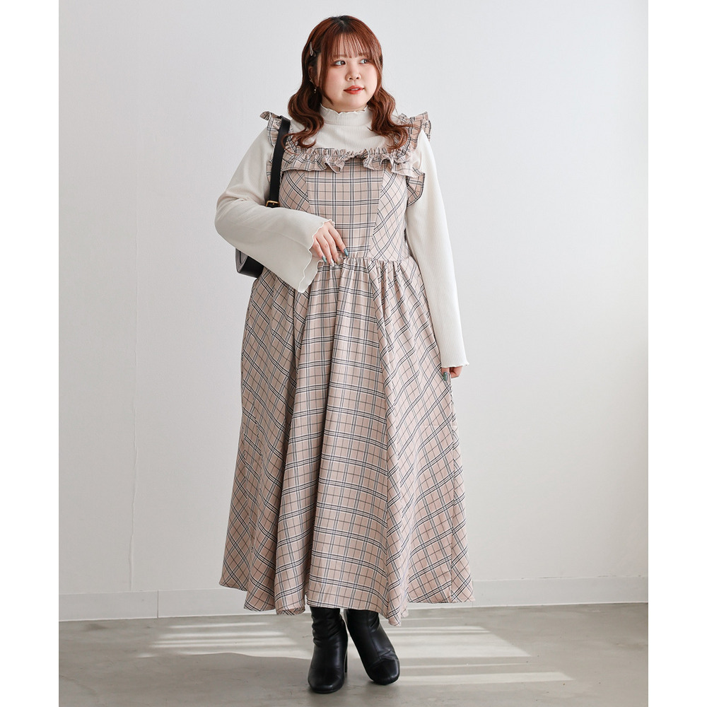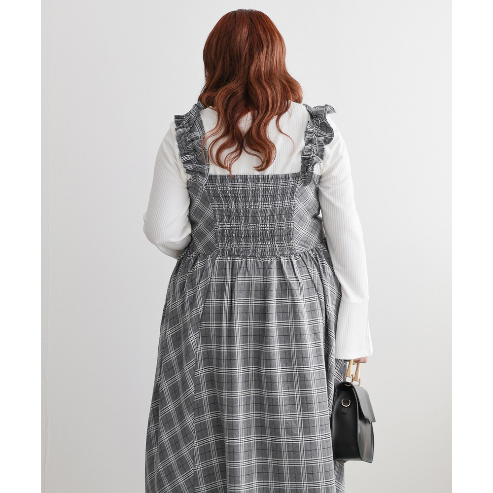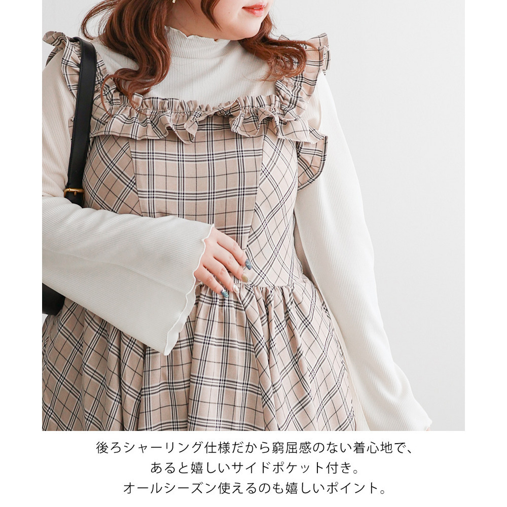 3Lサイズを着用しましたが、ちょうどいいサイズ感です。さらりとした生地で着心地が軽く、長時間着ても快適そうです◎フリルが顔まわりを華やかに見せてくれ、ウエストの切替デザインがスタイルをすっきり見せてくれます。肩紐のフリルは2WAY仕様で、フリルを下げて着ると抜け感が出てすっきりメリハリのある印象でしかも可愛いです!!チェック柄が今っぽくて、オールシーズン使えるのがうれしいポイントです! |