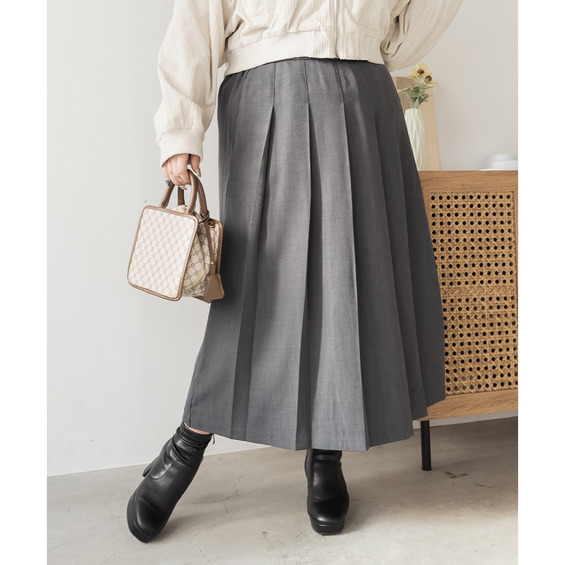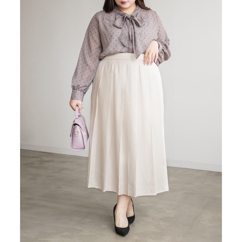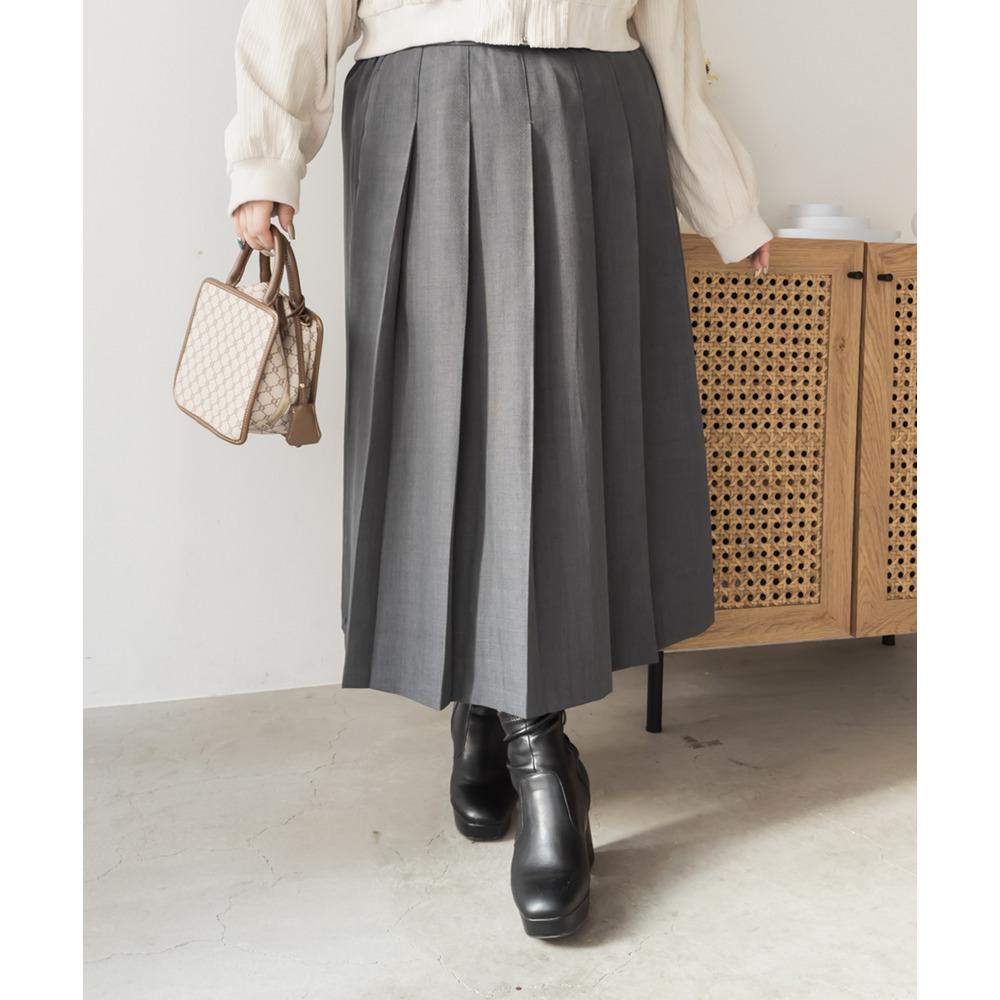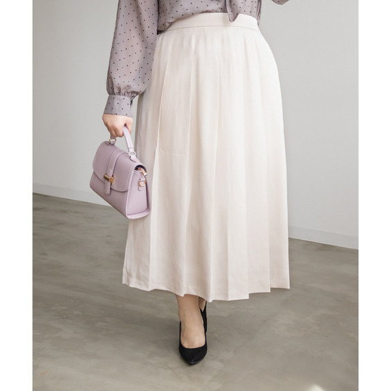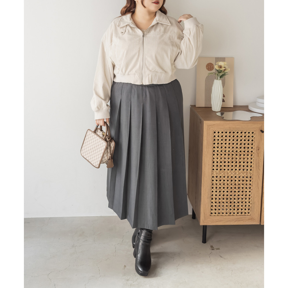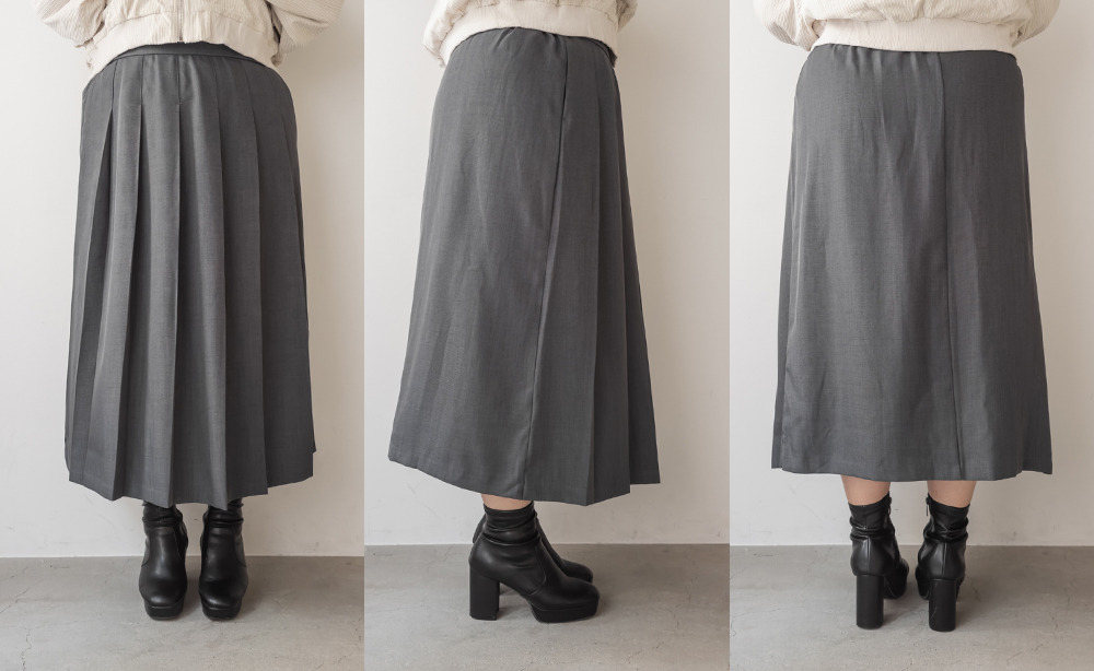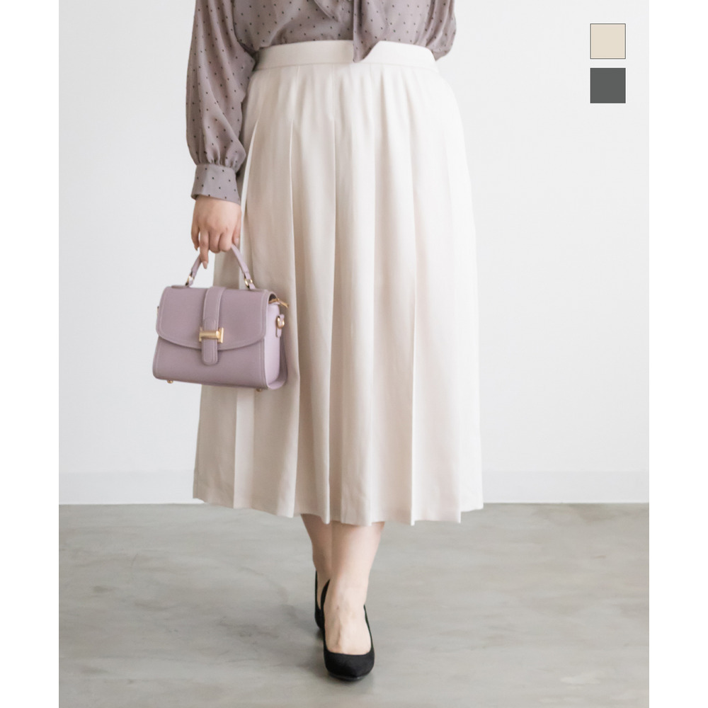 3Lサイズを着用しました。後ろはゴムで窮屈感無く、ちょうどいいサイズ感でした!プリーツの落ち感がきれいで上品見えします。後ろはプリーツ加工されていないので、座ったりしても安心です◎長すぎない着丈で低身長さんにもおすすめです!フレアシルエットで腰回りや太もも周りをしっかりカバーしてくれて、ブーツ合わせはもちろん、フラットシューズでもヒールでもバランスよく合わせられそうです!きれいめにもカジュアルにも使えて、オンオフ問わず活躍してくれるスカートです! |