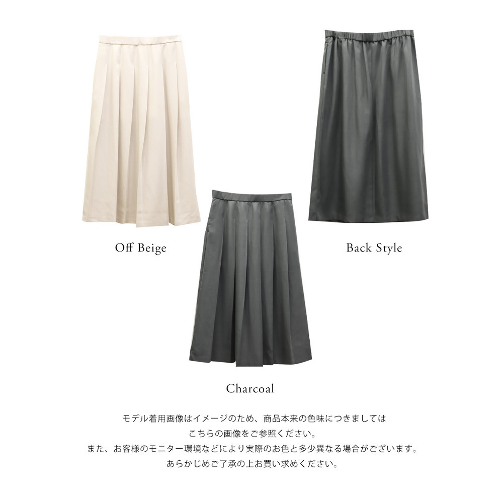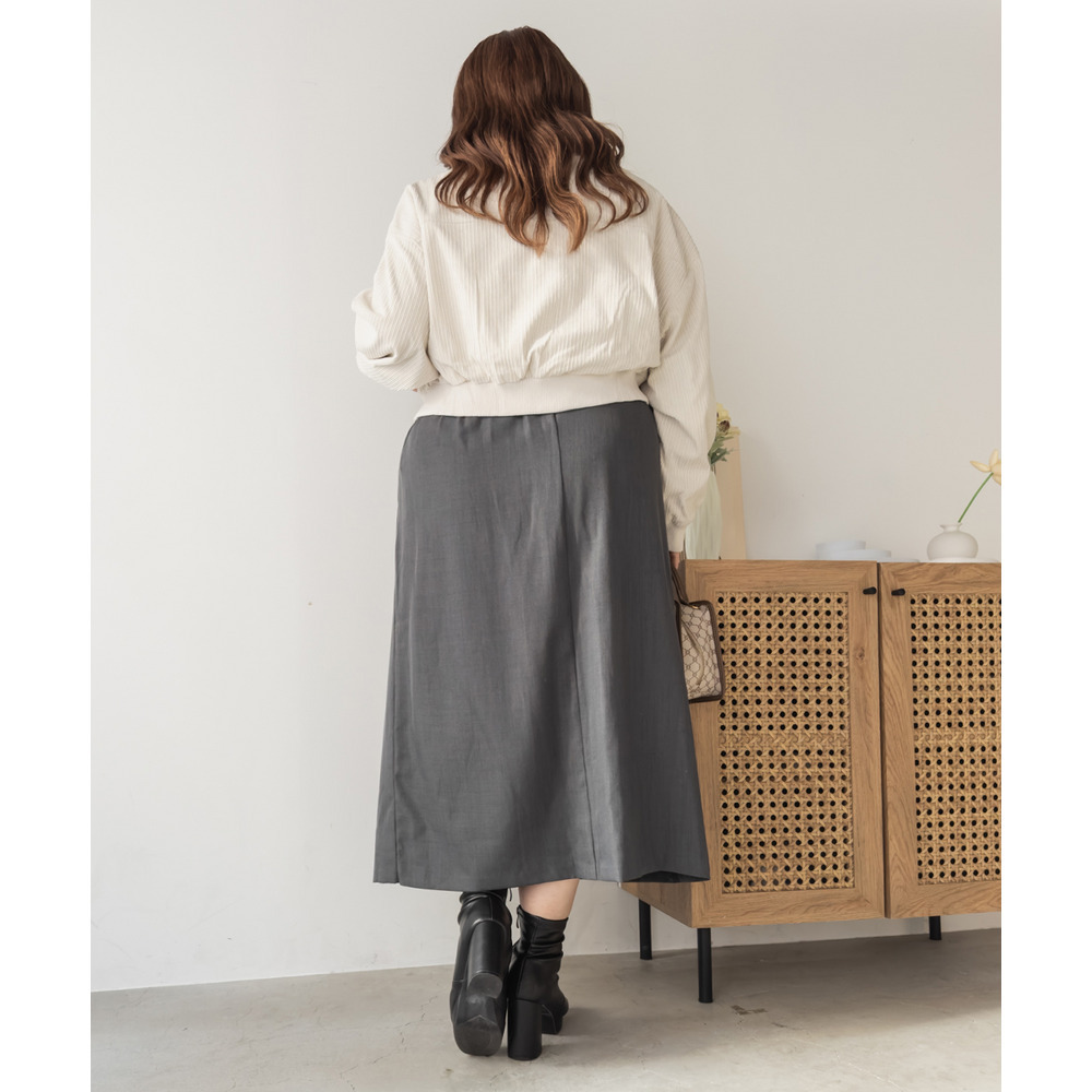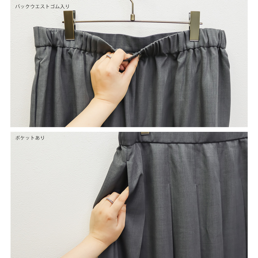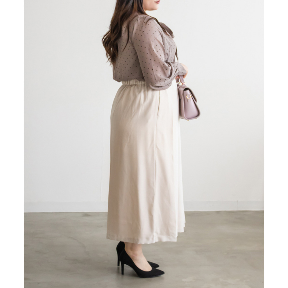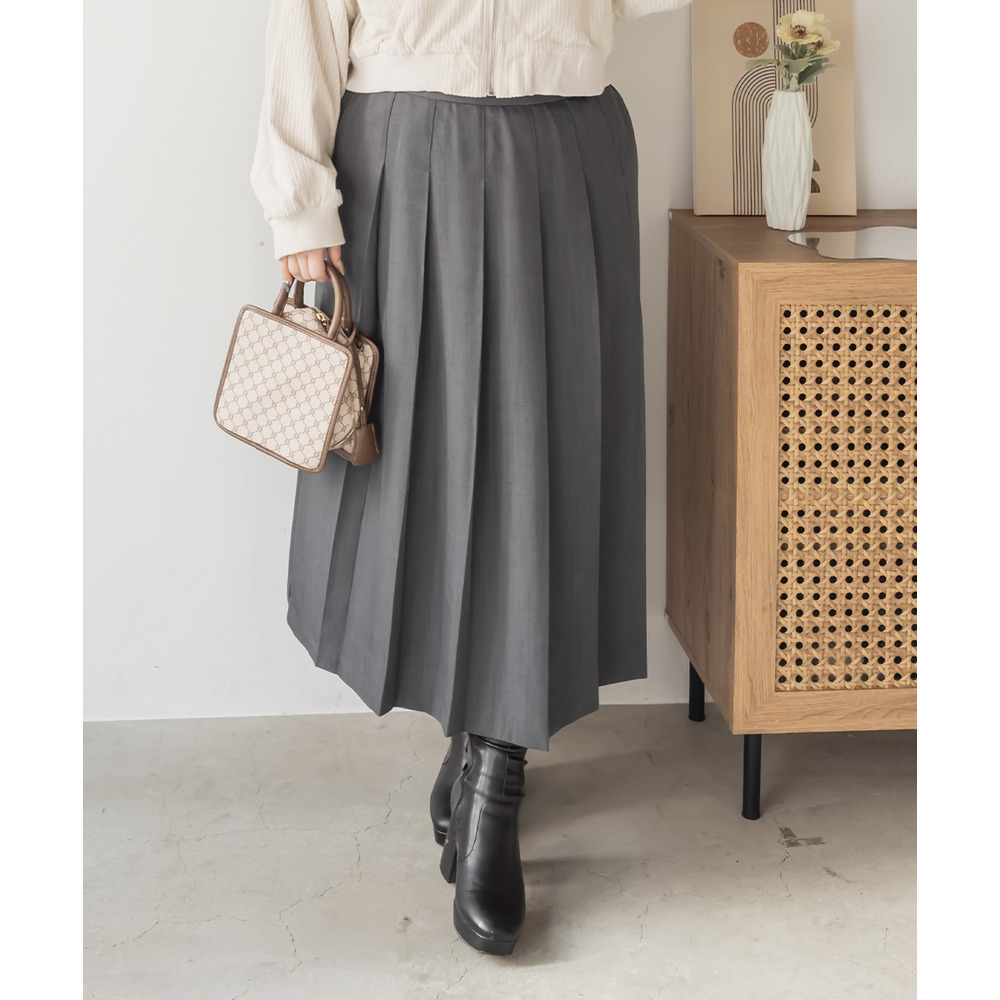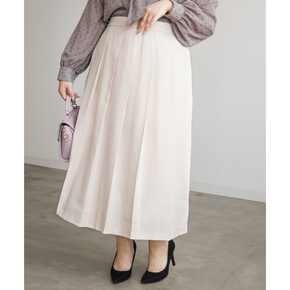3Lサイズを着用しました。後ろはゴムで窮屈感無く、ちょうどいいサイズ感でした!プリーツの落ち感がきれいで上品見えします。後ろはプリーツ加工されていないので、座ったりしても安心です◎長すぎない着丈で低身長さんにもおすすめです!フレアシルエットで腰回りや太もも周りをしっかりカバーしてくれて、ブーツ合わせはもちろん、フラットシューズでもヒールでもバランスよく合わせられそうです!きれいめにもカジュアルにも使えて、オンオフ問わず活躍してくれるスカートです! |