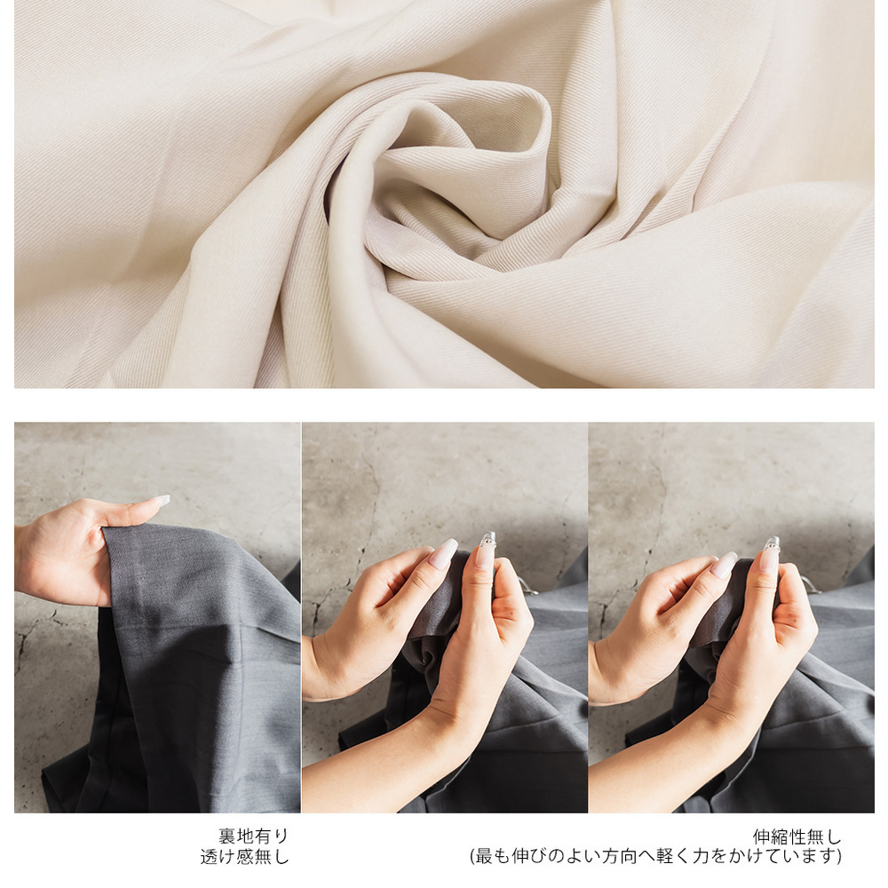 素材 | ■素材 【表地】ポリエステル100%、【裏地】ポリエステル100% ■裏地・透け感・伸縮性 ■生地感 さらっとした少し落ち感のある素材です。 |