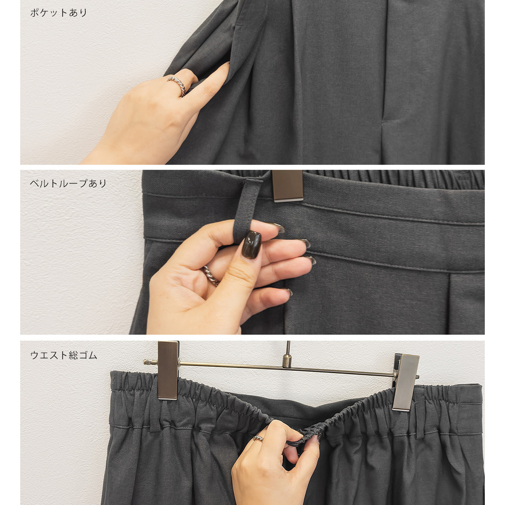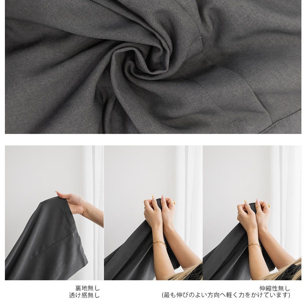 素材 | ■素材 ポリエステル100% ■裏地・透け感・伸縮性 裏地無し、透け感無し、伸縮性無し ■ポケット 有り ■生地感 程良くしっかりとしたさらっとした素材です。 |