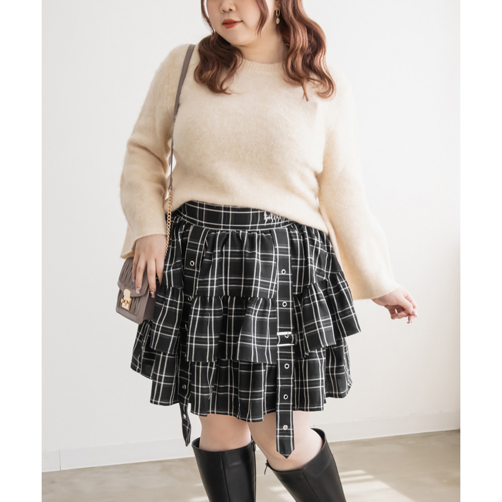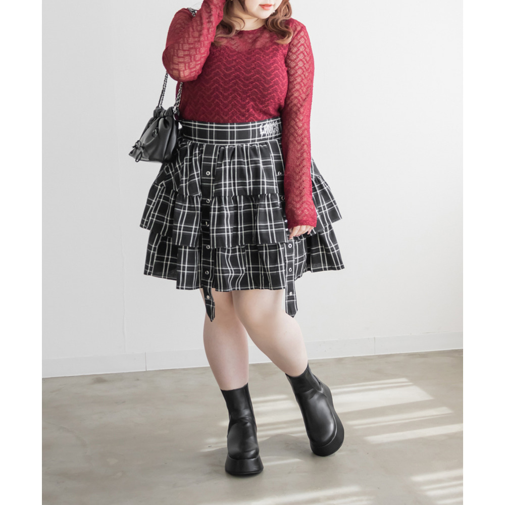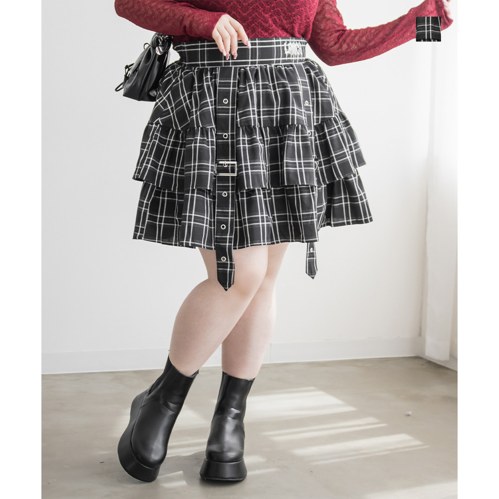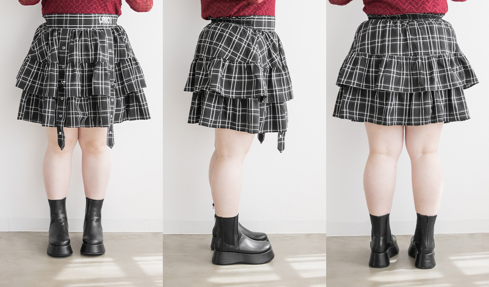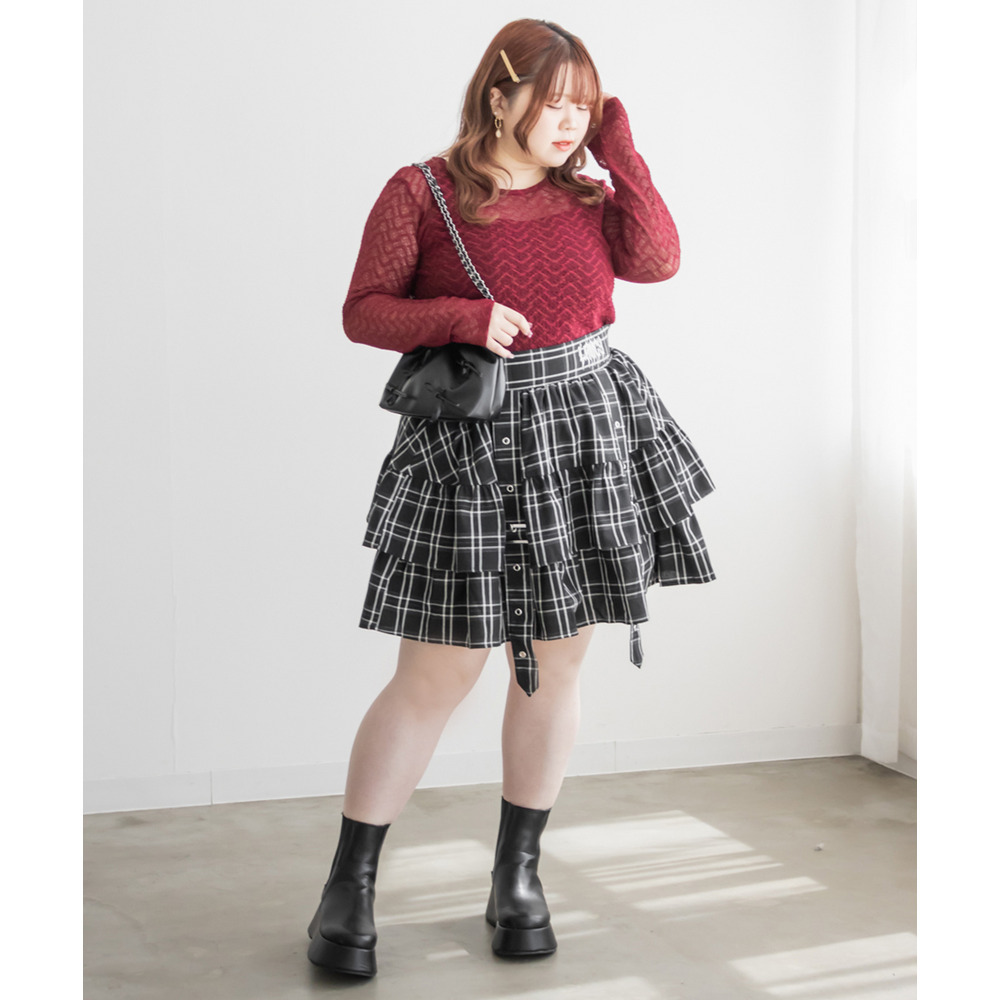 3Lサイズを着て、ちょうどよいサイズ感で着用出来ました◎後ろはゴムになっているので着脱もらくちんに出来ました!ティアードになっているので腰回りの肉感をすっきりカバーしてくれるのが嬉しい♪甘い雰囲気のミニスカートですが、ベルトデザインなど少し辛めの要素もあるので、ガーリー過ぎずに着こなせます!ブラウスやレーストップスと合わせて、ガーリーに仕上げたり、ギャルっぽいスタイリングもお勧めです!オールシーズン着まわせるスカートなので、たくさん着回ししたい1枚です! |