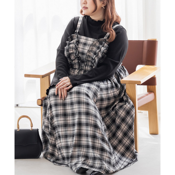 | 3Lサイズを着用しましたが、ちょうどいいサイズ感です。さらりとした生地で着心地が軽く、長時間着ても快適そうです◎フリルが顔まわりを華やかに見せてくれ、ウエストの切替デザインがスタイルをすっきり見せてくれます。チェック柄が今っぽくて、オールシーズン使えるのがうれしいポイントです! |