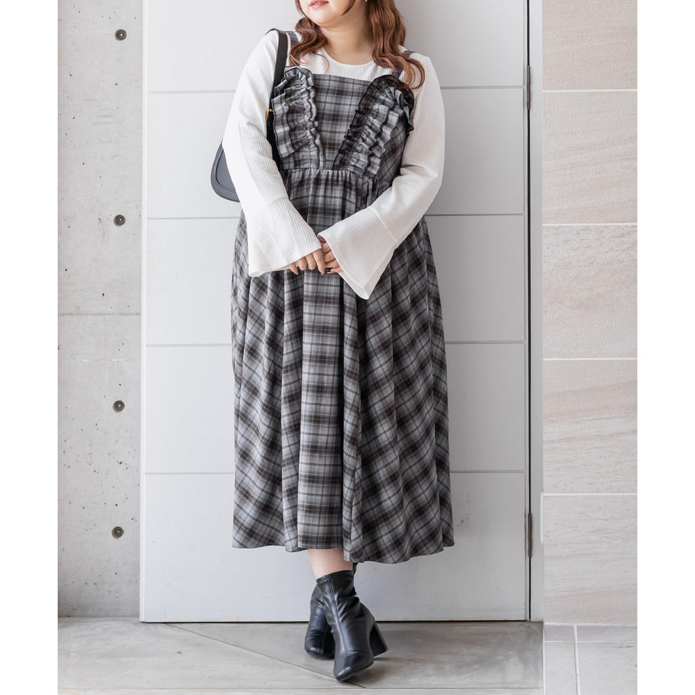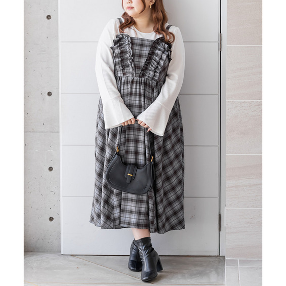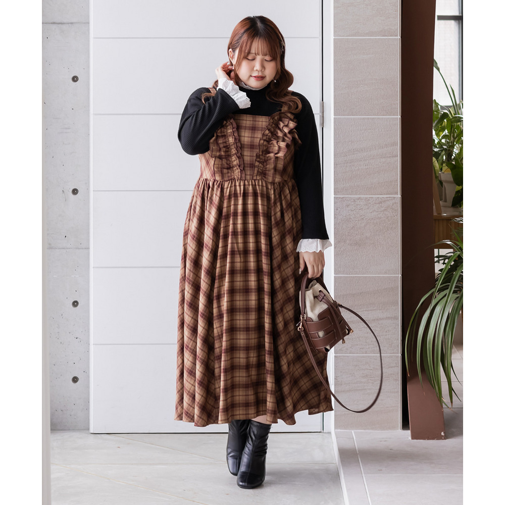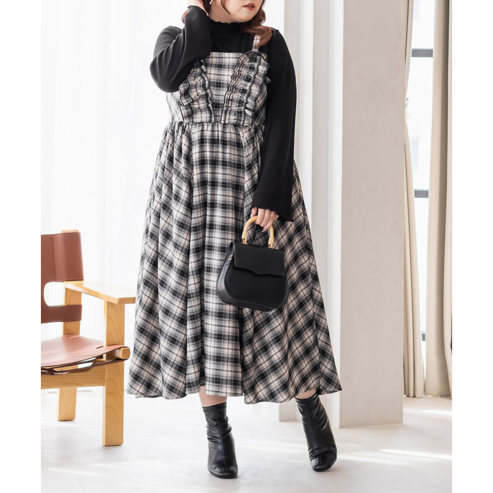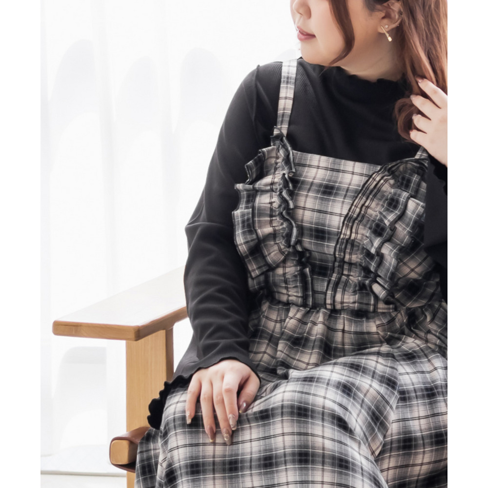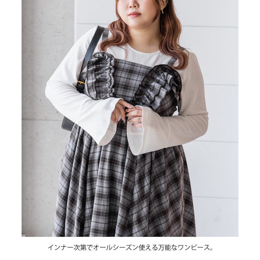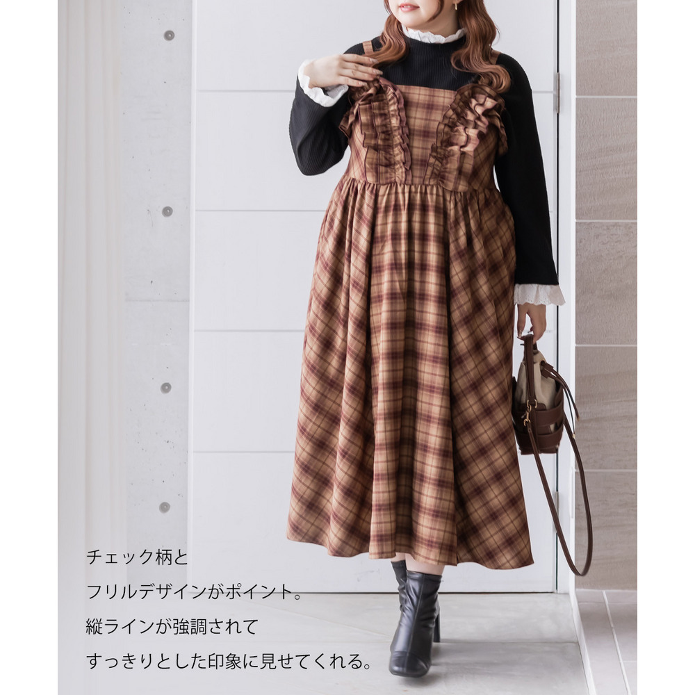 3Lサイズを着用しましたが、ちょうどいいサイズ感です。さらりとした生地で着心地が軽く、長時間着ても快適そうです◎フリルが顔まわりを華やかに見せてくれ、ウエストの切替デザインがスタイルをすっきり見せてくれます。チェック柄が今っぽくて、オールシーズン使えるのがうれしいポイントです! |