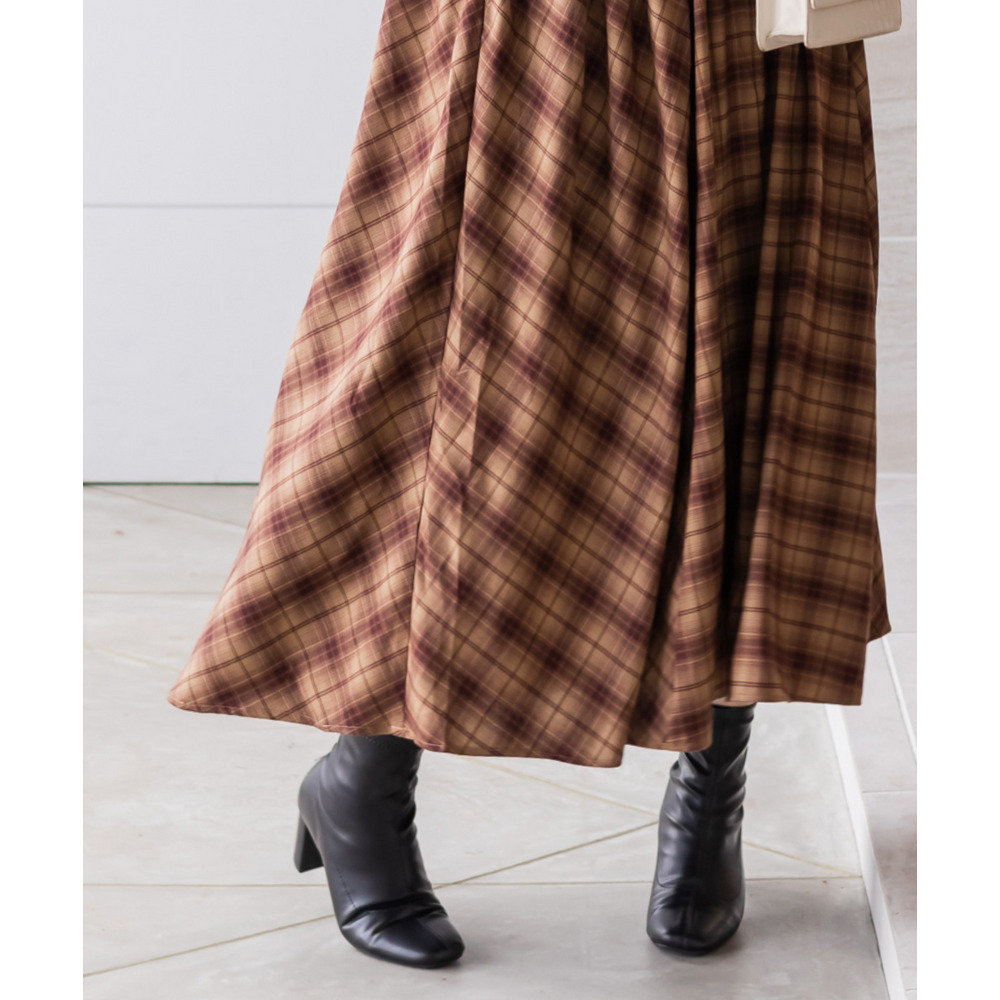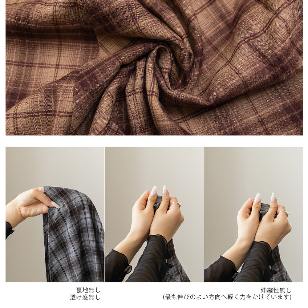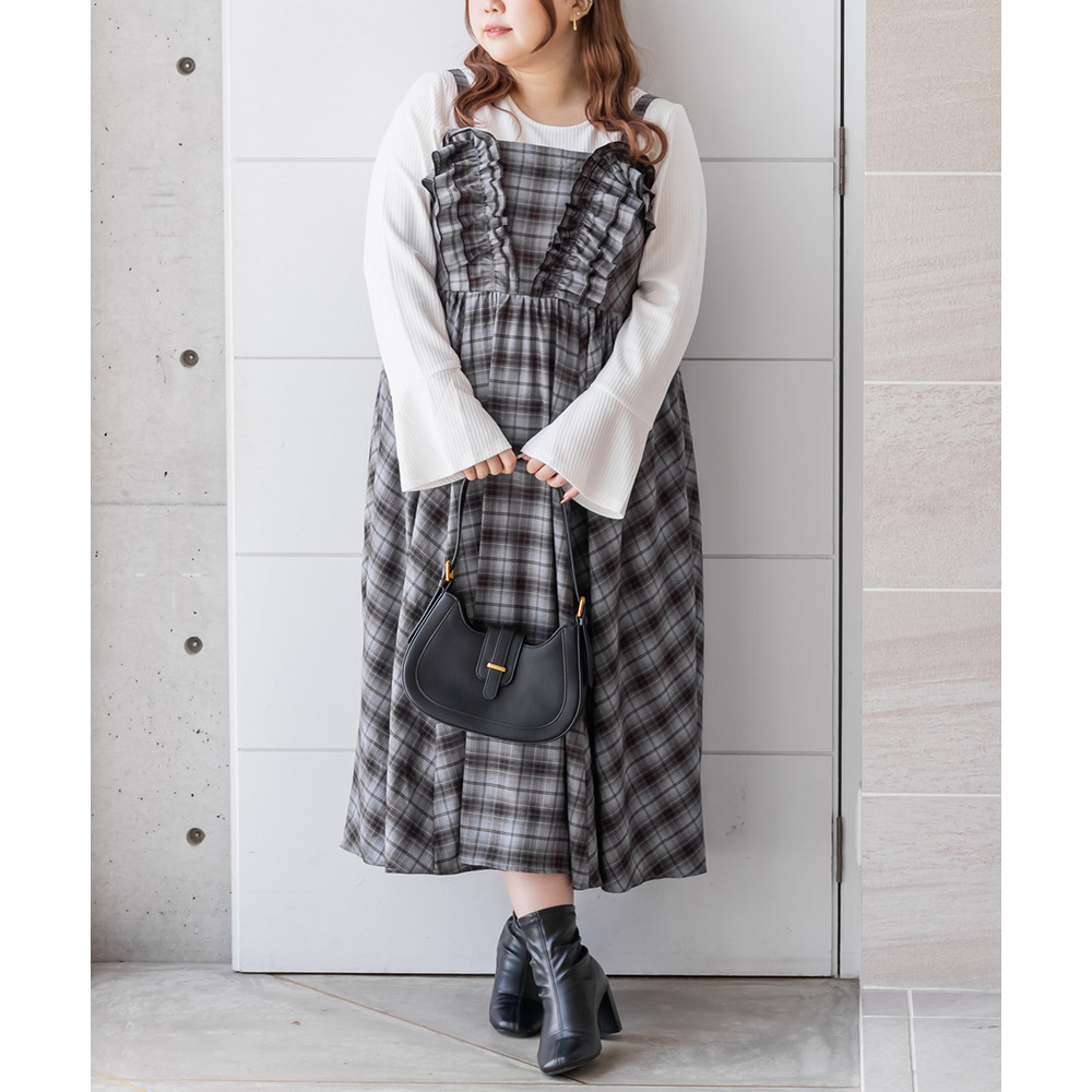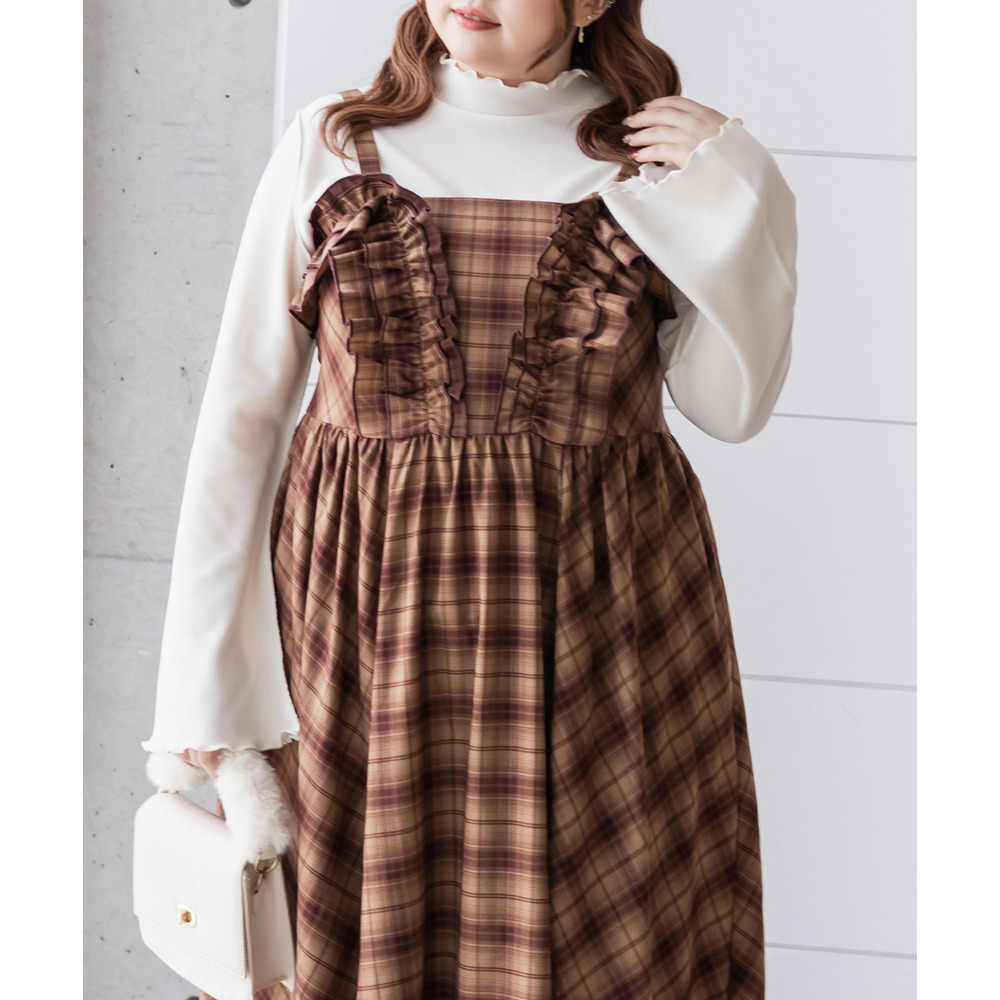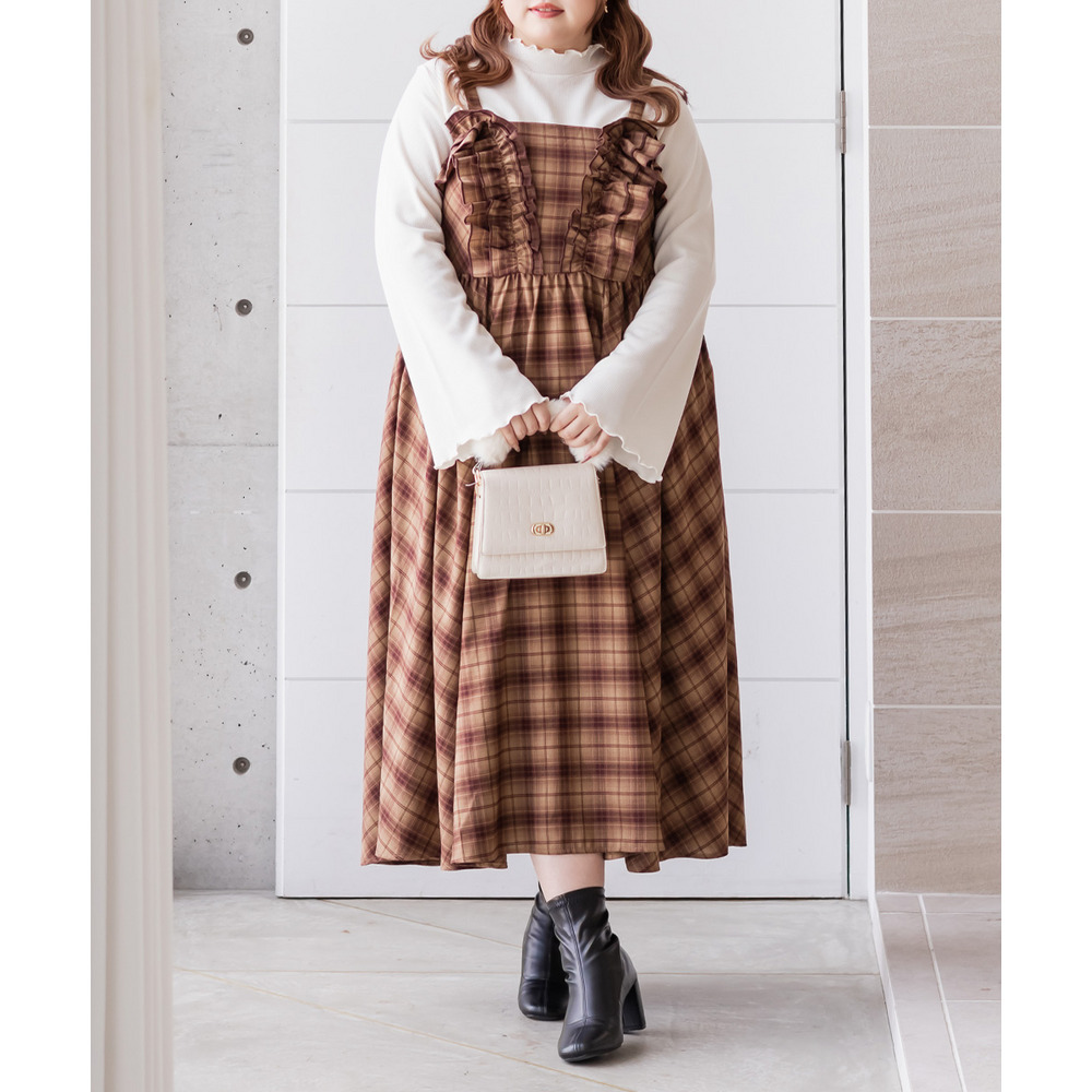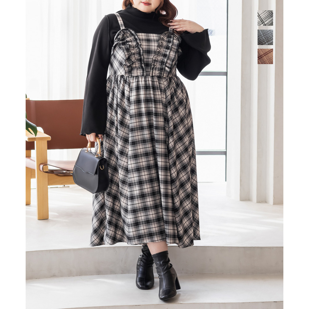 3Lサイズを着用しましたが、ちょうどいいサイズ感です。さらりとした生地で着心地が軽く、長時間着ても快適そうです◎フリルが顔まわりを華やかに見せてくれ、ウエストの切替デザインがスタイルをすっきり見せてくれます。チェック柄が今っぽくて、オールシーズン使えるのがうれしいポイントです! |