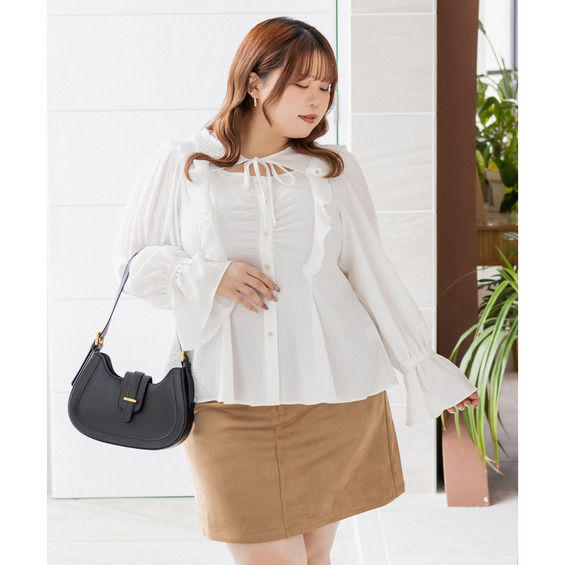 | 3Lサイズを着用してちょうどいいサイズ感でした。ウエストにタックが入っていて切替が無いのにメリハリが出てすっきりした印象で着用できました♪デコルテのリボンは女性らしいポイントになってネックレスいらずなのも嬉しいです◎ウエストはくびれて見えるデザインでスタイルアップ効果も◎凹凸のある軽い生地で長いシーズン着やすいです。袖もふんわりして二の腕カバーもバッチリで、デートやお出かけに着ていきたくなる1枚で着映えするブラウスです! |