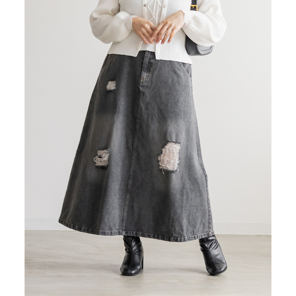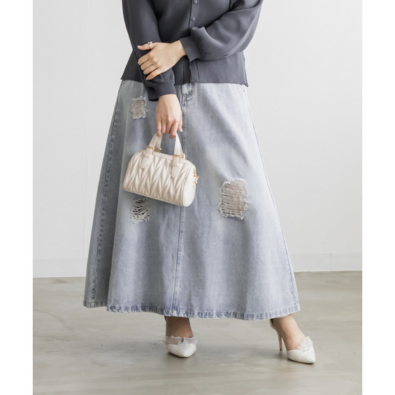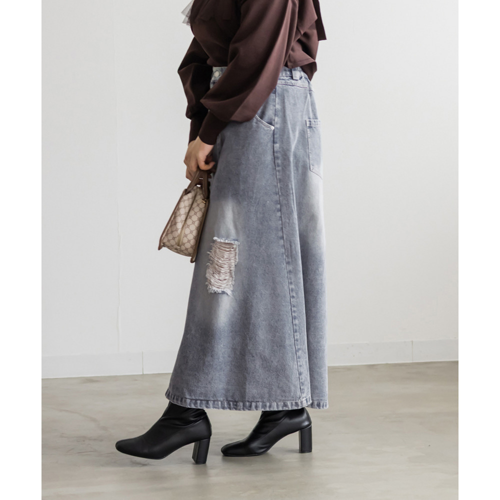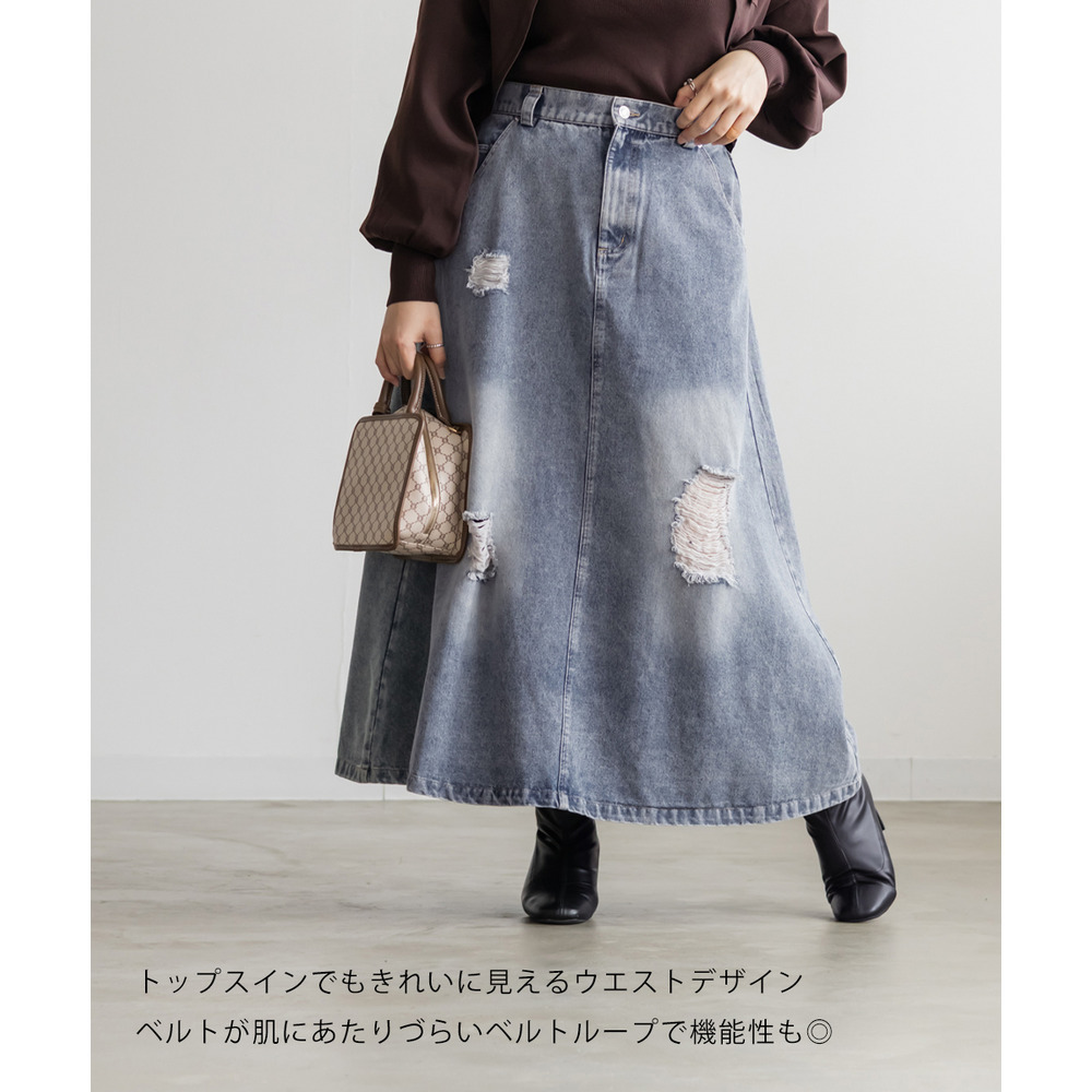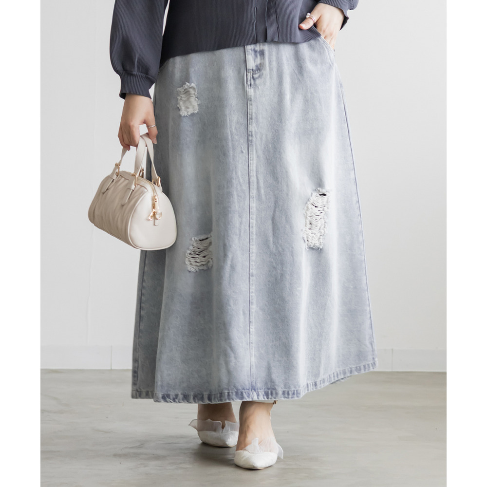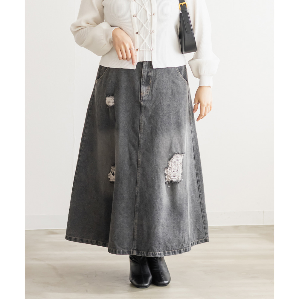 LLを着てちょうどいいサイズでした。ウエストは後ろゴムなのと、しっかり広がるフレアシルエットのおかげで窮屈感無く、ヒップや太ももは気にならず着用出来ました◎デニム素材だけど広がりが美しくて女性らしい印象にまとまります!ダメージ加工がこなれ感をプラスしてくれるので、シンプルなトップスを合わせるだけでおしゃれに決まります。ロング丈なのも大人っぽい印象で着られて、フェミニンにもカジュアルにも合わせられる汎用性の高い1枚です♪ |