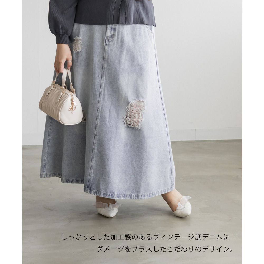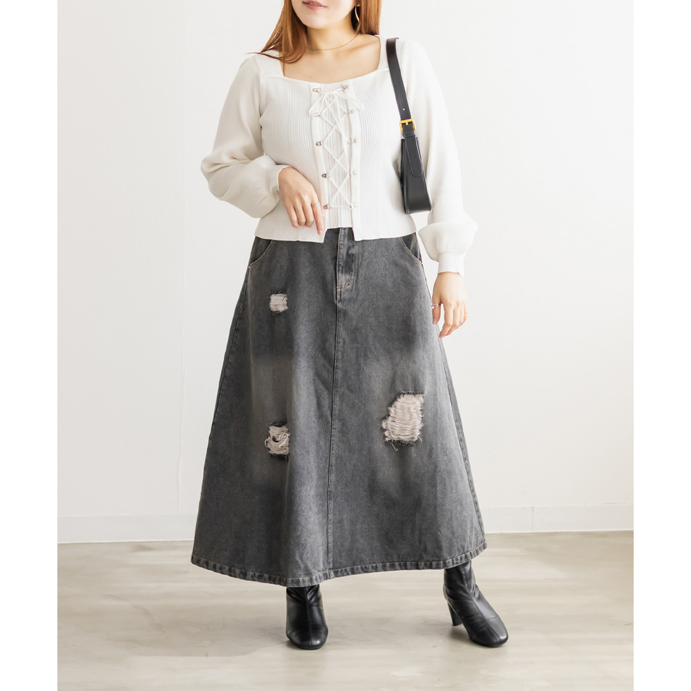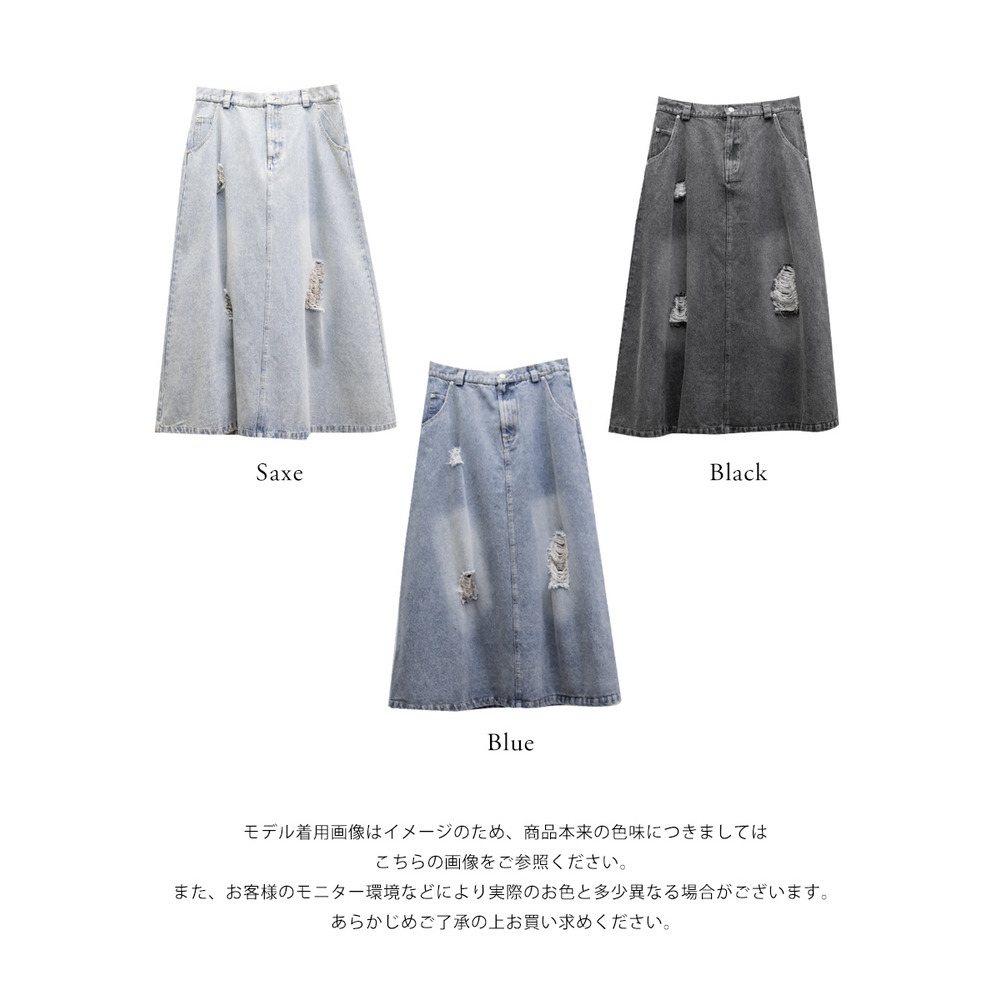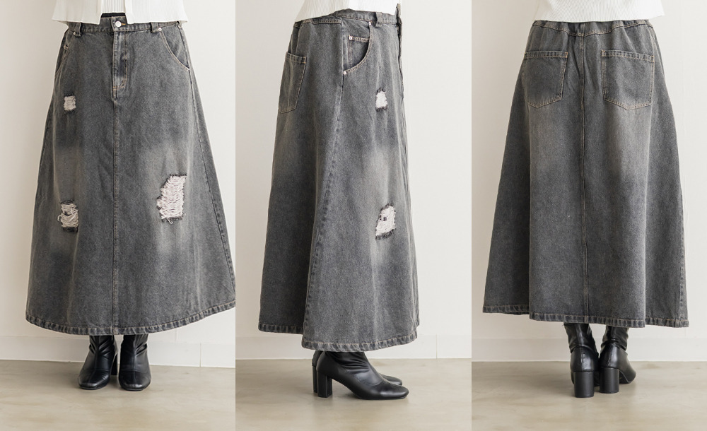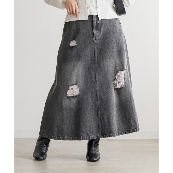 LLを着てちょうどいいサイズでした。ウエストは後ろゴムなのと、しっかり広がるフレアシルエットのおかげで窮屈感無く、ヒップや太ももは気にならず着用出来ました◎デニム素材だけど広がりが美しくて女性らしい印象にまとまります!ダメージ加工がこなれ感をプラスしてくれるので、シンプルなトップスを合わせるだけでおしゃれに決まります。ロング丈なのも大人っぽい印象で着られて、フェミニンにもカジュアルにも合わせられる汎用性の高い1枚です♪ |