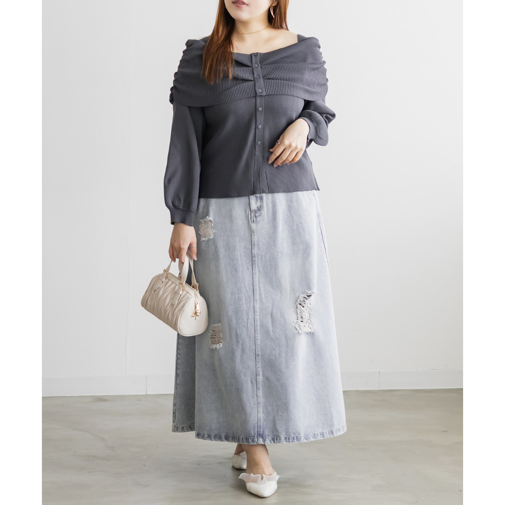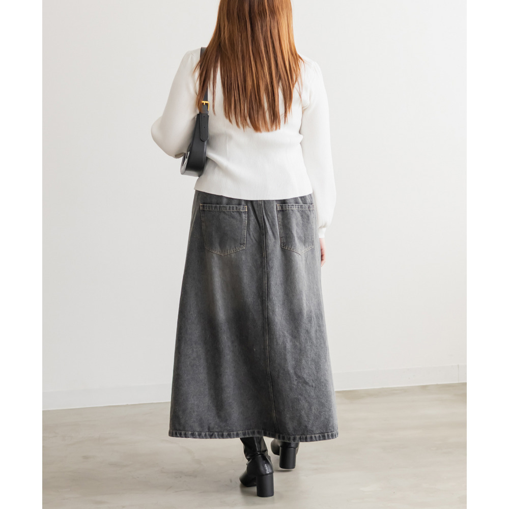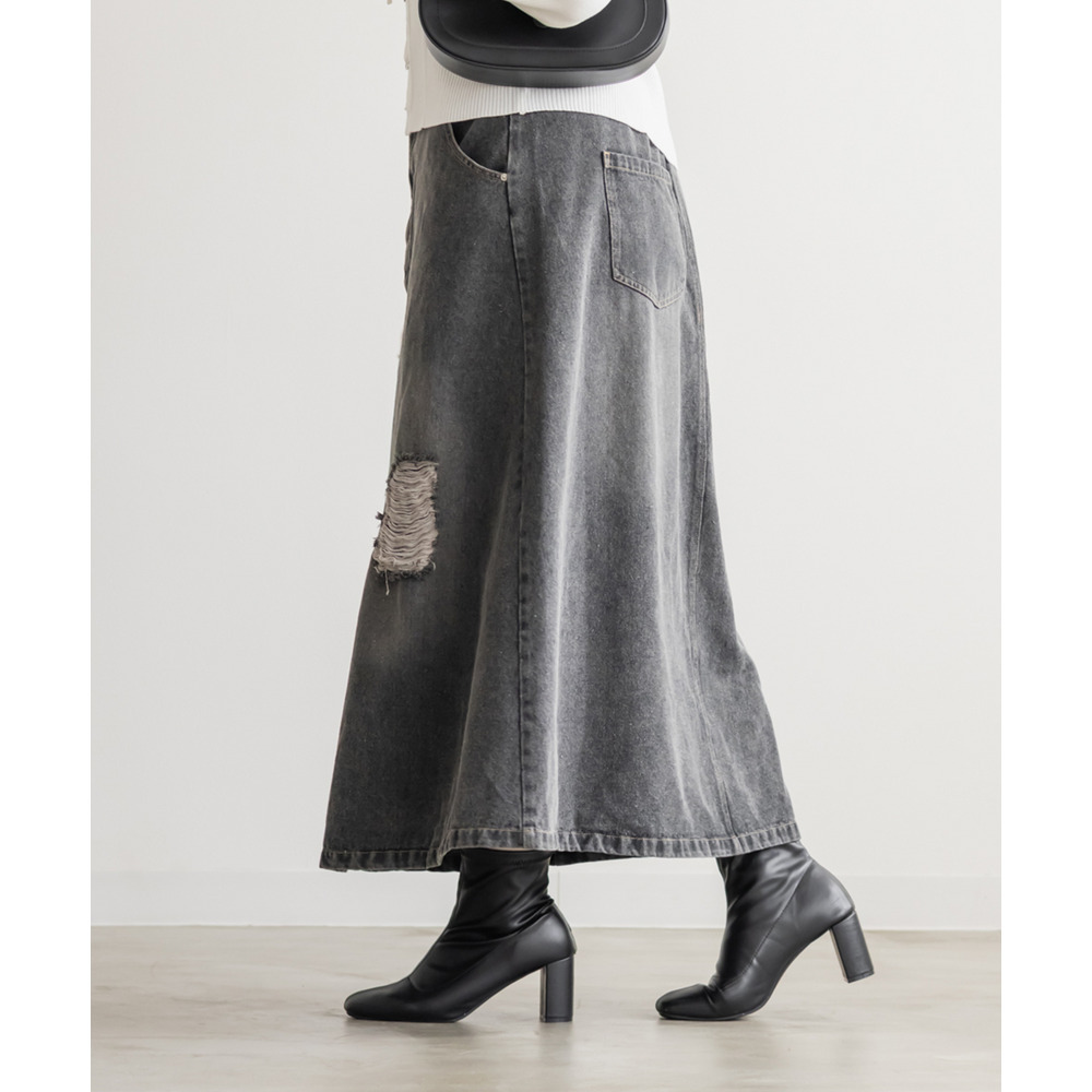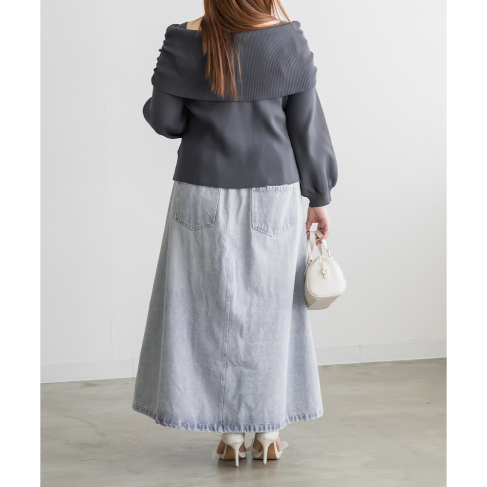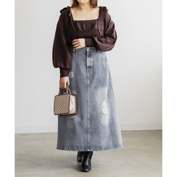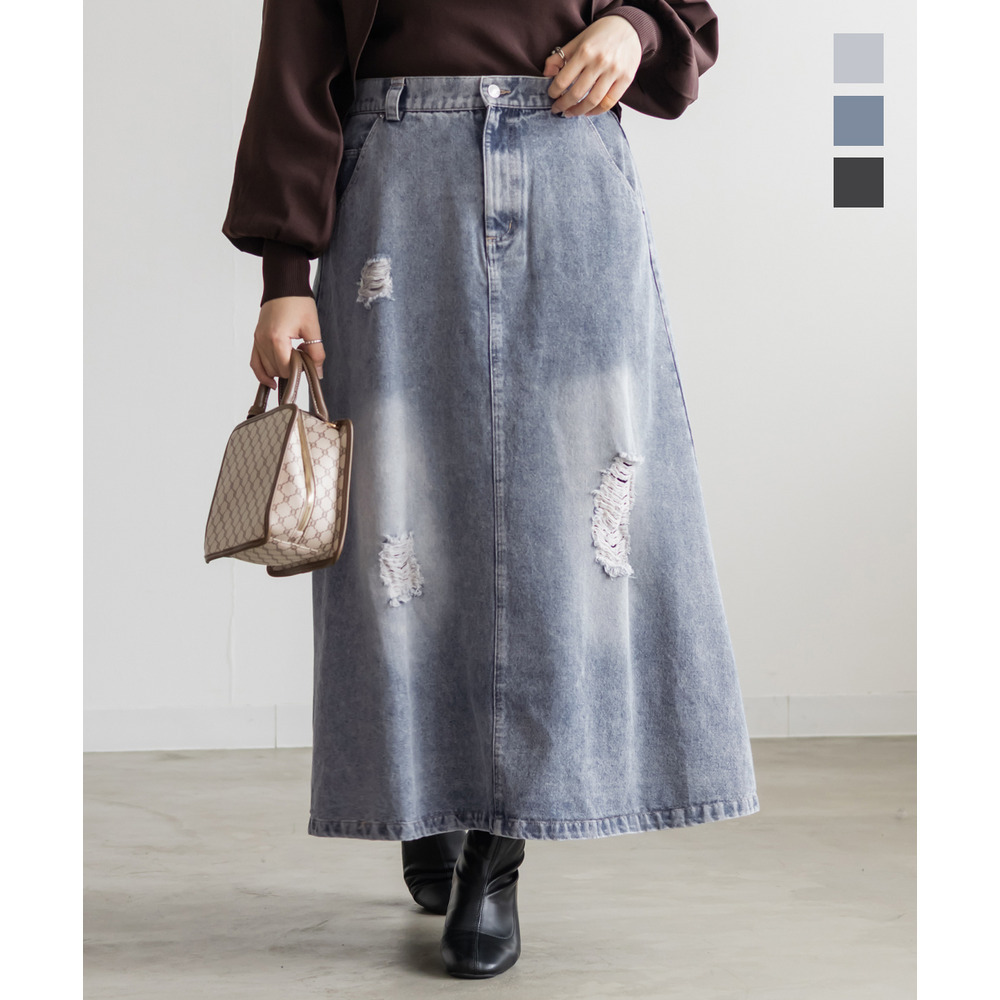 LLを着てちょうどいいサイズでした。ウエストは後ろゴムなのと、しっかり広がるフレアシルエットのおかげで窮屈感無く、ヒップや太ももは気にならず着用出来ました◎デニム素材だけど広がりが美しくて女性らしい印象にまとまります!ダメージ加工がこなれ感をプラスしてくれるので、シンプルなトップスを合わせるだけでおしゃれに決まります。ロング丈なのも大人っぽい印象で着られて、フェミニンにもカジュアルにも合わせられる汎用性の高い1枚です♪ |