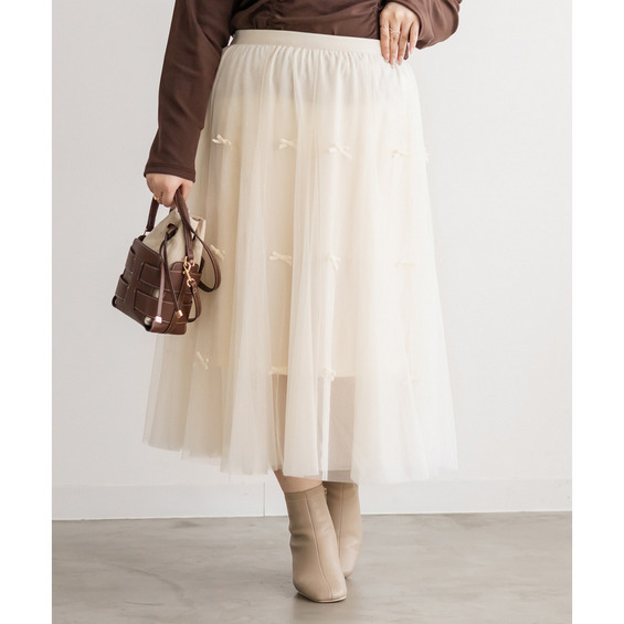 | 3Lを着てちょうどいいサイズ感でした。ウエストはゴムになっていて着心地ラクチン◎ひらひら軽い着心地のチュールにリボンあしらわれていて、ガーリーな1枚です♪フレアシルエットで広がりすぎないのでトップスを選ばずにすっきりと着用出来ます!オールシーズン着られるのでデートやお出かけにたくさん着回ししたいスカートです。 |