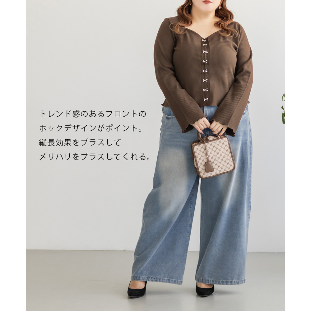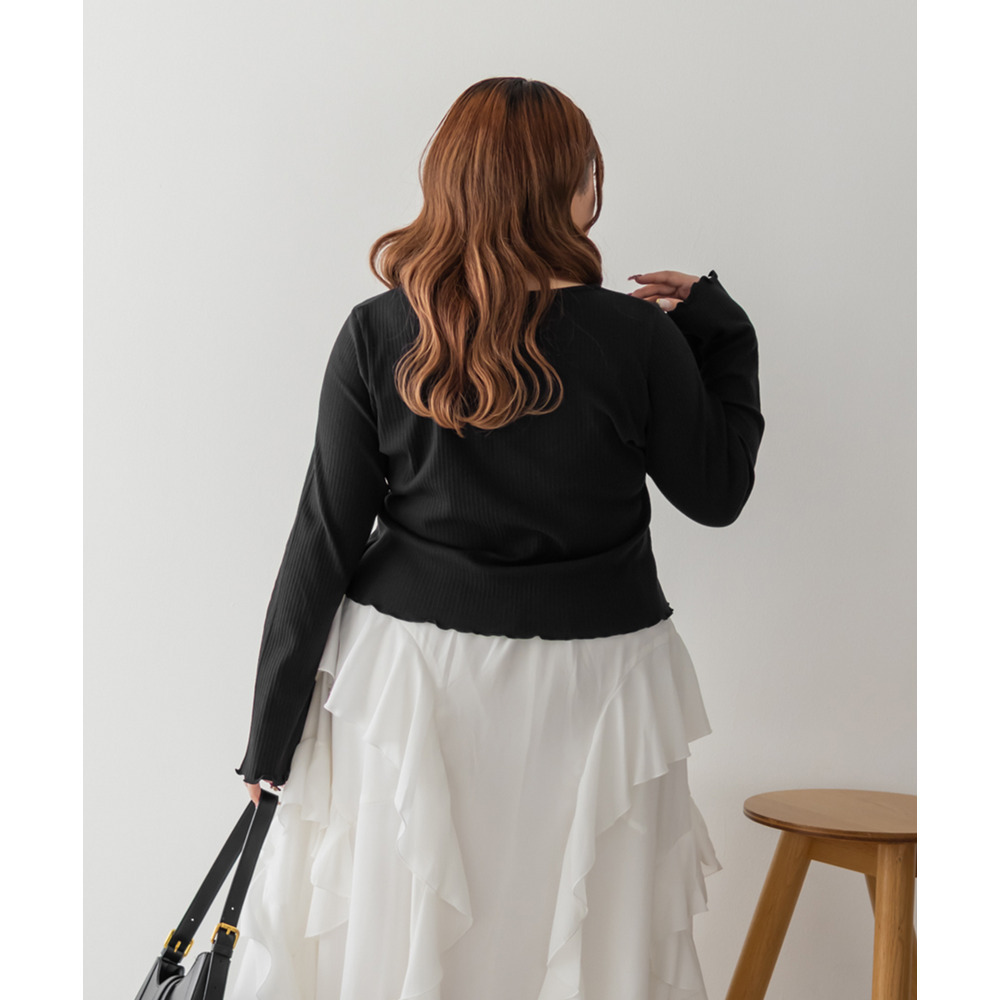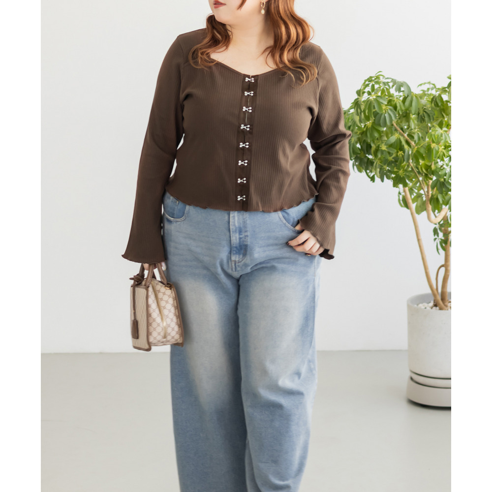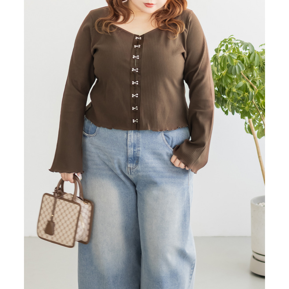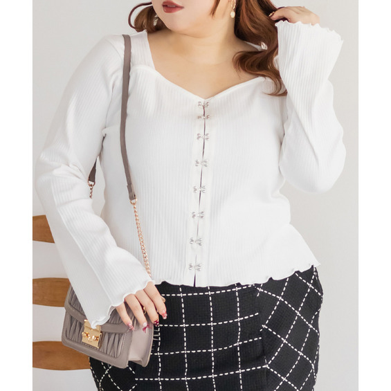 | 3Lサイズを着用してちょうどいいサイズ感でした。すっきりシルエットのトップスですが伸びのいいリブ仕様で窮屈感なく着られました!フロントホックがポイントで縦のラインが強調出来て着やせして見えます!ネックラインはさりげなくハートネックになっていて、デコルテが綺麗に見えるのと、カジュアルすぎずフェミニンにも合わせやすいデザインになっています◎丈感も絶妙でインしなくてもコーデしやすいのもポイントです!秋~春とながく使えるトップスなのであると便利な1枚です! |