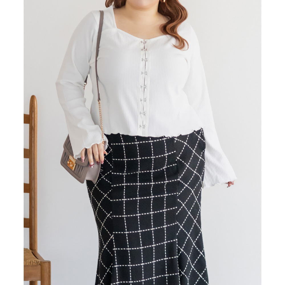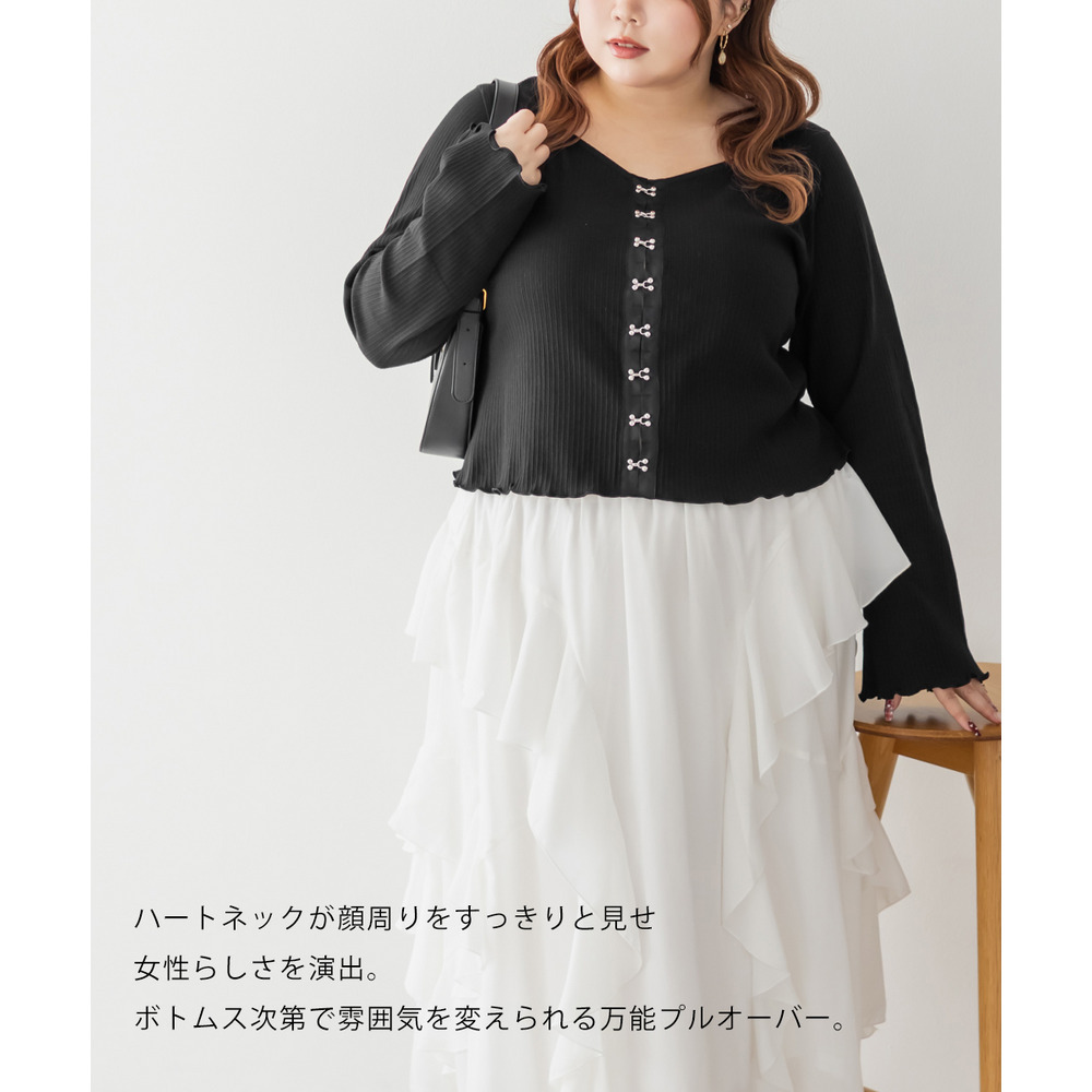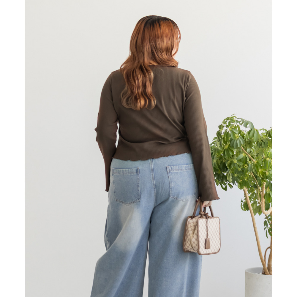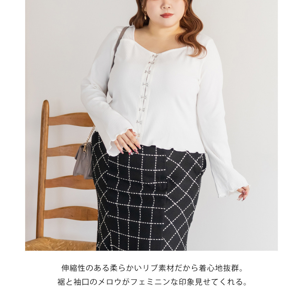 | 3Lサイズを着用してちょうどいいサイズ感でした。すっきりシルエットのトップスですが伸びのいいリブ仕様で窮屈感なく着られました!フロントホックがポイントで縦のラインが強調出来て着やせして見えます!ネックラインはさりげなくハートネックになっていて、デコルテが綺麗に見えるのと、カジュアルすぎずフェミニンにも合わせやすいデザインになっています◎丈感も絶妙でインしなくてもコーデしやすいのもポイントです!秋~春とながく使えるトップスなのであると便利な1枚です! |