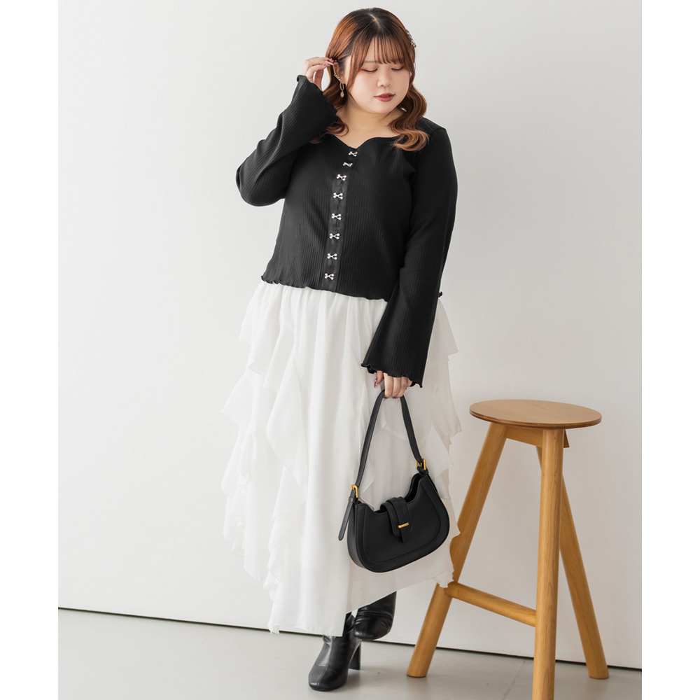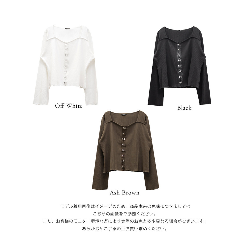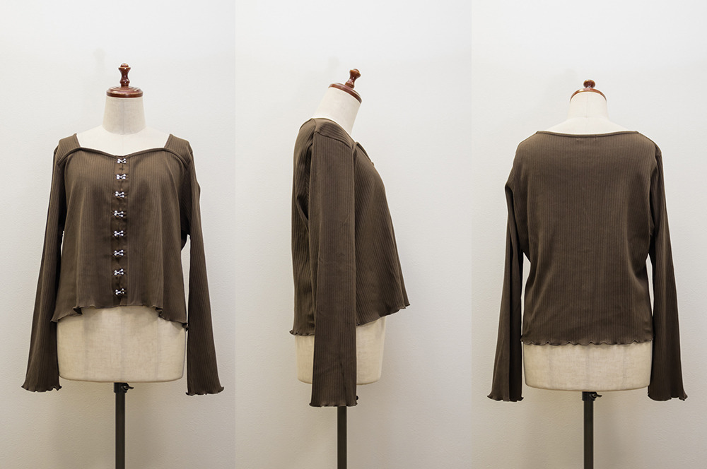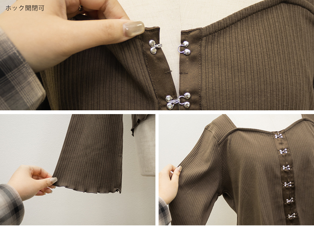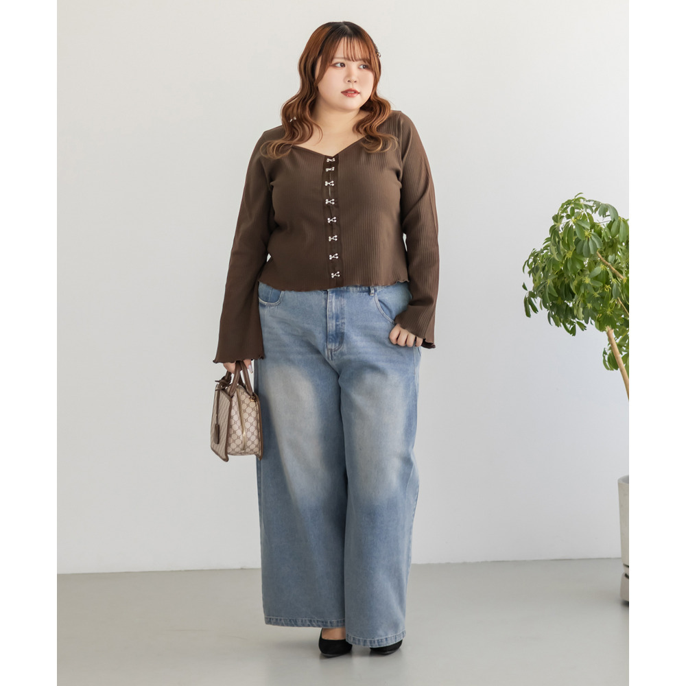 | 3Lサイズを着用してちょうどいいサイズ感でした。すっきりシルエットのトップスですが伸びのいいリブ仕様で窮屈感なく着られました!フロントホックがポイントで縦のラインが強調出来て着やせして見えます!ネックラインはさりげなくハートネックになっていて、デコルテが綺麗に見えるのと、カジュアルすぎずフェミニンにも合わせやすいデザインになっています◎丈感も絶妙でインしなくてもコーデしやすいのもポイントです!秋~春とながく使えるトップスなのであると便利な1枚です! |
