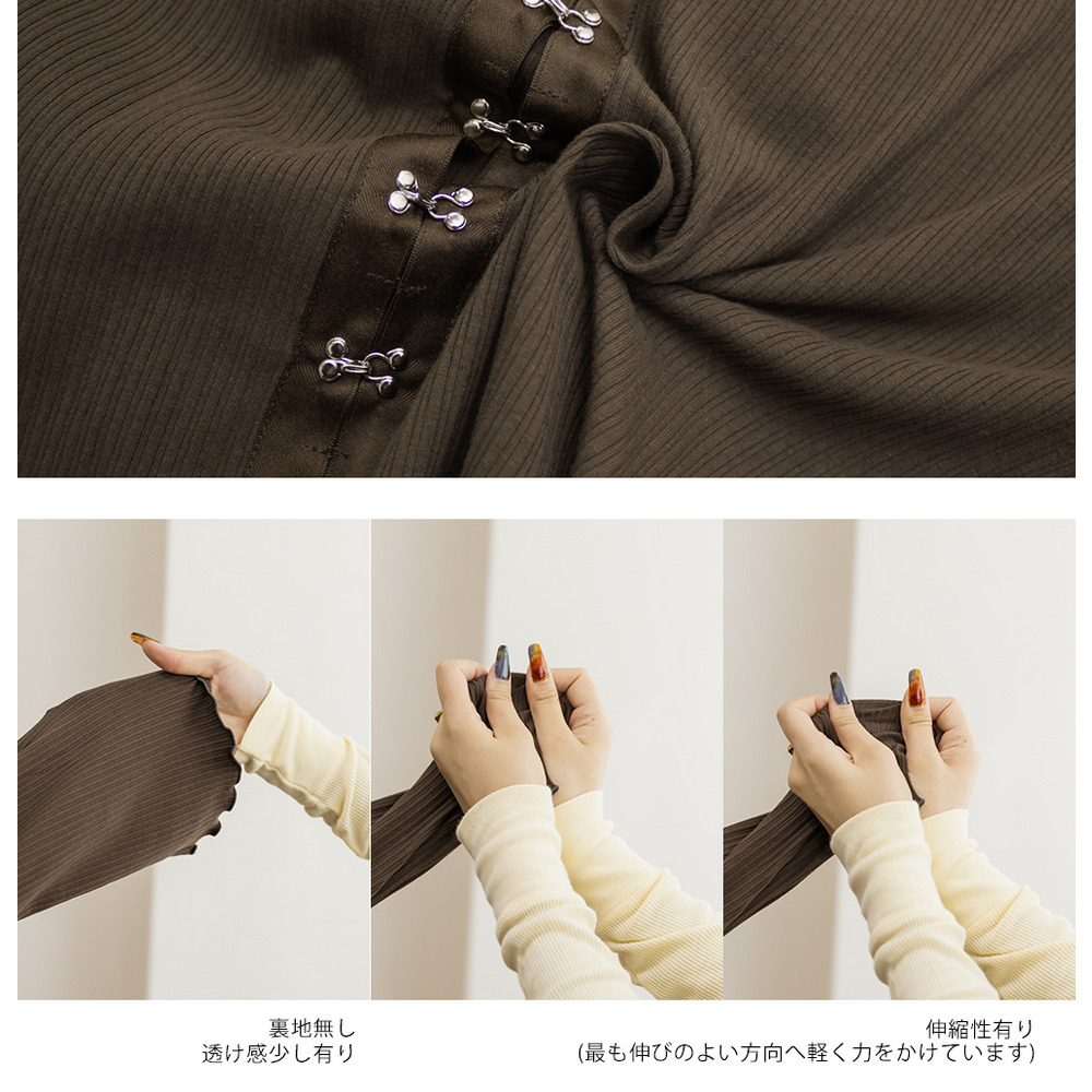 | 素材 | ■素材 綿93%、ポリウレタン7% ■裏地・透け感・伸縮性 裏地無し、透け感少し有り、伸縮性有り ■ポケット 無し ■生地感 伸縮性があり肌触りの良いカットソー素材です。 |