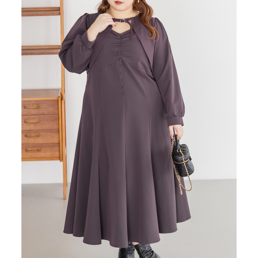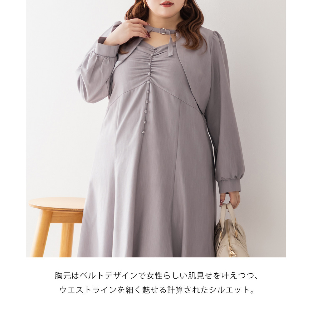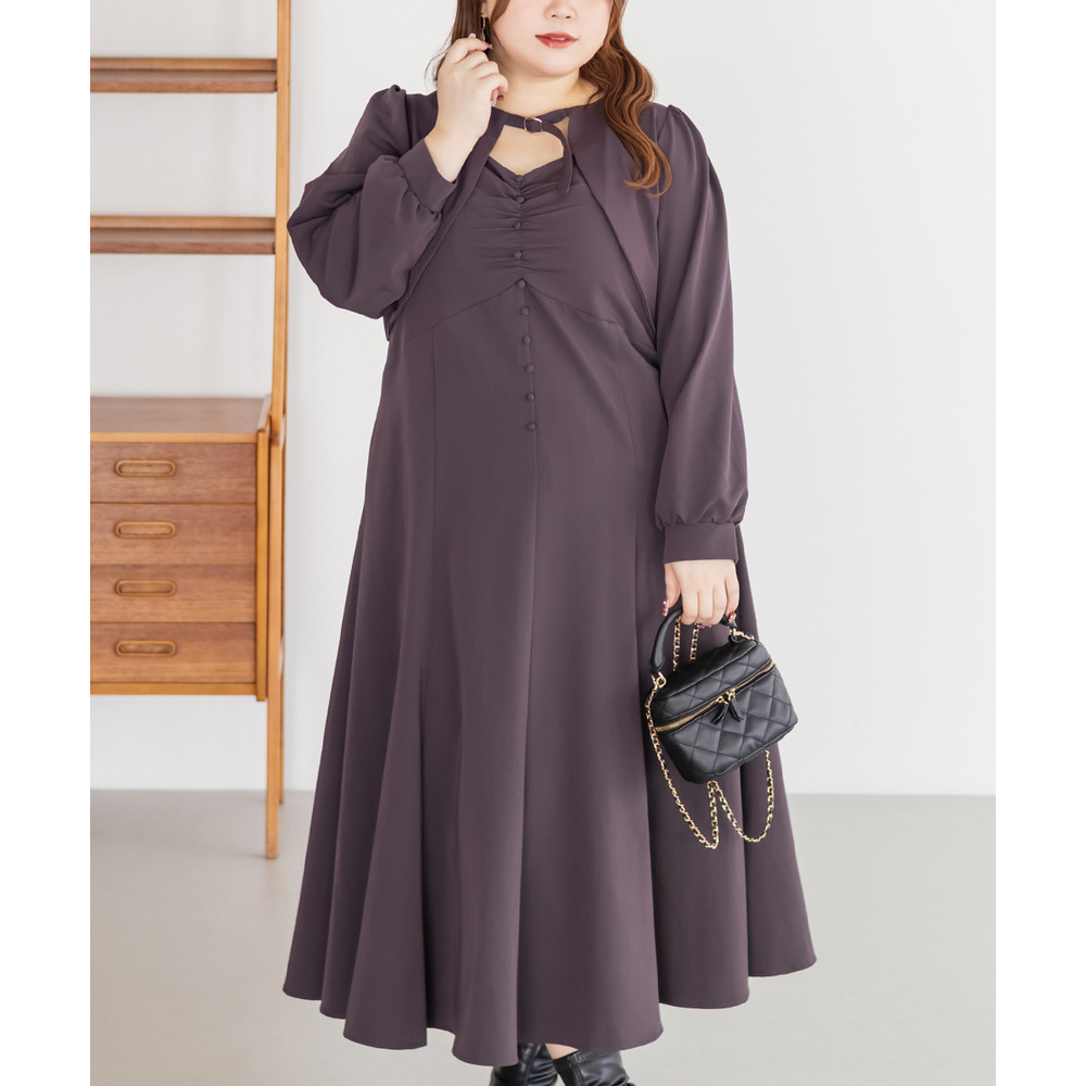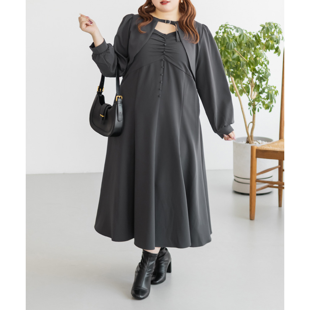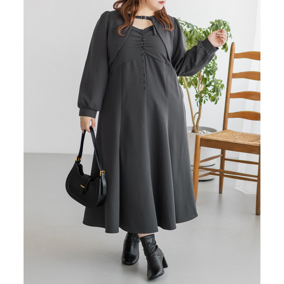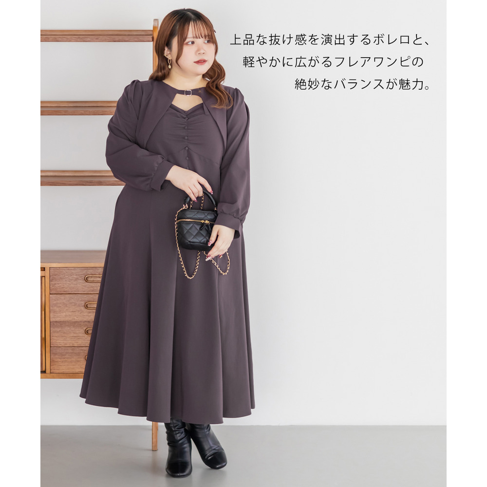 3Lサイズを着用していつも通りのサイズ選びで問題なさそうでした。ワンピースは後ろゴム仕様で窮屈感がなく、1日中ラクに着られます。ボレロのベルトデザインが顔回りにメリハリを出してくれて、シャープな印象でした。キャミワンピ・ボレロともに単品でも使いやすく、シーズンレスで活躍します♪ふんわりとした袖やフレアシルエットが女性らしく、スタイルアップ効果も抜群です◎お出かけやデート・特別なシーンにも着ていきたい映えアイテムです!