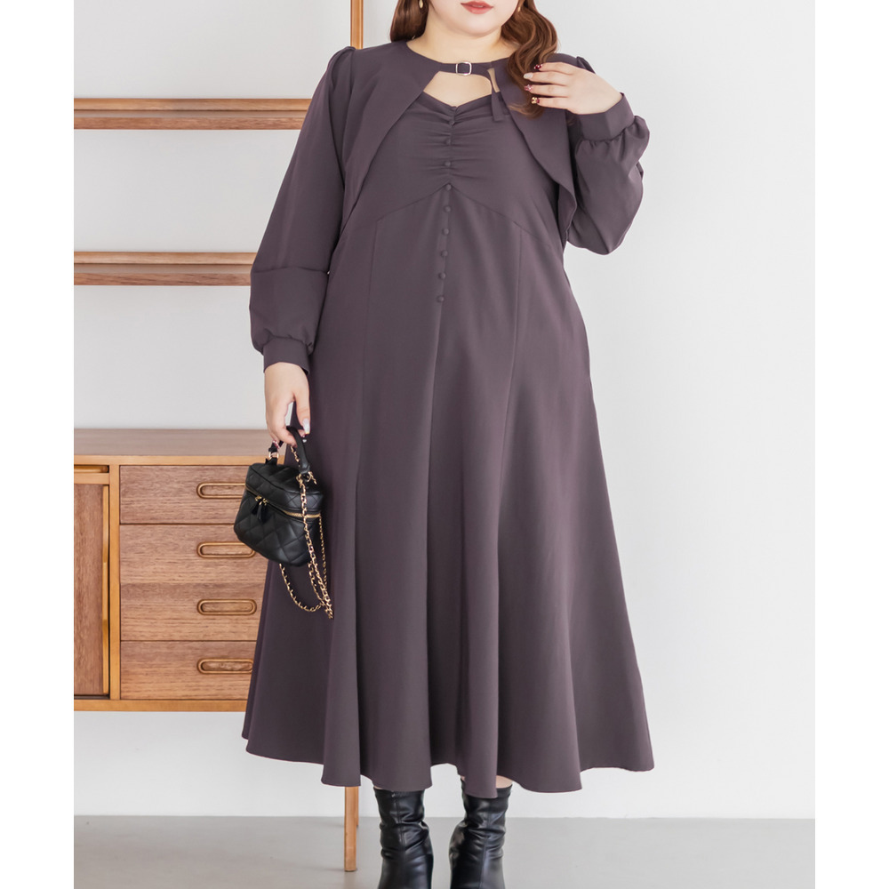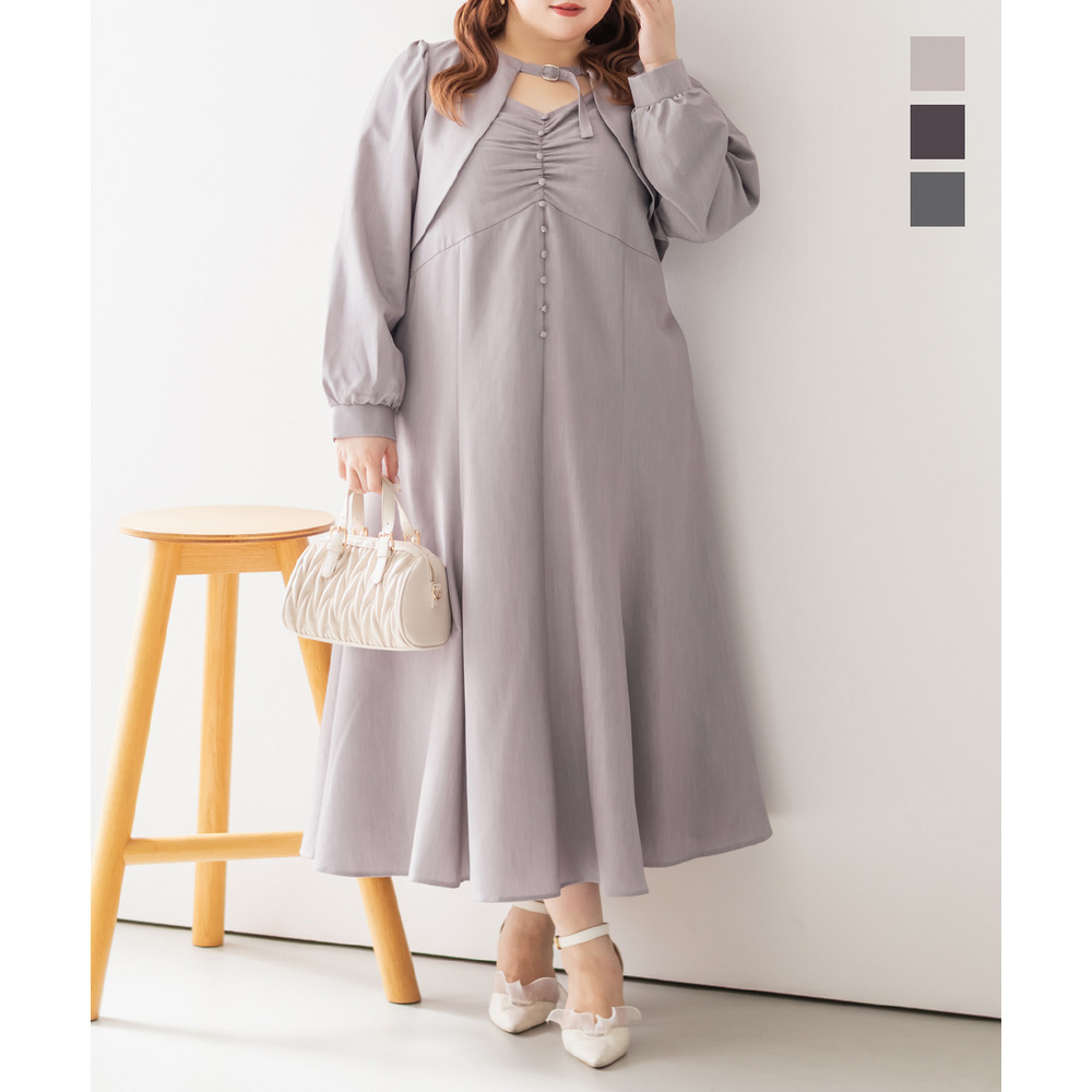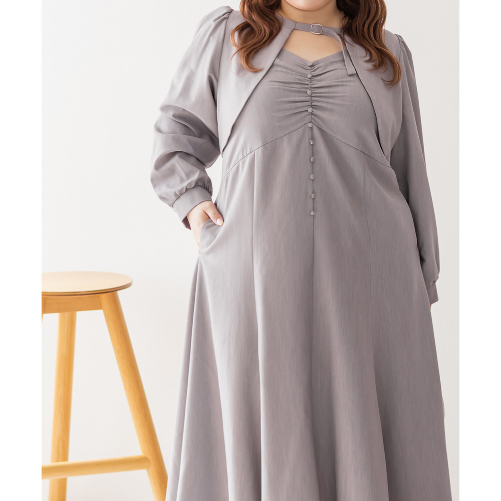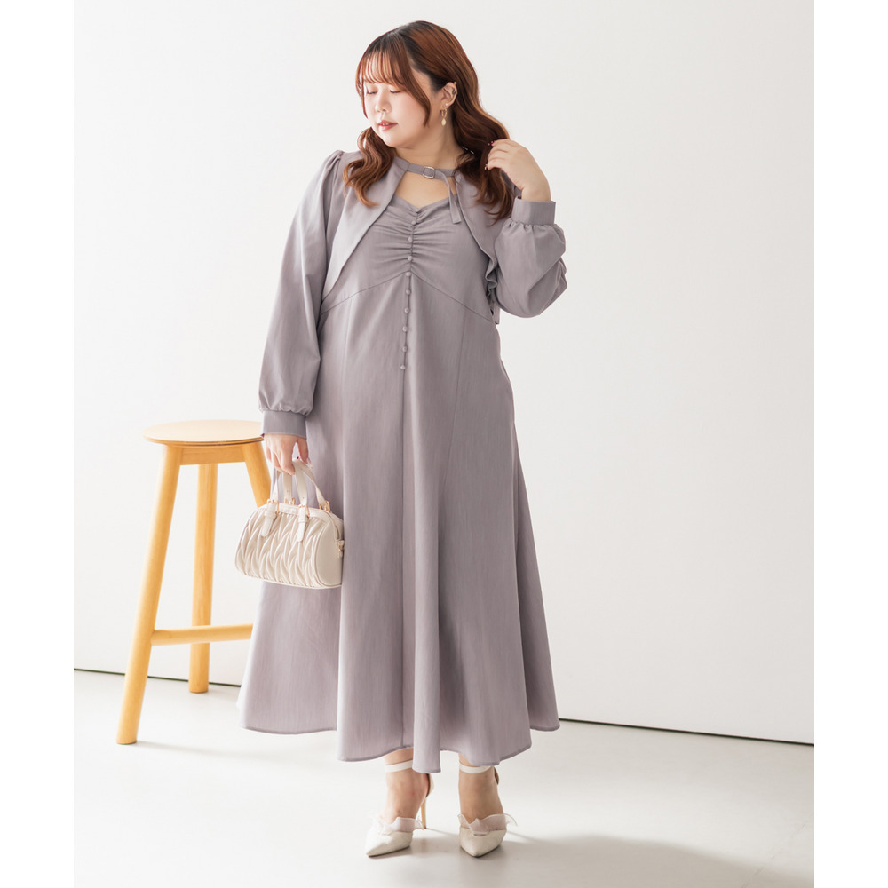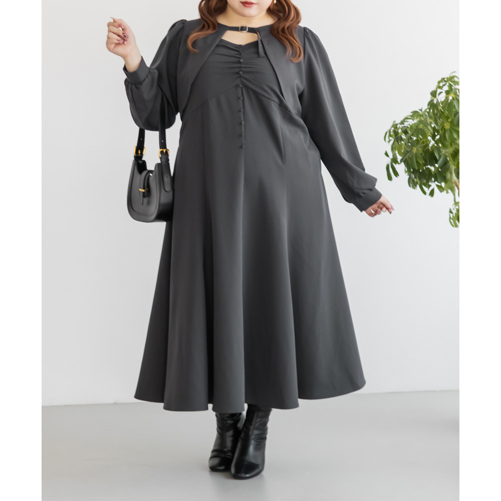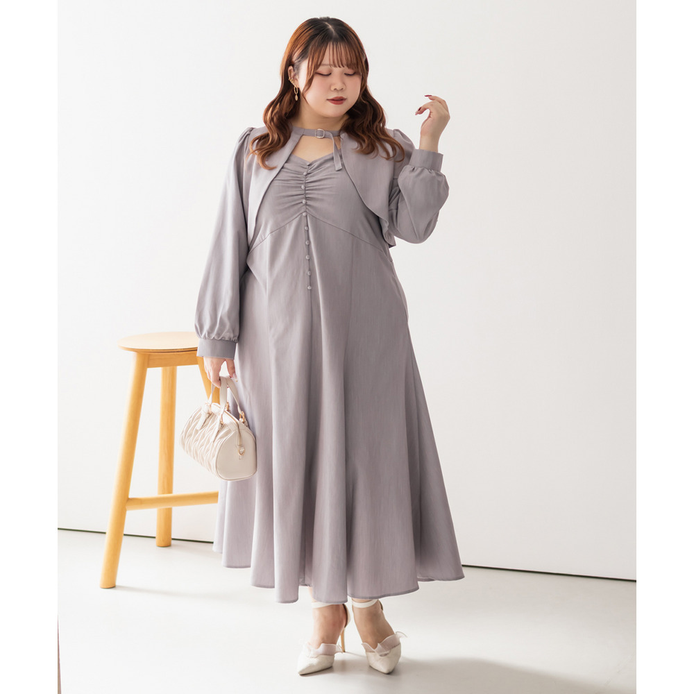 3Lサイズを着用していつも通りのサイズ選びで問題なさそうでした。ワンピースは後ろゴム仕様で窮屈感がなく、1日中ラクに着られます。ボレロのベルトデザインが顔回りにメリハリを出してくれて、シャープな印象でした。キャミワンピ・ボレロともに単品でも使いやすく、シーズンレスで活躍します♪ふんわりとした袖やフレアシルエットが女性らしく、スタイルアップ効果も抜群です◎お出かけやデート・特別なシーンにも着ていきたい映えアイテムです!