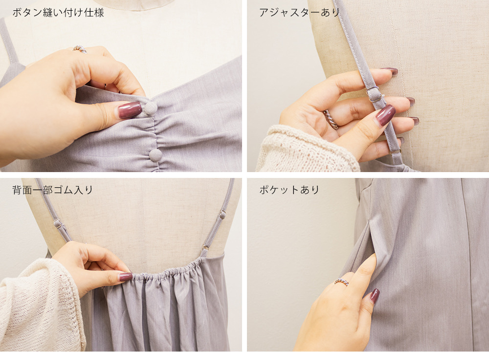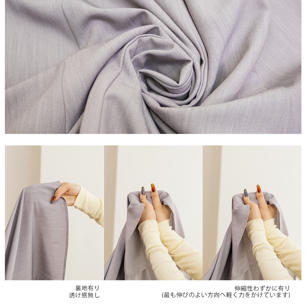 素材 ■素材 【本体】ポリエステル70%、レーヨン25%、ポリウレタン5%、【裏地】ポリエステル100% ■裏地・透け感・伸縮性 裏地有り、透け感無し、伸縮性わずかに有り ■ポケット 有り ■生地感 程よくしっかりとしたキレイめな素材です。 ※ボレロ、キャミワンピースの上身頃部分のみ伸縮性のある柔らかな裏地付き