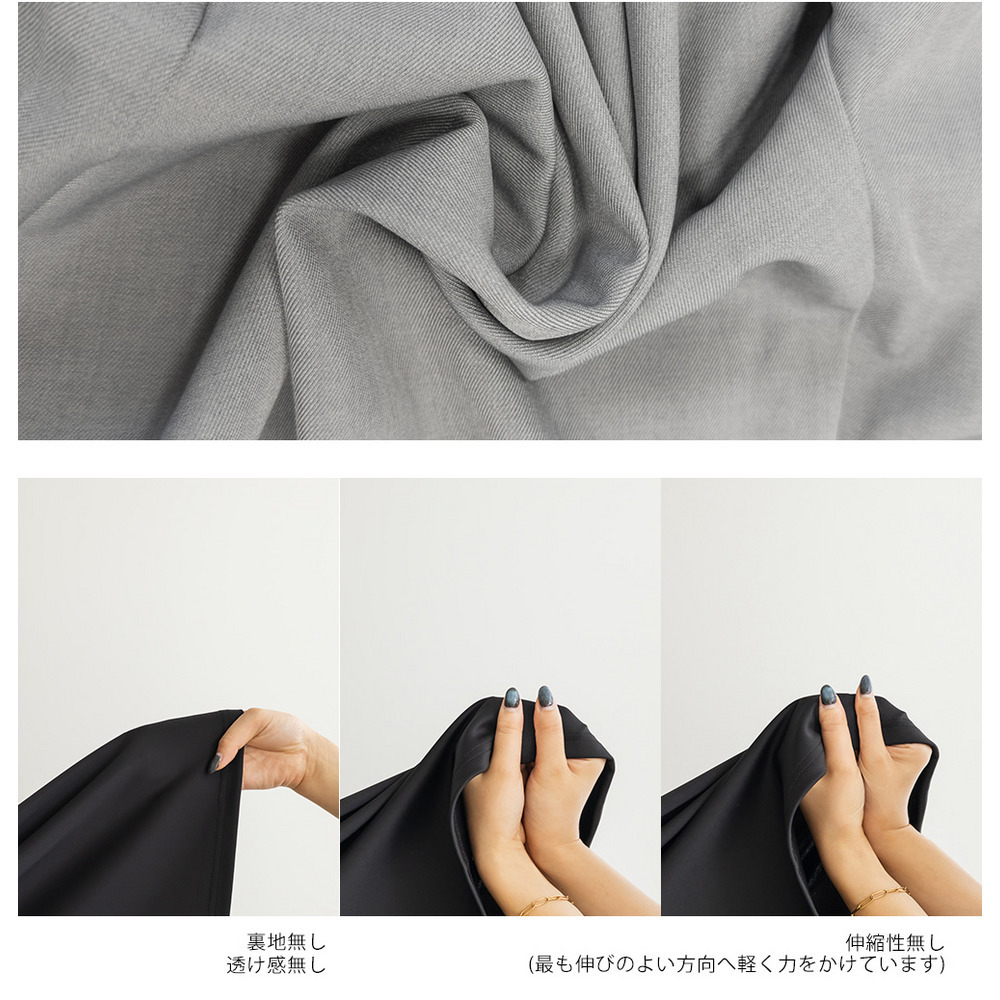 | 素材 | ■素材 ポリエステル97%、ポリウレタン3% ■裏地・透け感・伸縮性 裏地無し、透け感無し、伸縮性無し ■ポケット 有り ■生地感 ハリ感のあるさらっとした軽い素材です。 |
