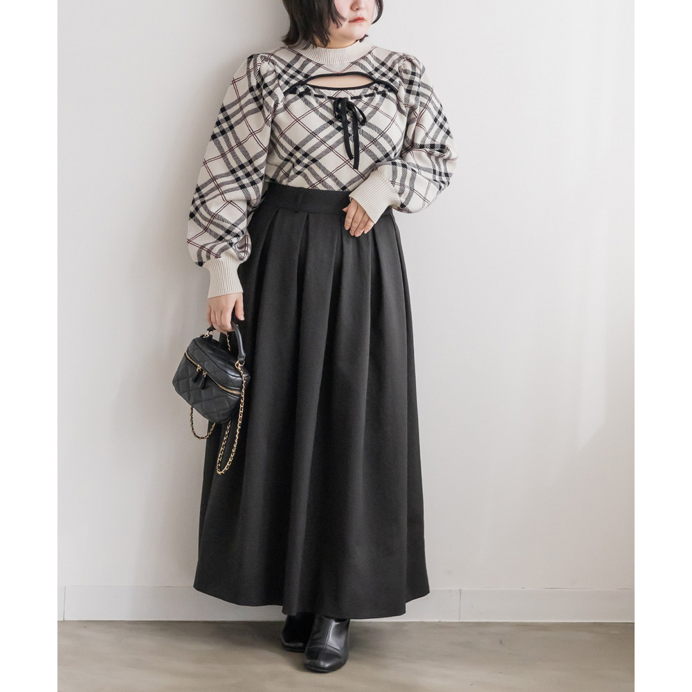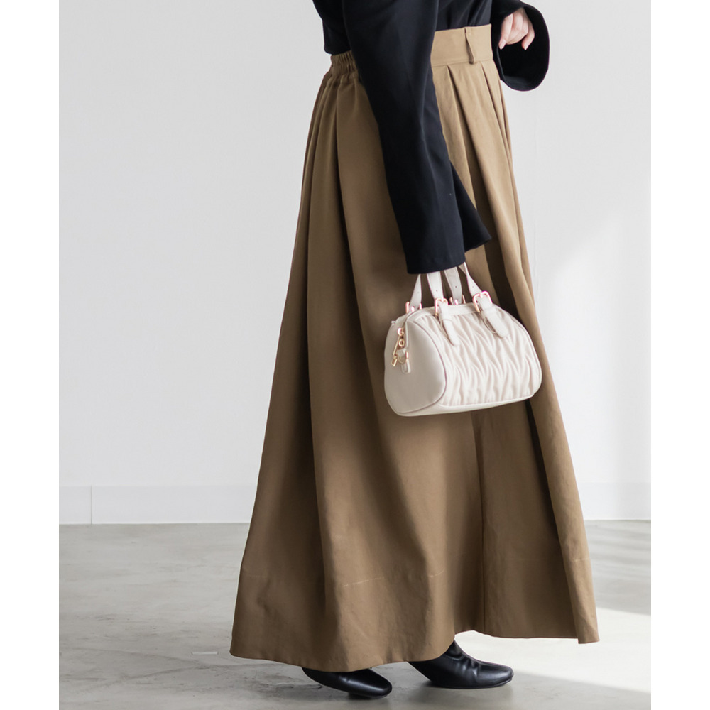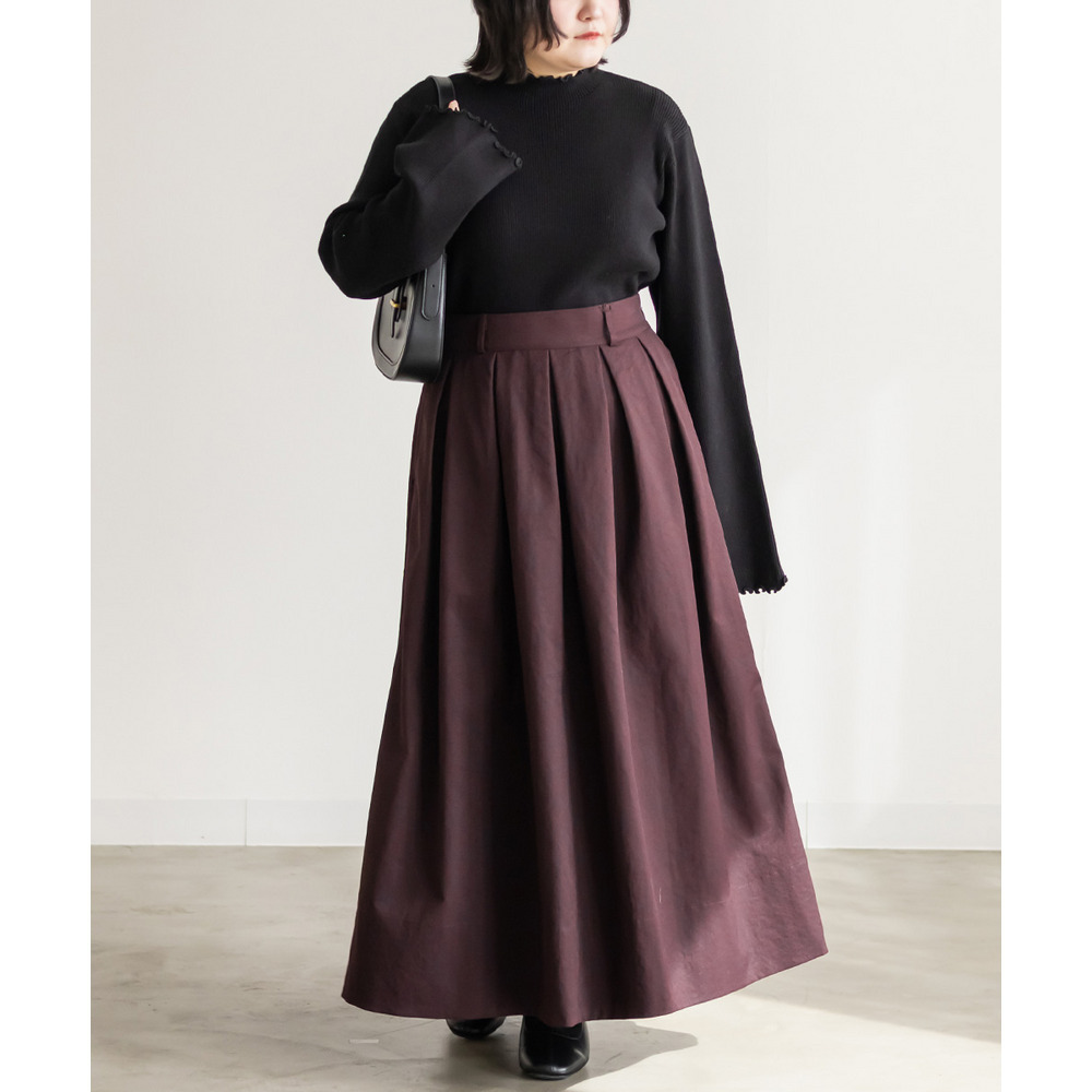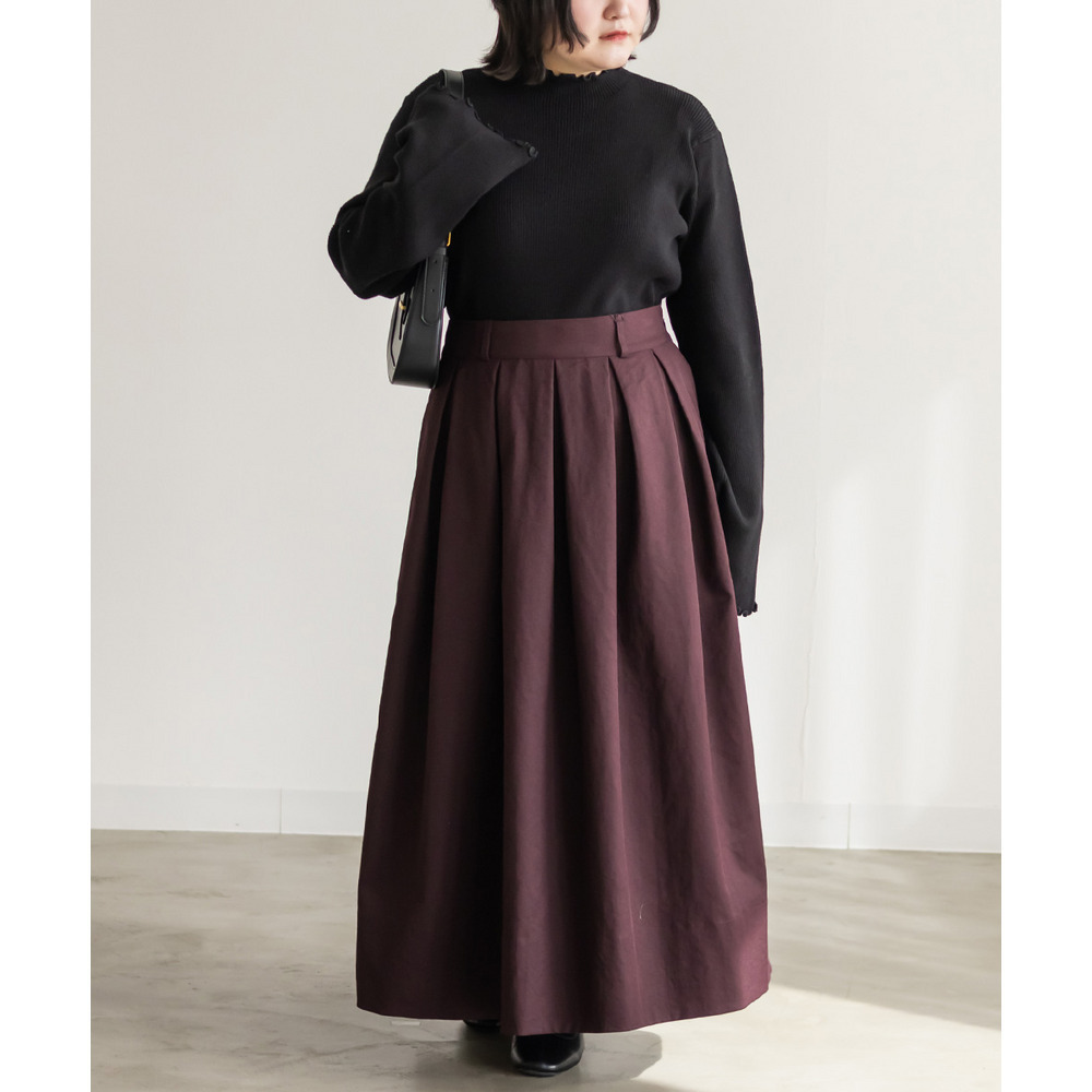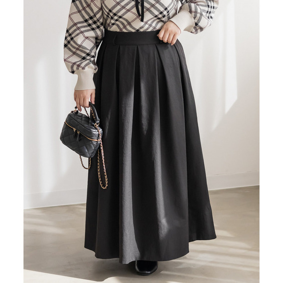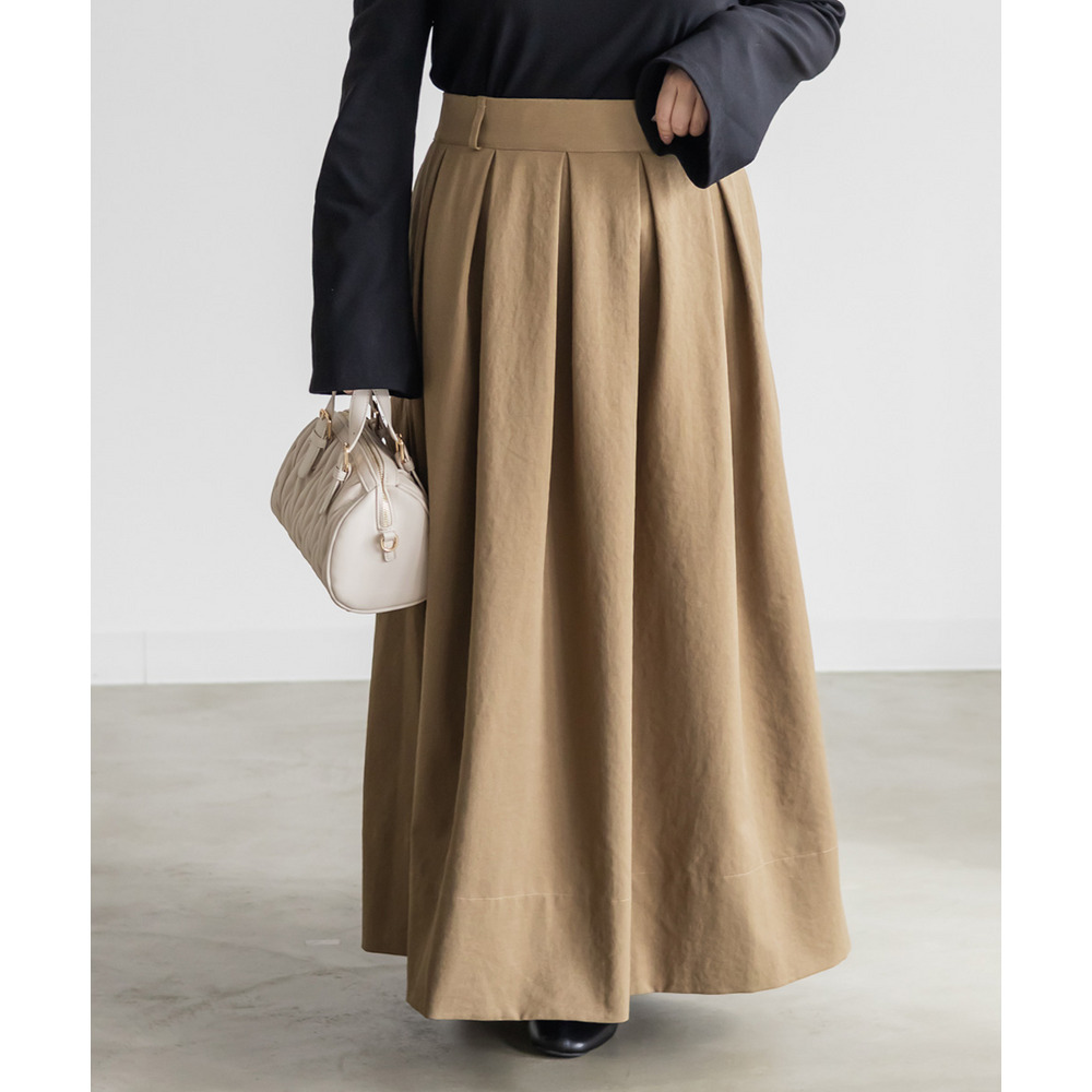 LLサイズを着用してぴったりの着心地でした。ウエストは巾広い後ろゴム仕様なので窮屈感のない着心地です◎ファスナーもついているので着脱もらくちん♪たっぷりとしたタックがお腹やお尻をすっぽりカバーしてくれて、ウエストをしっかりキュッと引き締めてくれるデザインです。お腹周りはフレアシルエットがすっきりとカバーしてくれるので華奢見えが叶います♪たっぷりの生地感が歩くたびにゆれて女性らしく綺麗なシルエットです!今っぽいデザインのスカートでオールシーズン使えるのも高ポイントです。