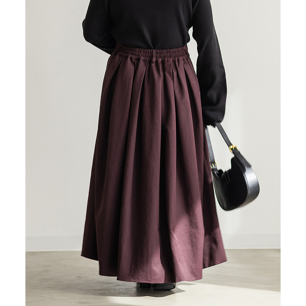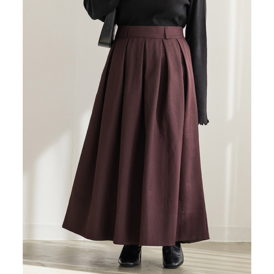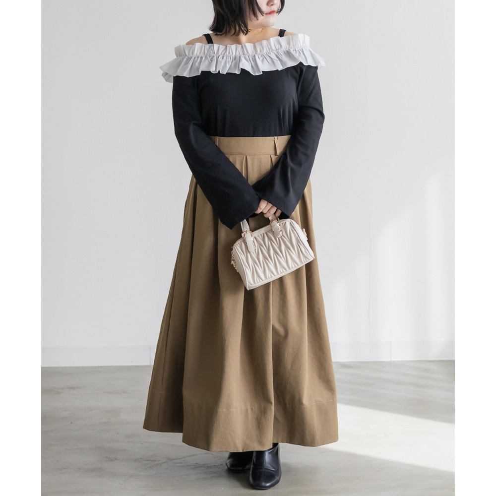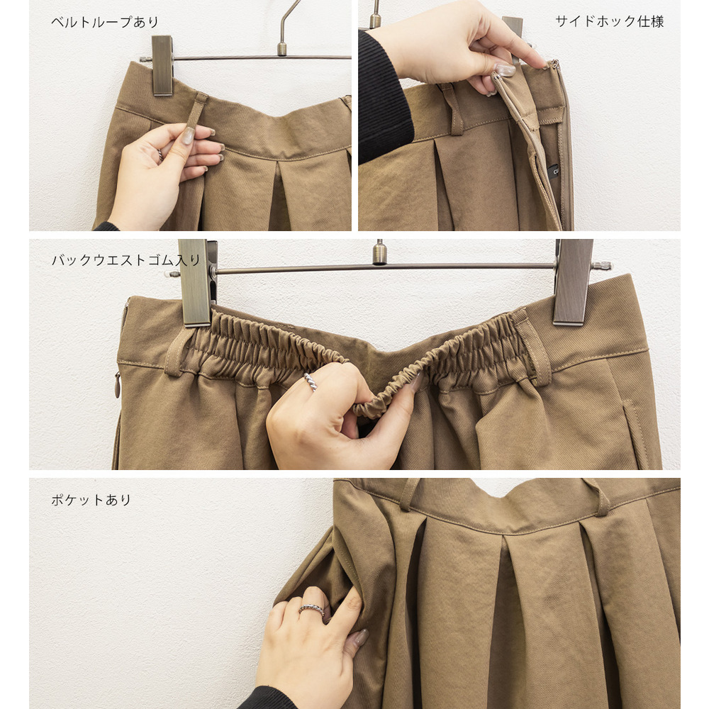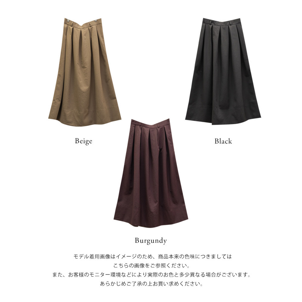 LLサイズを着用してぴったりの着心地でした。ウエストは巾広い後ろゴム仕様なので窮屈感のない着心地です◎ファスナーもついているので着脱もらくちん♪たっぷりとしたタックがお腹やお尻をすっぽりカバーしてくれて、ウエストをしっかりキュッと引き締めてくれるデザインです。お腹周りはフレアシルエットがすっきりとカバーしてくれるので華奢見えが叶います♪たっぷりの生地感が歩くたびにゆれて女性らしく綺麗なシルエットです!今っぽいデザインのスカートでオールシーズン使えるのも高ポイントです。