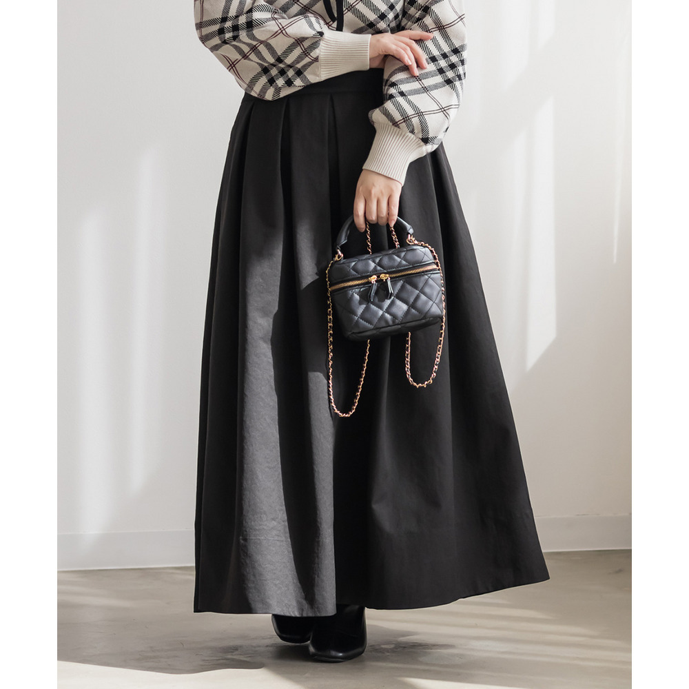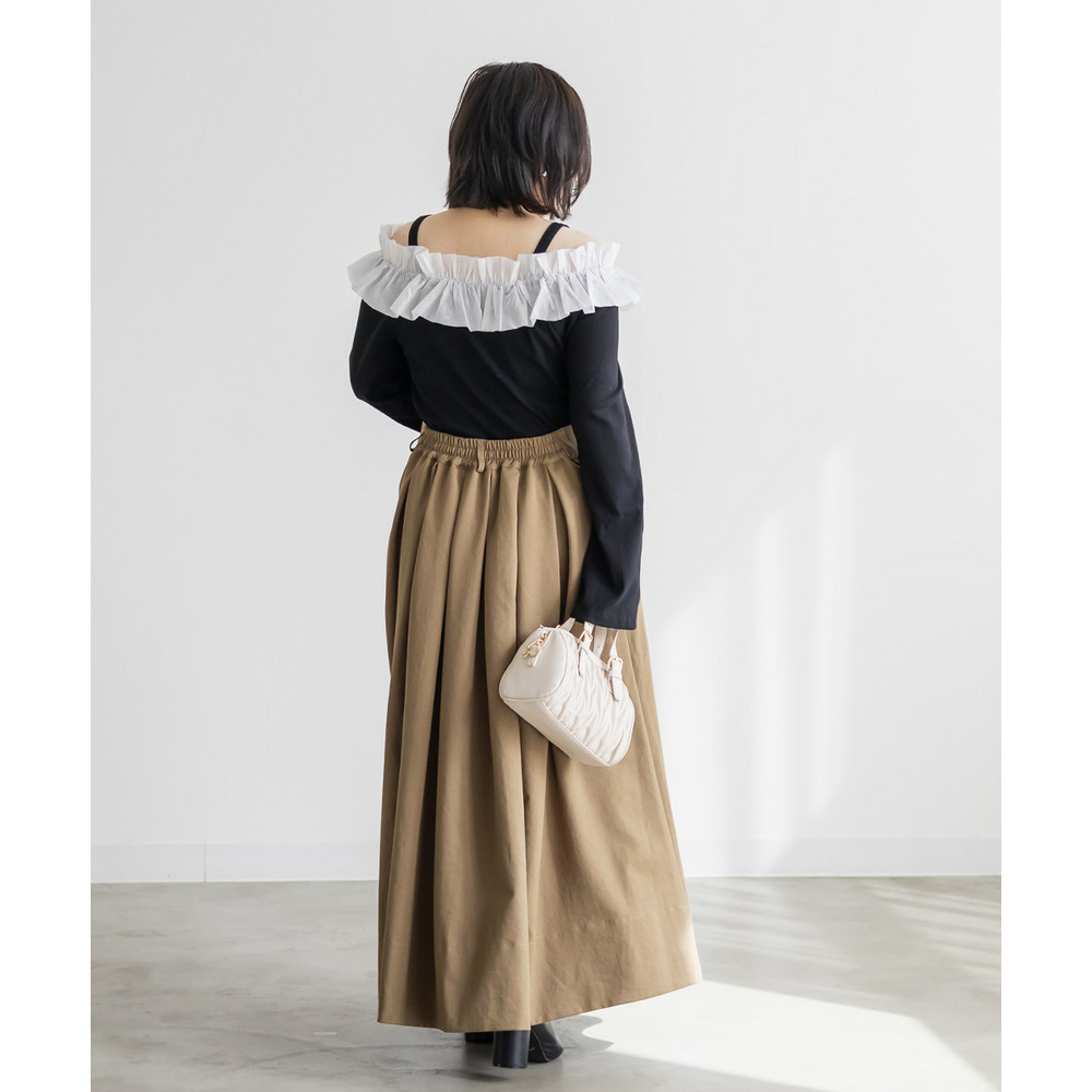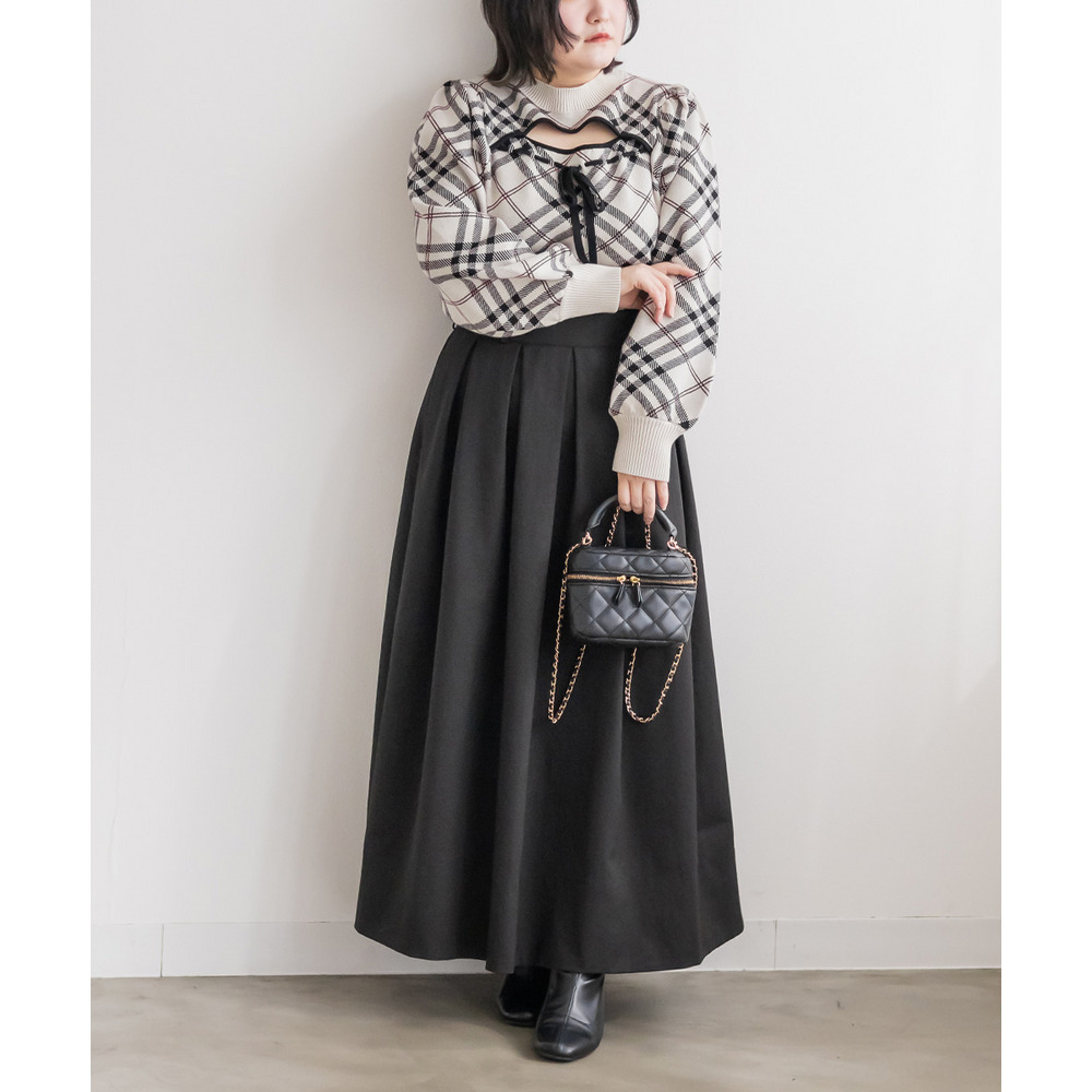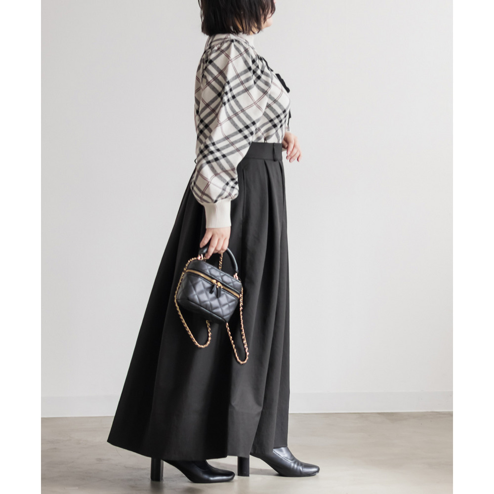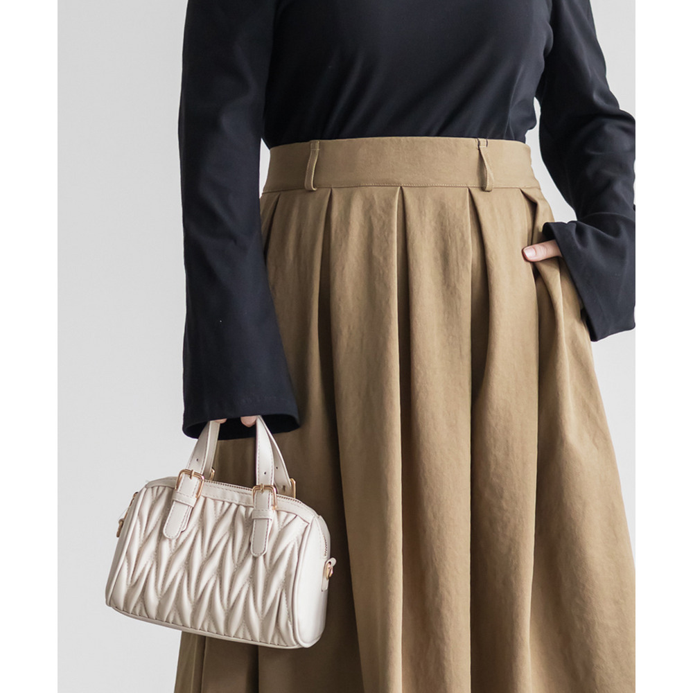 LLサイズを着用してぴったりの着心地でした。ウエストは巾広い後ろゴム仕様なので窮屈感のない着心地です◎ファスナーもついているので着脱もらくちん♪たっぷりとしたタックがお腹やお尻をすっぽりカバーしてくれて、ウエストをしっかりキュッと引き締めてくれるデザインです。お腹周りはフレアシルエットがすっきりとカバーしてくれるので華奢見えが叶います♪たっぷりの生地感が歩くたびにゆれて女性らしく綺麗なシルエットです!今っぽいデザインのスカートでオールシーズン使えるのも高ポイントです。