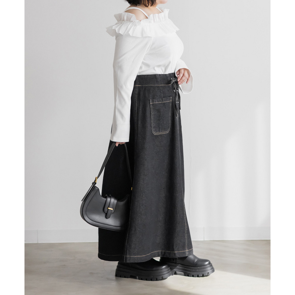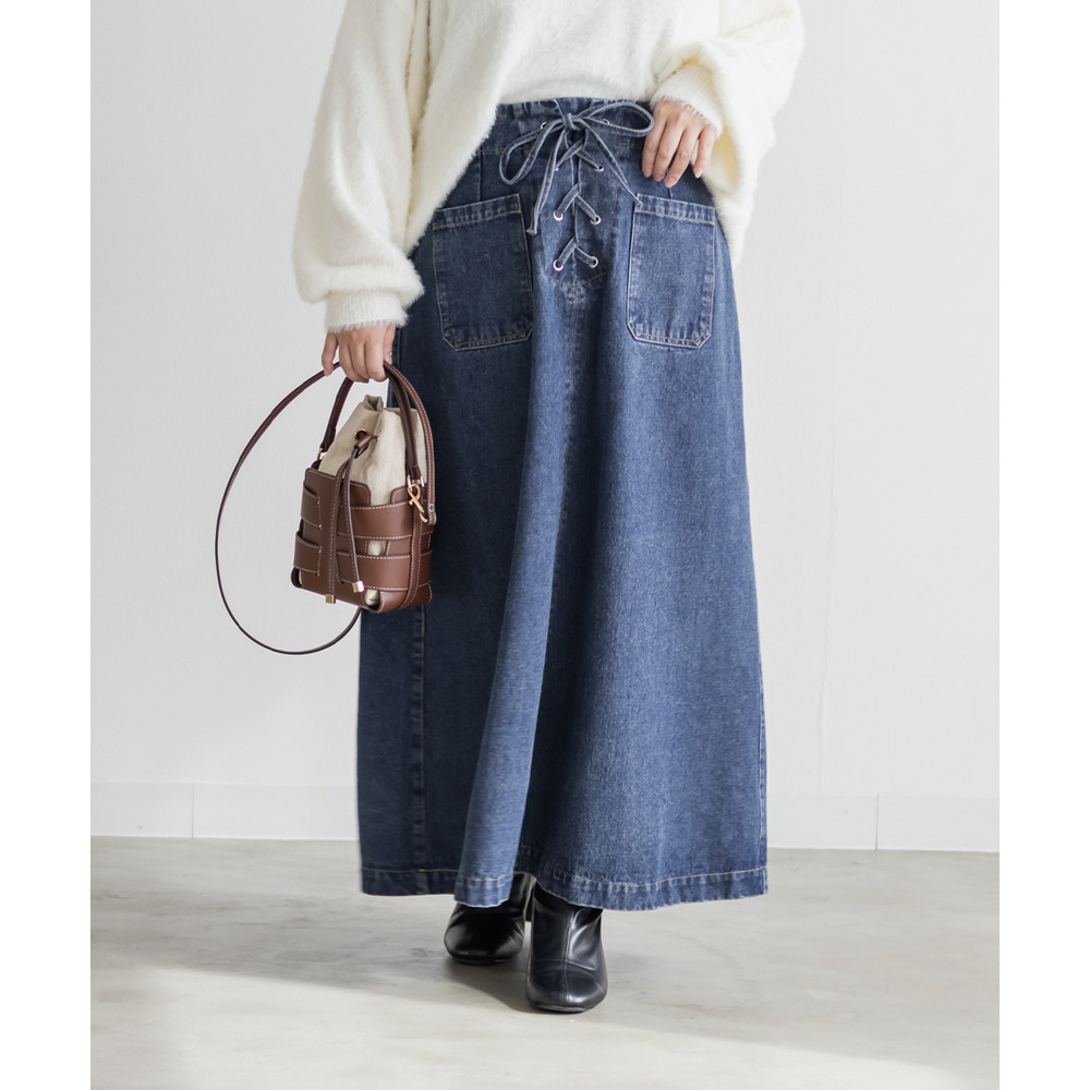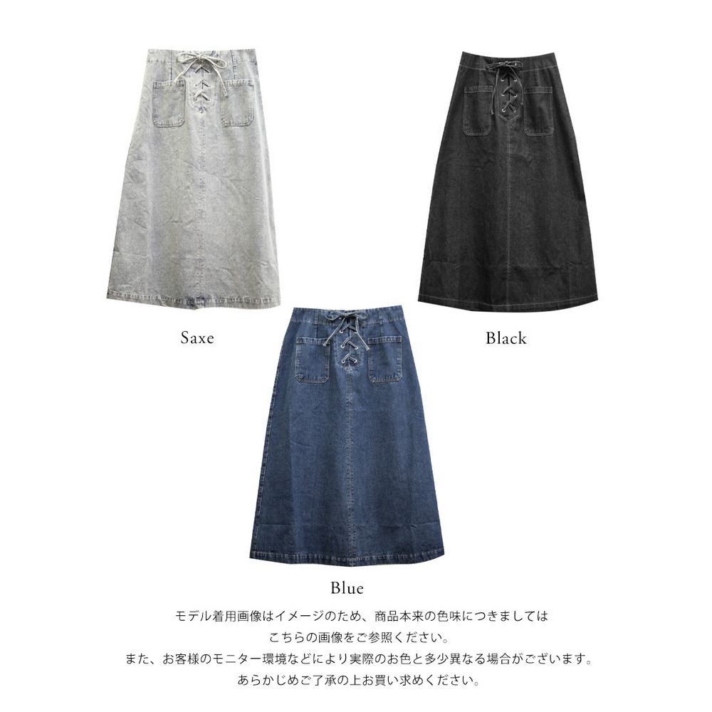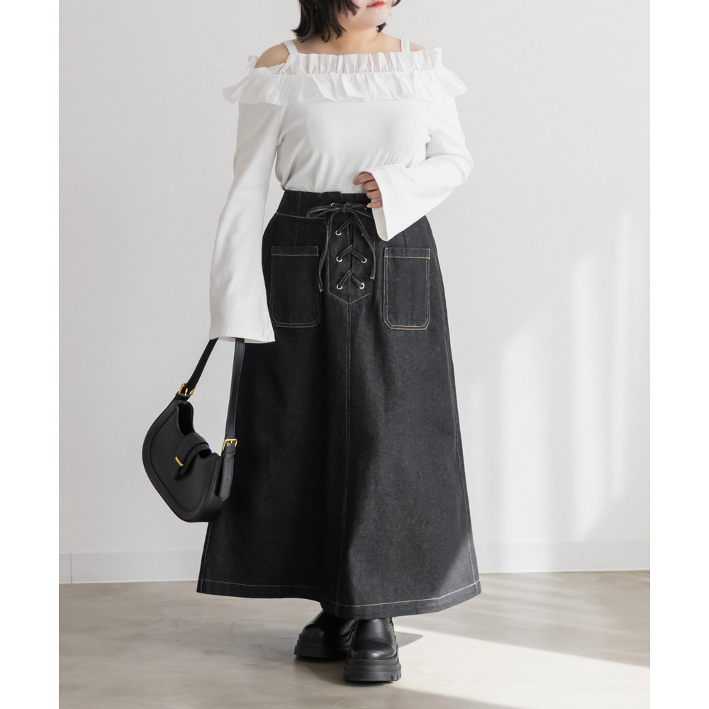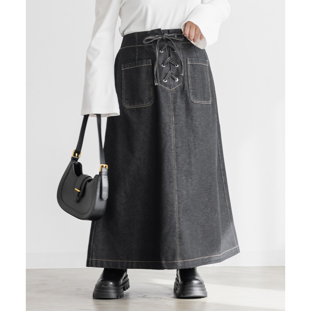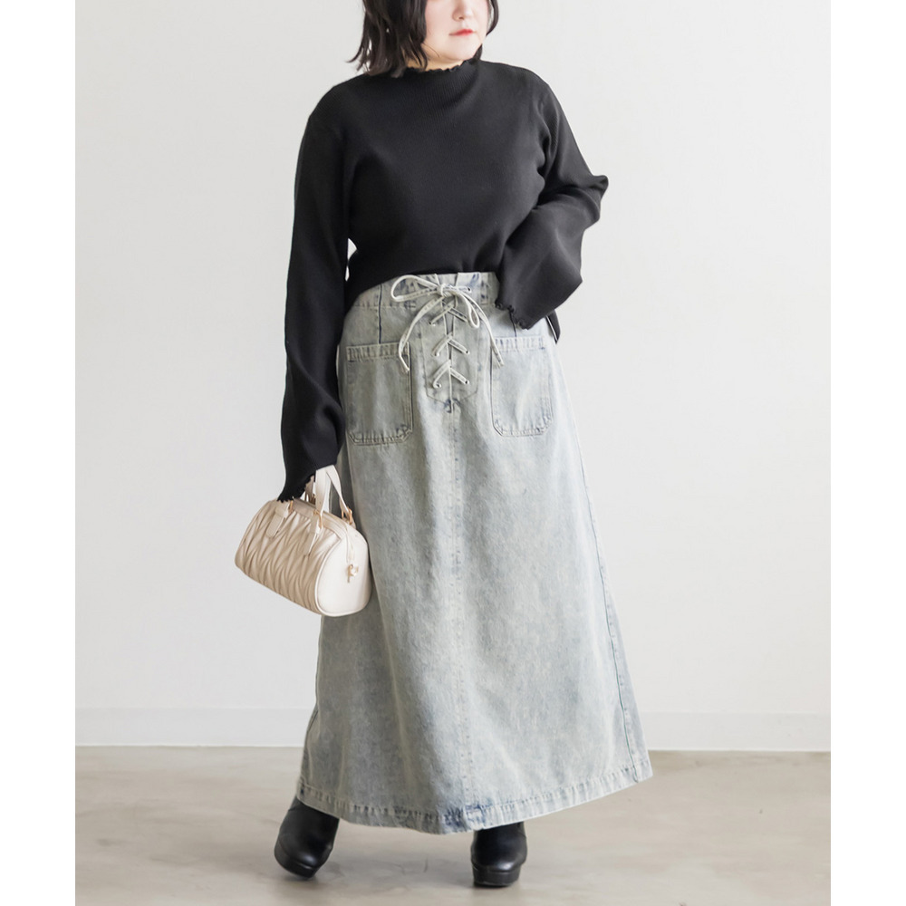 | 3Lを着て丁度いいサイズでした。程よくしっかりとしたデニム素材が腰周りやお腹のボディラインを拾わずにすっきりとみせてくれます!フロントはレースアップになっていて、お腹周りをカバーしてくれるデザインです!ポケットもついていて、のぺっとせずにメリハリのある印象にしてくれます!後ろゴムになっているので窮屈感も無く着られました。オールシーズン使えて、カジュアルにもフェミニンにも合わせやすい万能なスカートです◎ |