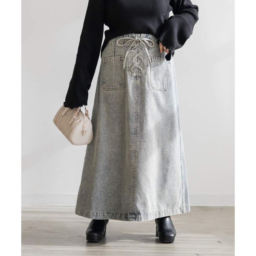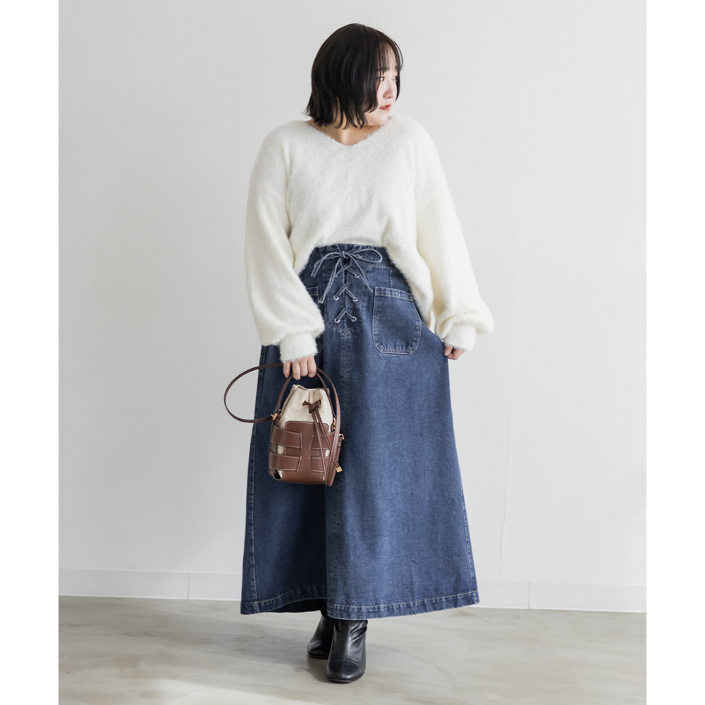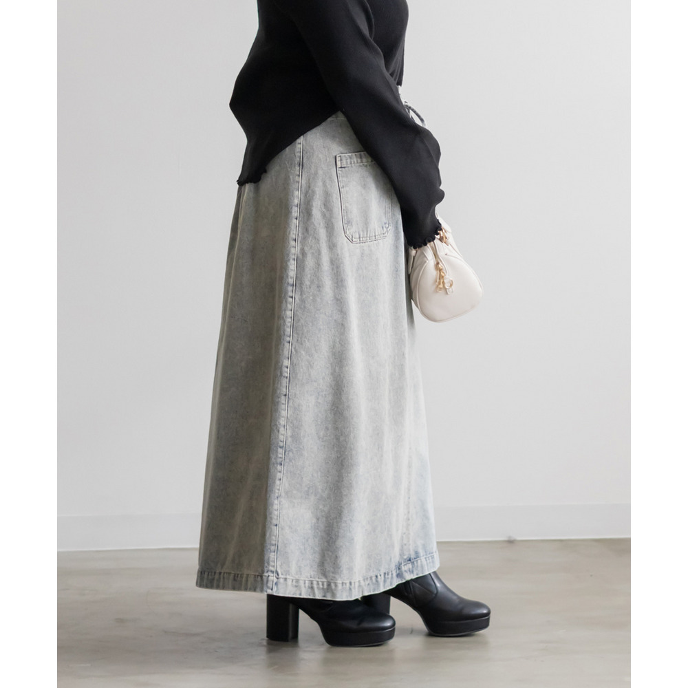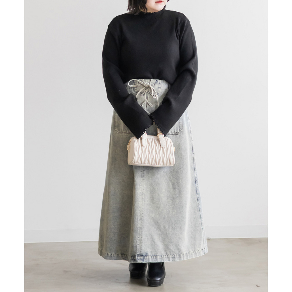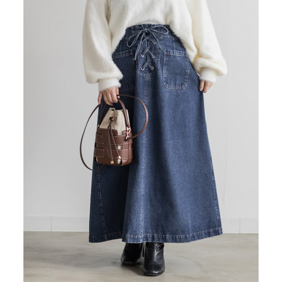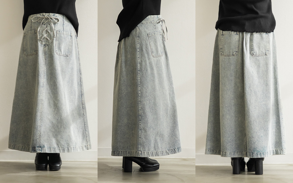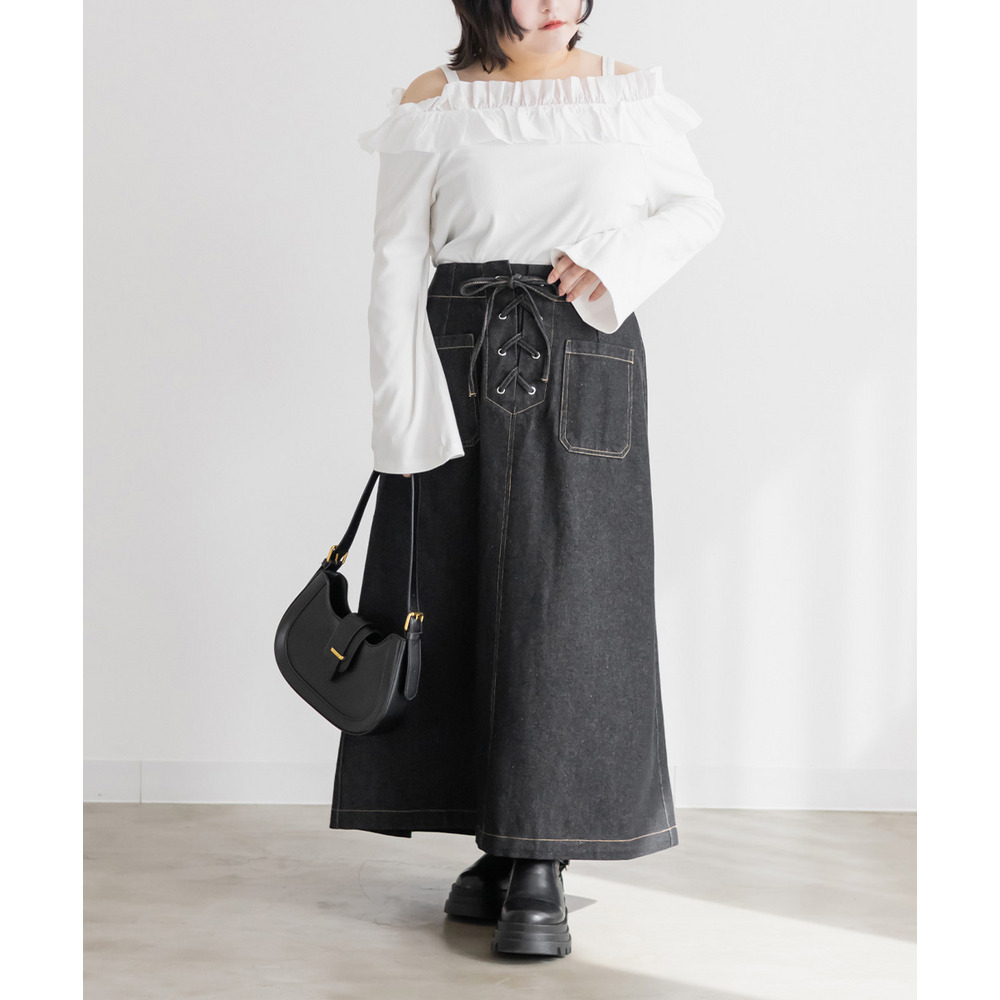 | 3Lを着て丁度いいサイズでした。程よくしっかりとしたデニム素材が腰周りやお腹のボディラインを拾わずにすっきりとみせてくれます!フロントはレースアップになっていて、お腹周りをカバーしてくれるデザインです!ポケットもついていて、のぺっとせずにメリハリのある印象にしてくれます!後ろゴムになっているので窮屈感も無く着られました。オールシーズン使えて、カジュアルにもフェミニンにも合わせやすい万能なスカートです◎ |