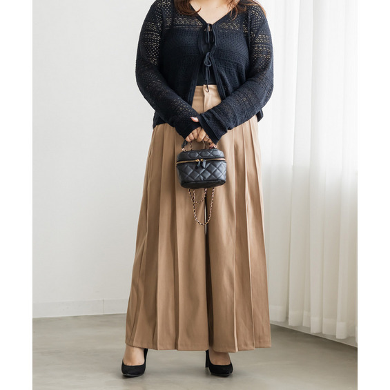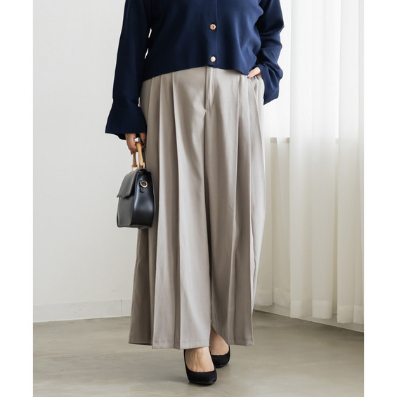 3Lを着用してちょうどいいサイズでした。程よくゆとりがありつつすっきり見えるシルエットで、楽ちんな着心地です!後ろウエストゴムでストレスフリーに穿けて、長時間のお出かけにも快適です◎季節感のあるスエードっぽい生地ですが、薄手で軽いので、動きやすさもありました。プリーツデザインがお洒落でシンプルなトップスとも相性がいいのでスタイリングに悩まず着回しが出来ます。オールシーズン使える便利なワイドパンツは脚のラインを拾いずらくリラックスして着られるのに、きちんと見えするのも嬉しいです。デイリーからお仕事までつかえる万能な1本です。