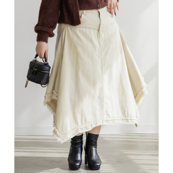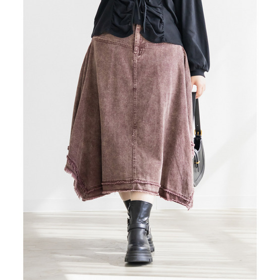 3Lを着てピッタリのサイズ感でした。ウエストは後ろゴム仕様で穿き心地もラクです。生地にほどよいハリがあるので体のラインを拾わず、すっきりとしたシルエットで着られました。フリンジデザインが目を引くおしゃれなスカートで、裾のイレヘムデザインが動くたびに軽やかで、シンプルなトップスを合わせるだけでもコーデが決まります◎ 丈感もミディ丈でバランスが取りやすく、ブーツにもパンプスにも合う1枚です♪