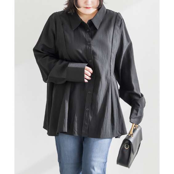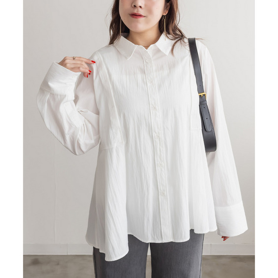 3Lサイズを着て、ほどよくゆとりを持って着られるサイズ感でした!ウエストタックが自然にくびれを作ってくれて、着るだけでシルエットが綺麗に見える1枚です。肩に隠しボタンがついていて、ヘルシーな肌見せが楽しめる、2WAYに加えて、ノースリーブシャツとしても使える3WAY仕様だから、オールシーズン着られてコーデの幅がぐっと広がるのが嬉しいポイントです◎とにかくシルエットが綺麗なのと、ハリのある上品な風合いの生地で、ボディラインをカバーしてくれるのが魅力のシャツです!1枚できれいめにもカジュアルにも着回せるので、普段使いからお仕事など、季節問わずたくさん着られる優秀シャツです。