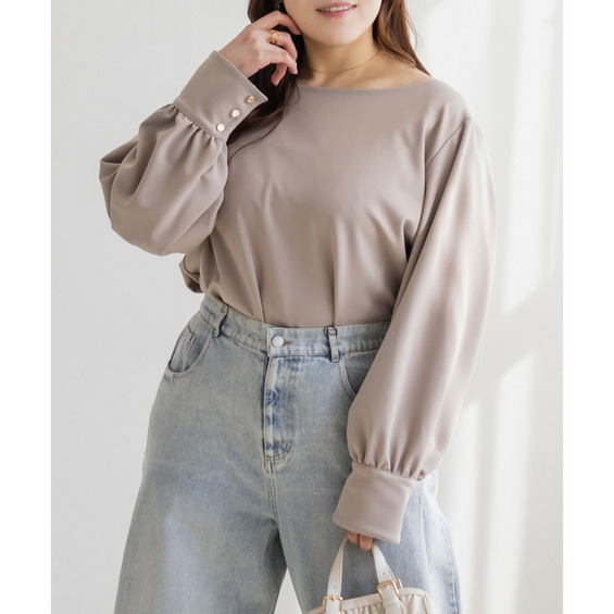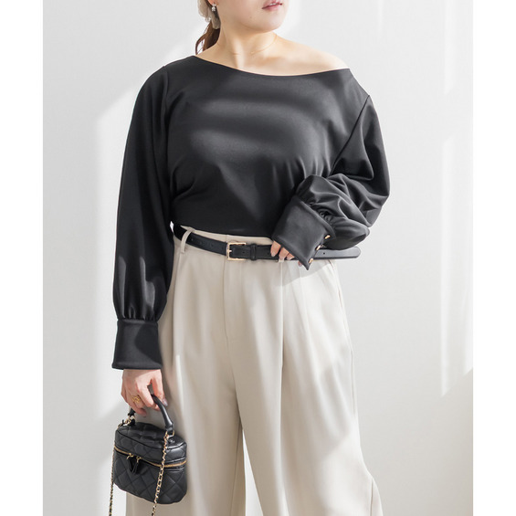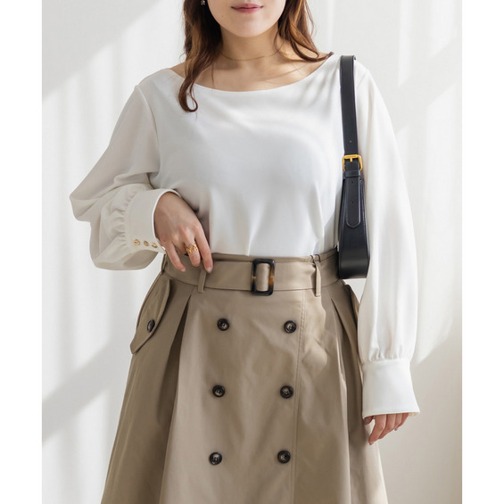 | 3Lサイズを着用して、ちょうどよくいつも通りのサイズ選びで問題なさそうでした。生地に伸縮性があって、程よくフィットしながらも窮屈さがなく、ちょうどいい着心地です♪ ボートネックの開きがデコルテをきれいに見せてくれ、片側だけ肩を落として着てもラインがきれいに決まり、今年っぽい抜け感が簡単に出せます◎ 袖のゴールドボタンが上品で、シンプルなボトムに合わせても華やかさがプラスされるのが嬉しいです!オンオフ問わず使いやすいので、ジャケットのインナーなどにも重宝しそうです!シーズンレスで使えるさらっとした生地感も魅力です。 |