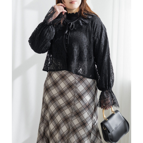 | 3Lサイズを着用しました。ちょうどいいサイズ感です♪レースがとてもフェミニンで、着るだけでぱっと華やぐブラウスです。Vネックと襟のデザインで顔まわりがすっきり見えるのも嬉しいポイント◎袖口がゴムになっているので腕まくりもしやすく、ふんわりとしたキャンディースリーブで二の腕カバーも♪柔らかいレースでチクチク感がない着心地なのもありがたいです。インナーを変えれば季節問わず着られるので、キャミ合わせでレディに、タートルを中に入れて大人っぽく着回しがとてもききます!1枚持っておくとおしゃれの幅がぐんと広がるブラウスです◎ |