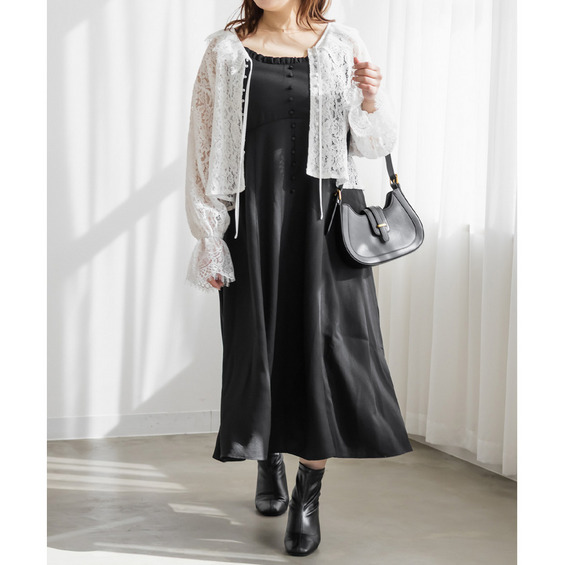 | 素材 | ■素材 綿55%、ナイロン45% ■裏地・透け感・伸縮性 裏地無し、透け感有り、伸縮性無し ■ポケット 無し ■生地感 花柄基調のレース生地をベースに、襟と袖口にはスカラップ調のレースを組み合わせています。チクチクしない柔らかめのレースです。 |