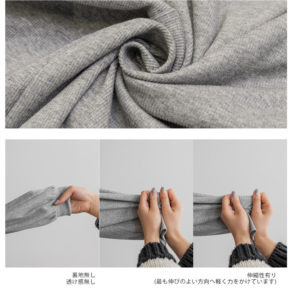 | 素材 | ■素材 綿78%、ポリエステル18%、ポリウレタン4% ■裏地・透け感・伸縮性 裏地無し、透け感無し、伸縮性有り ■ポケット 無し ■生地感 伸縮性のあるやわらかなリブカットソー素材 |