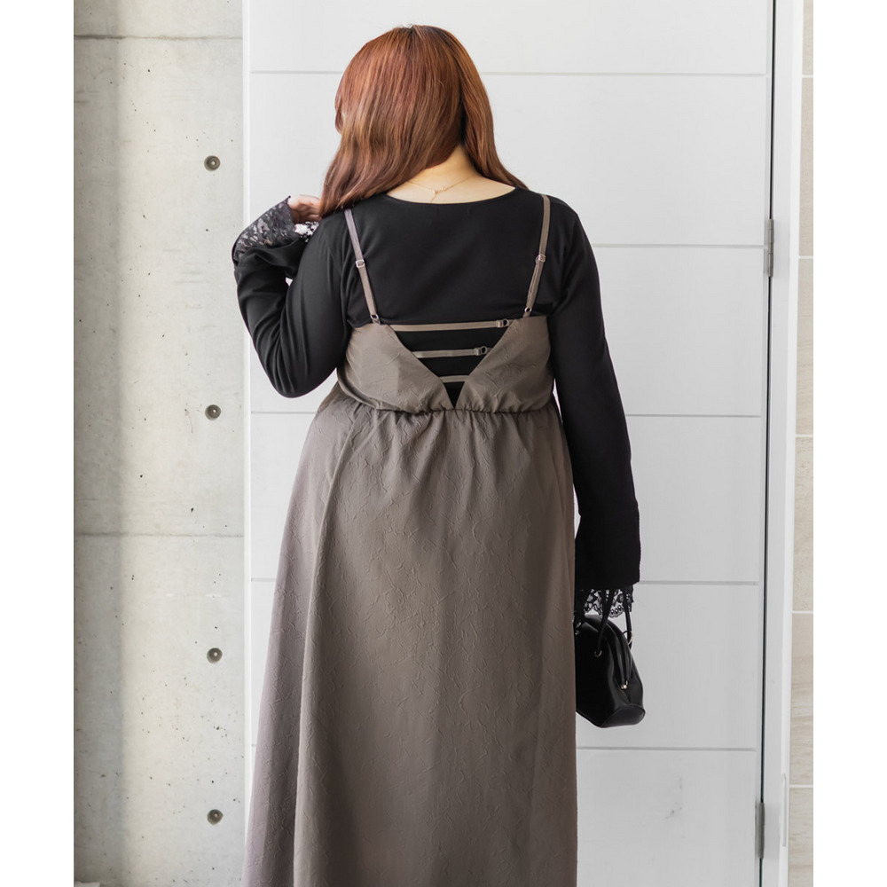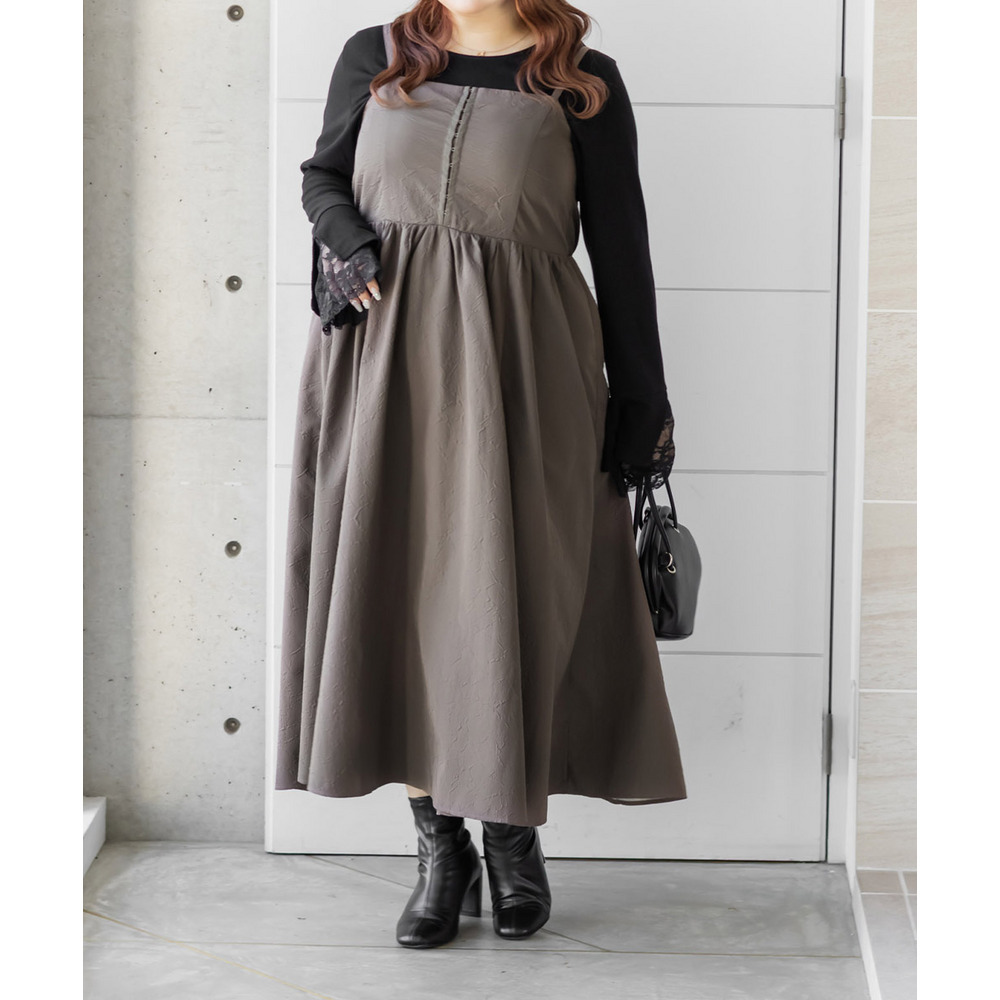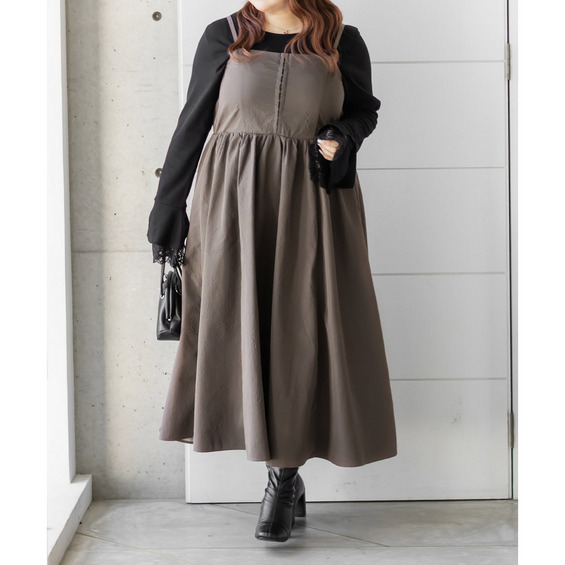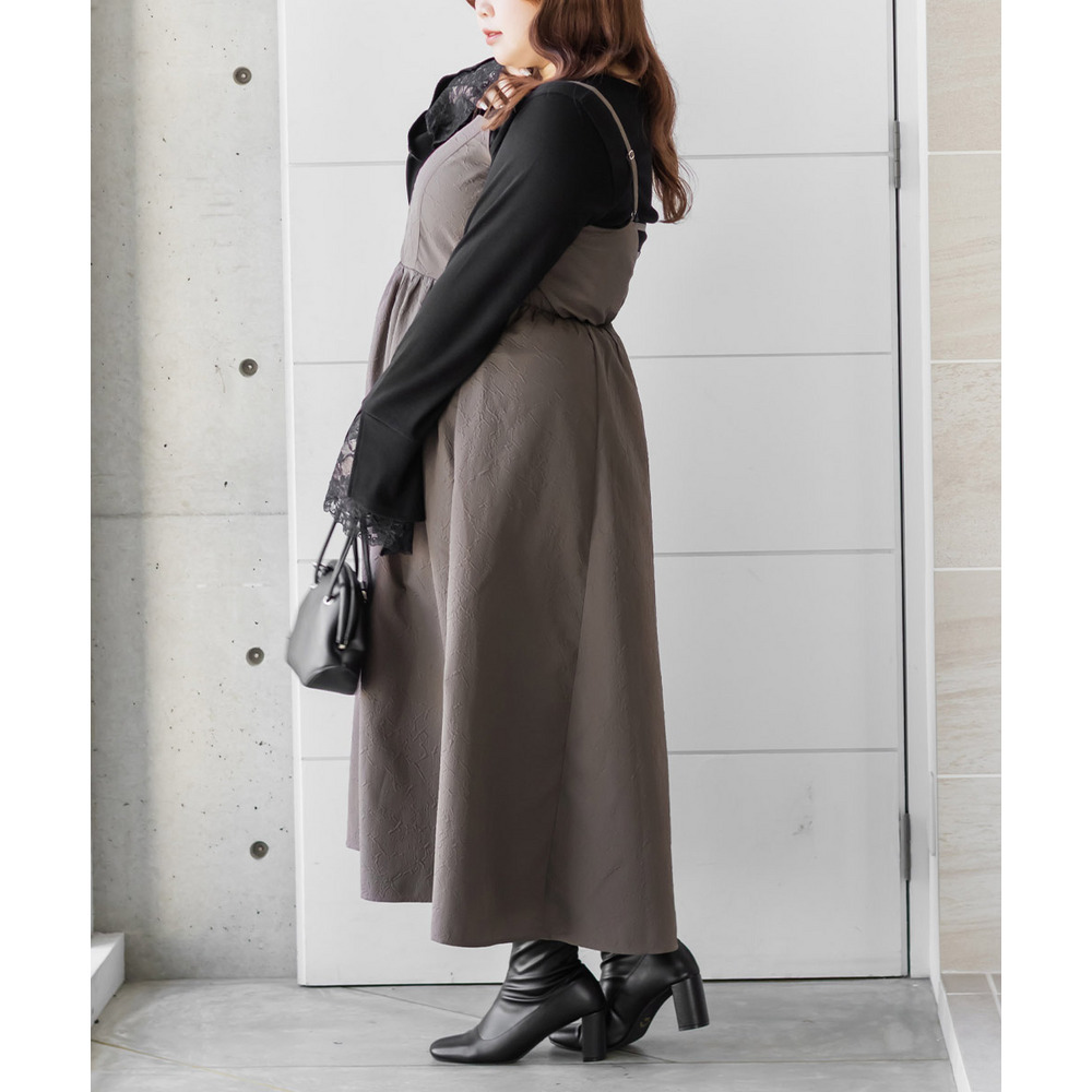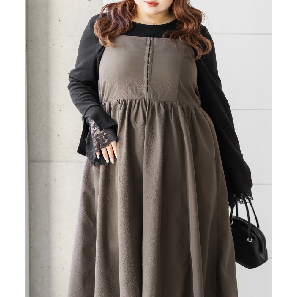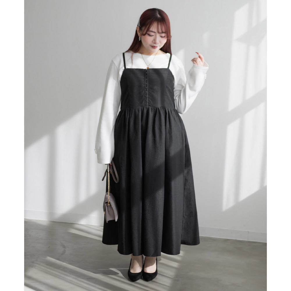 | 3Lサイズを着用して丁度いいサイズでした。気になる部分を隠してくれるから、気持ちも着心地もストレスフリーでした◎フロント部分はホックのデザインになっていて大人っぽい雰囲気で、甘くなりすぎずに今っぽい着こなしが完成します!凹凸のある生地感でボディラインをカバーしてくれます!後ろのデザインも可愛いので、ちょっと違った雰囲気でお洒落です! |