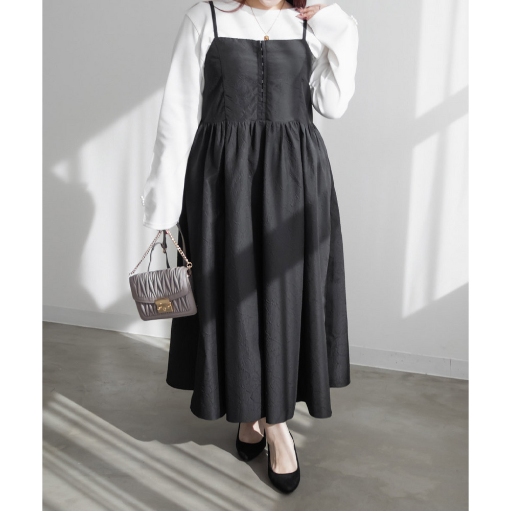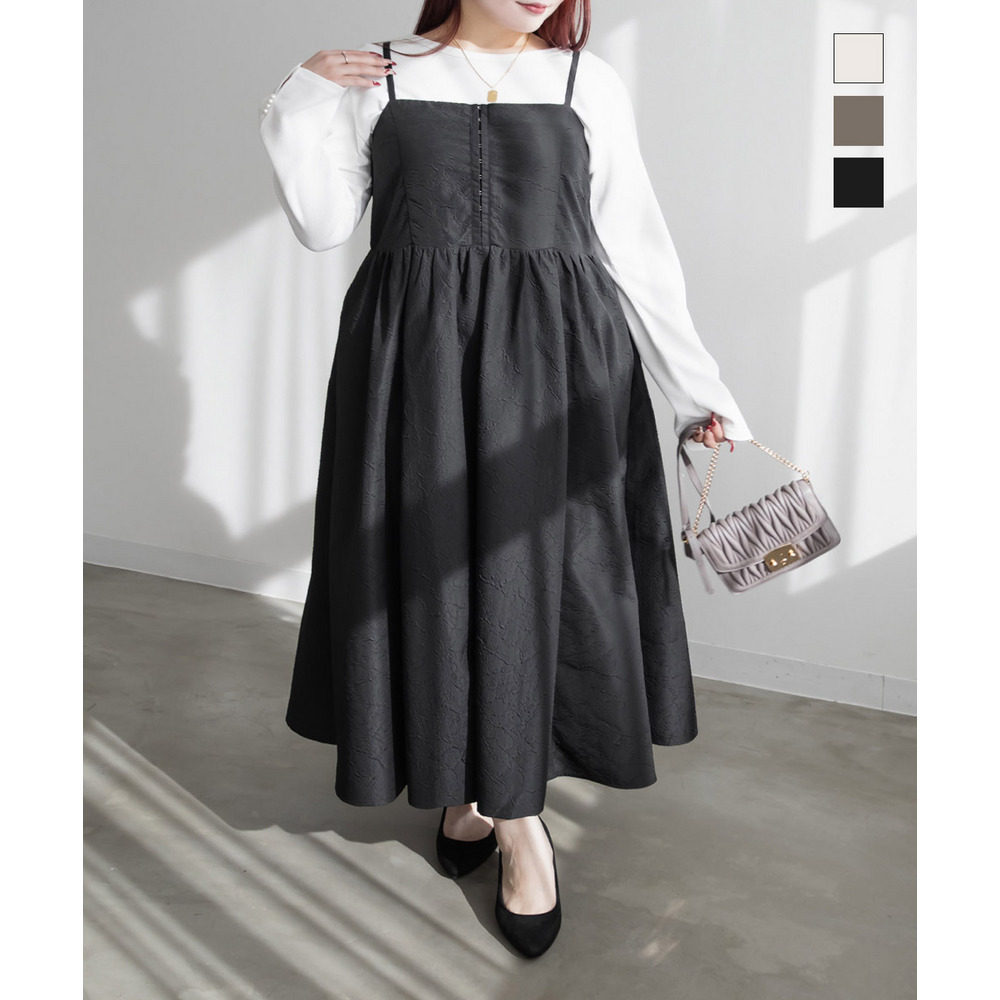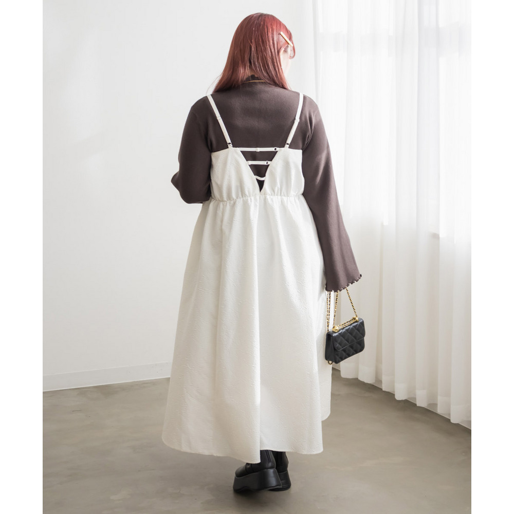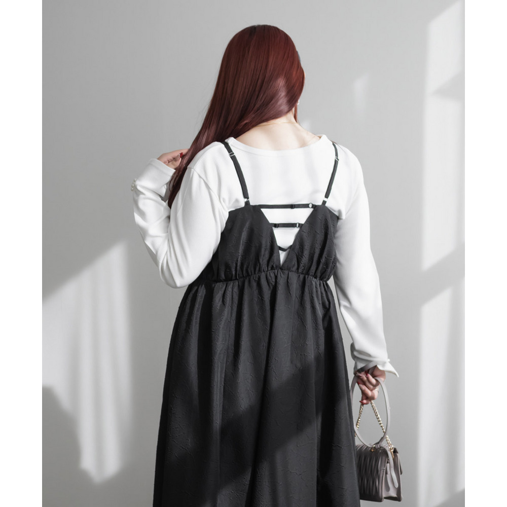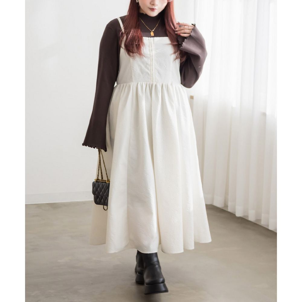 | 3Lサイズを着用して丁度いいサイズでした。気になる部分を隠してくれるから、気持ちも着心地もストレスフリーでした◎フロント部分はホックのデザインになっていて大人っぽい雰囲気で、甘くなりすぎずに今っぽい着こなしが完成します!凹凸のある生地感でボディラインをカバーしてくれます!後ろのデザインも可愛いので、ちょっと違った雰囲気でお洒落です! |