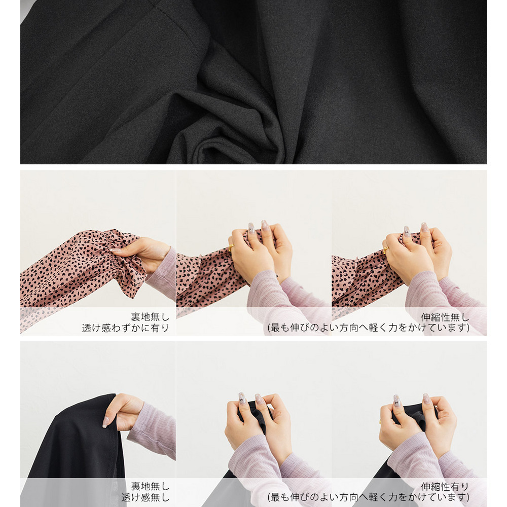 | 素材 | ■素材 【本体】ポリエステル95%、ポリウレタン5%、【別布部分】ポリエステル100% ■裏地・透け感・伸縮性 本体:裏地無し、透け感無し、伸縮性有り / 別布部分:裏地無し、透け感無し、伸縮性無し ■ポケット 無し ■生地感 本体:程よくしっかりとしたカットジョーゼット素材です。 別布部分:さらっとした素材です。 |
