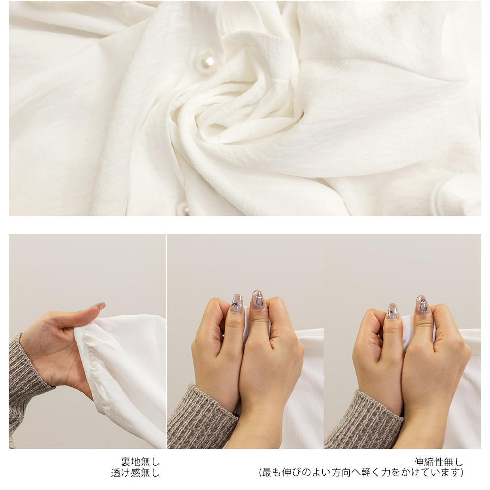 素材 ■素材 【本体】ポリエステル100%、【レース部分】ポリエステル100% ■裏地・透け感・伸縮性 裏地無し、透け感わずかに有り、伸縮性無し ■ポケット 無し ■生地感 とろみのある薄手のさらっとした素材です。