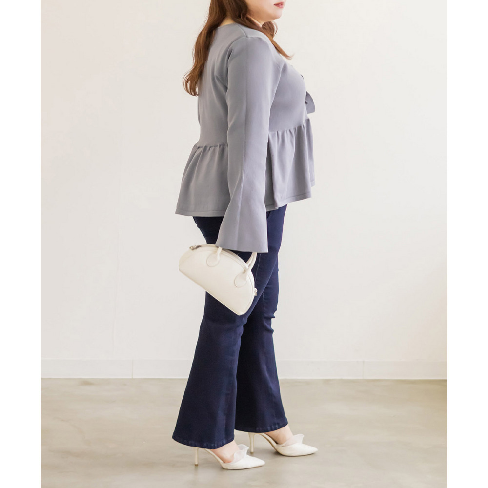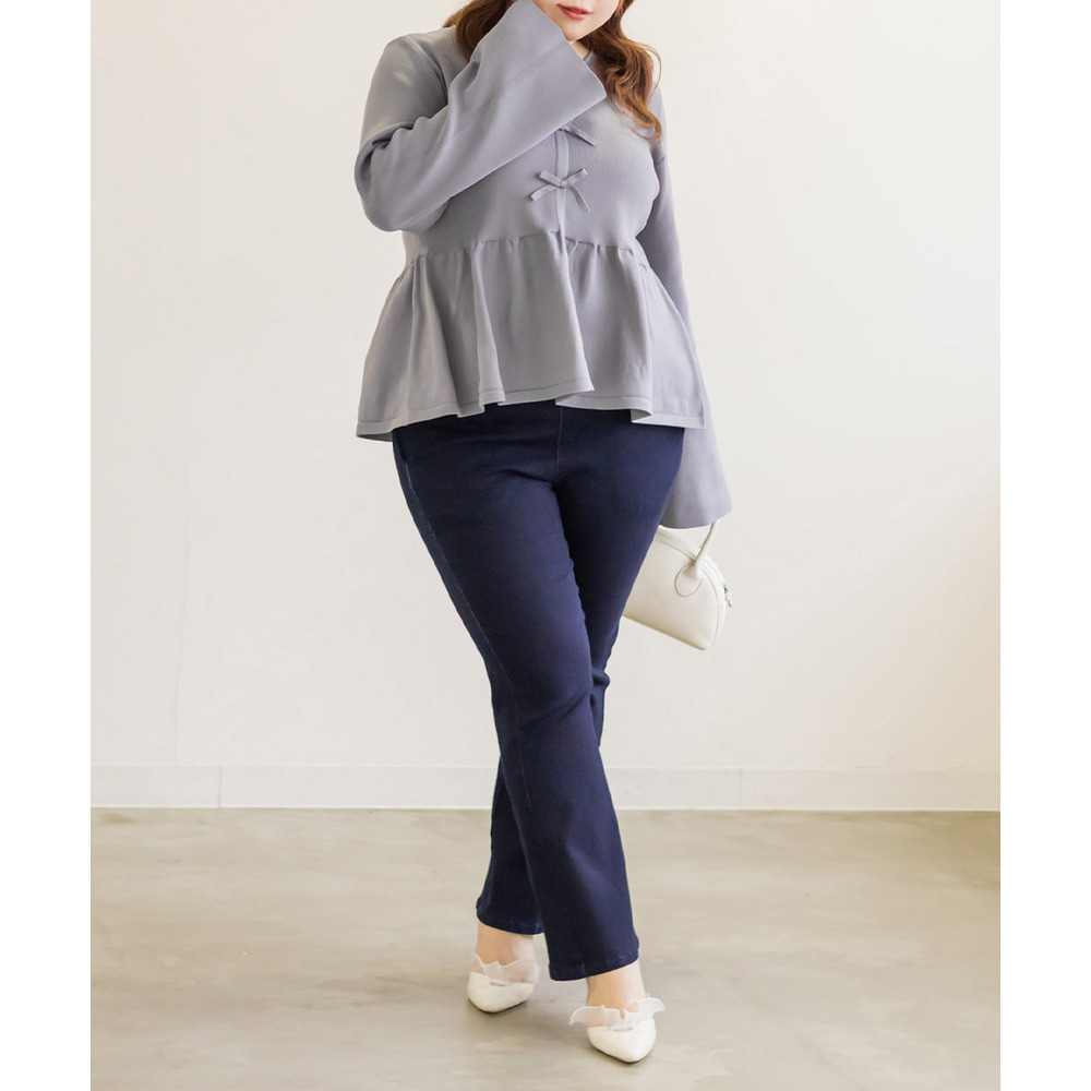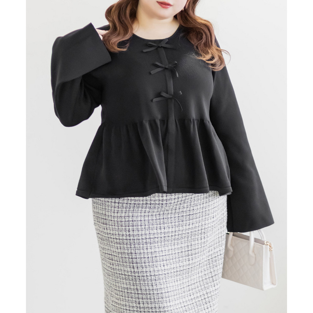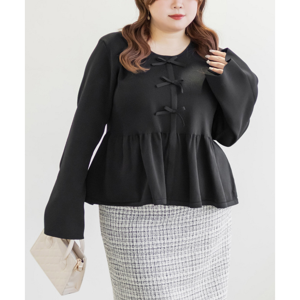 | 3Lを着てちょうどいいサイズでした。楽ちんな着心地でゆとりはあるのに、ペプラムシルエットで着やせができます◎軽いスポンジニットなので伸びも良くストレス無く着られました♪すっきりおしゃれにまとまる大人っぽいデザインで、フロントのリボンがさりげなくフェミニンな要素をプラスしてくれます!リボンは共地なので主張しすぎないのが嬉しいです。長めのフレアスリーブなので腕が綺麗に見えるのもポイント高いです!デニムやカジュアルなボトムと合わせてもフェミニンにまとまります! |