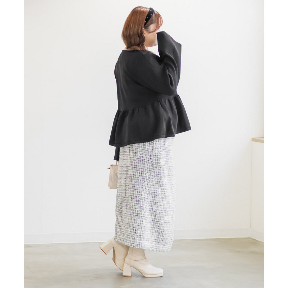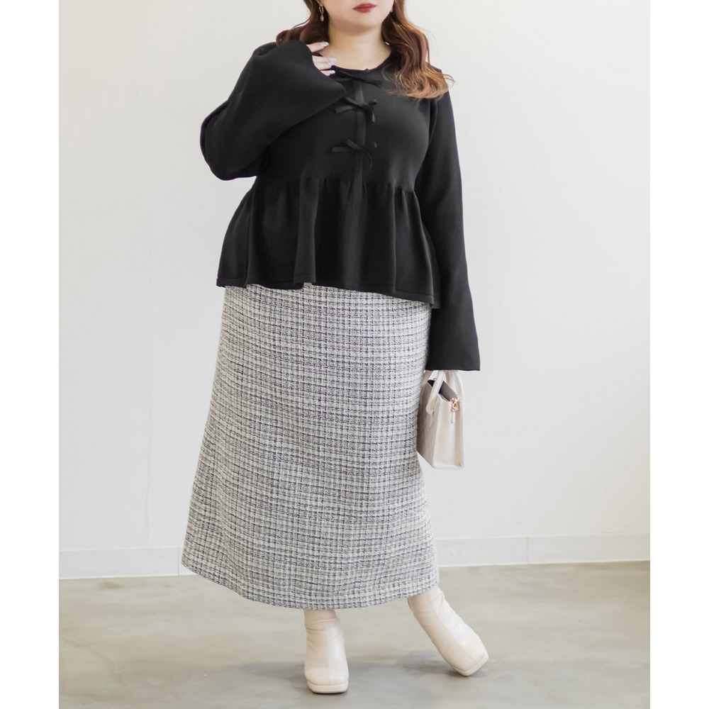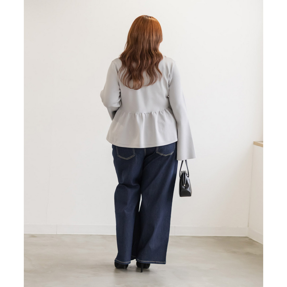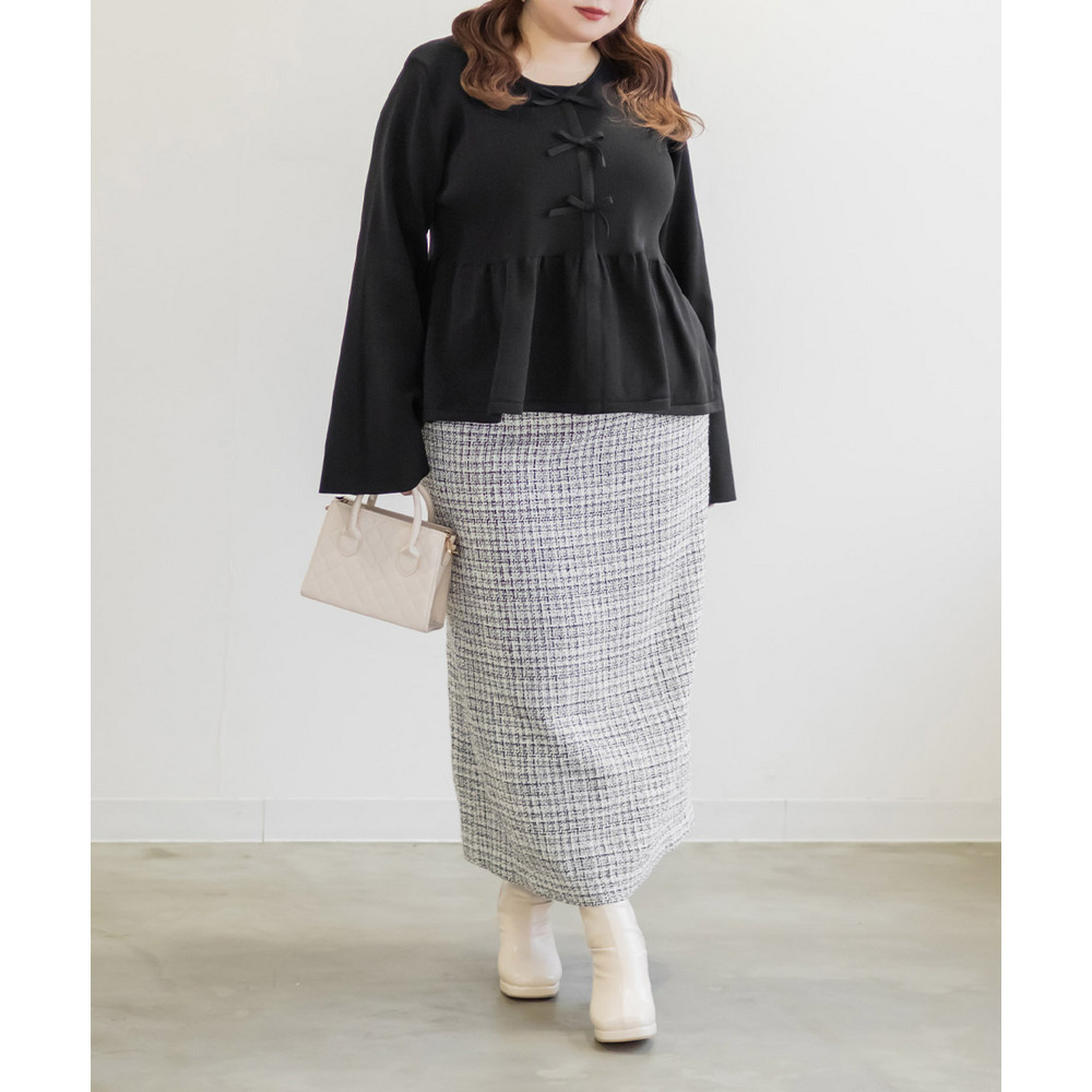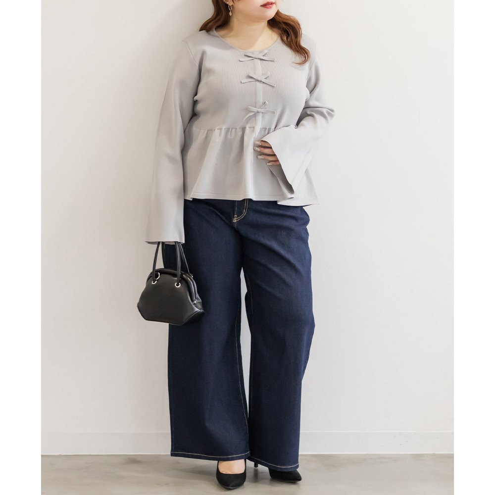 | 3Lを着てちょうどいいサイズでした。楽ちんな着心地でゆとりはあるのに、ペプラムシルエットで着やせができます◎軽いスポンジニットなので伸びも良くストレス無く着られました♪すっきりおしゃれにまとまる大人っぽいデザインで、フロントのリボンがさりげなくフェミニンな要素をプラスしてくれます!リボンは共地なので主張しすぎないのが嬉しいです。長めのフレアスリーブなので腕が綺麗に見えるのもポイント高いです!デニムやカジュアルなボトムと合わせてもフェミニンにまとまります! |
