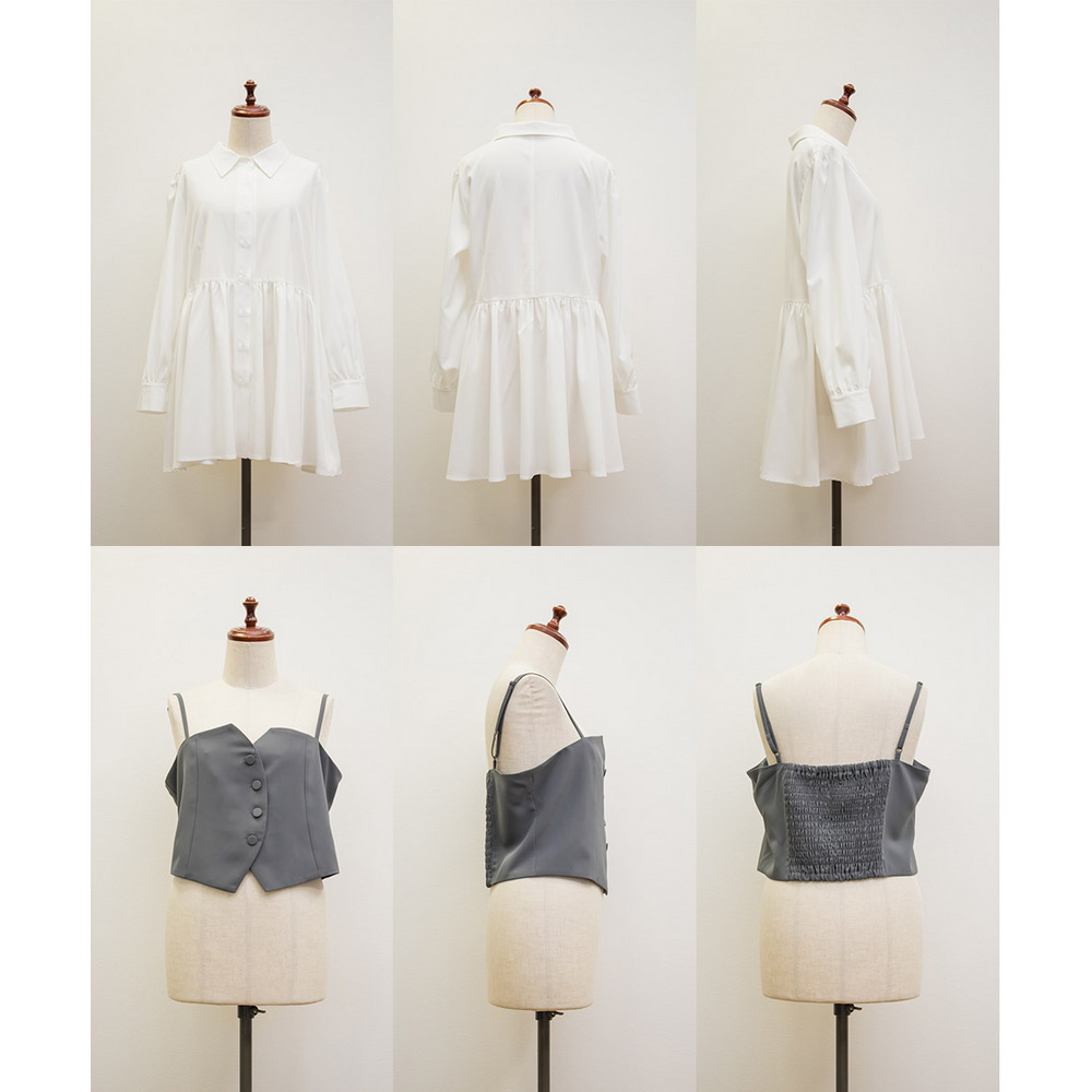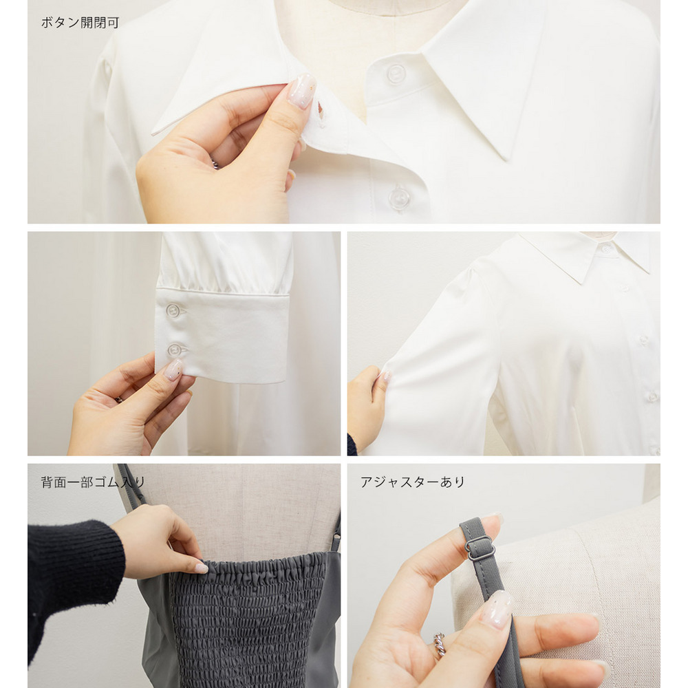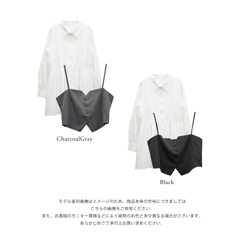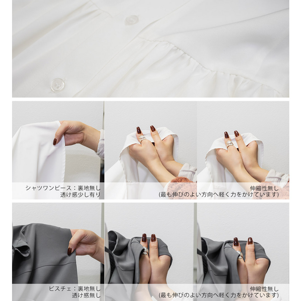 素材 ■素材 ポリエステル100% ■裏地・透け感・伸縮性 シャツワンピース:裏地無し、透け感少し有り、伸縮性無し / ビスチェ:裏地無し、透け感無し、伸縮性無し ■ポケット 無し ■生地感 肌離れがよくサラッとした、少しだけ光沢感のある滑らかな生地感です。