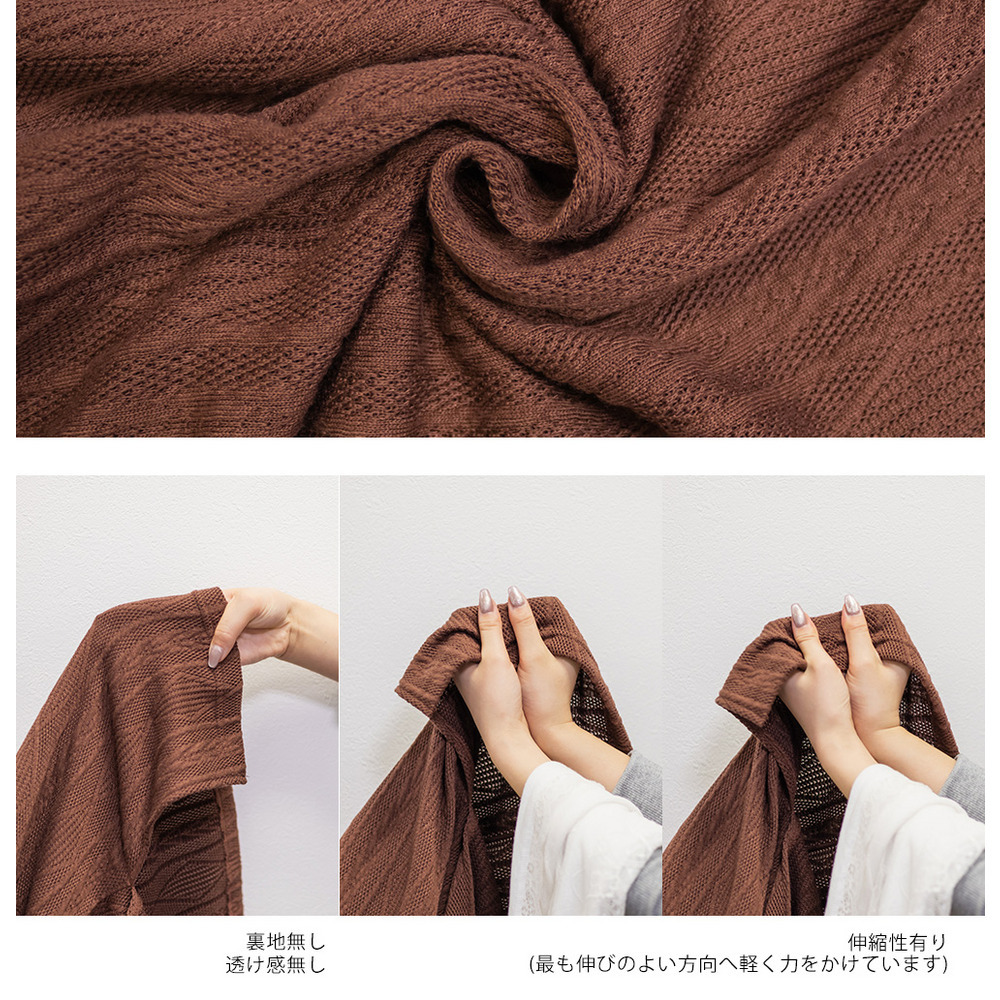 | 素材 | ■素材 ポリエステル95%、ポリウレタン5% ■裏地・透け感・伸縮性 裏地無し、透け感無し、伸縮性有り ■ポケット 無し ■生地感 程よくしっかりとした凹凸のあるカットソー素材です。 |