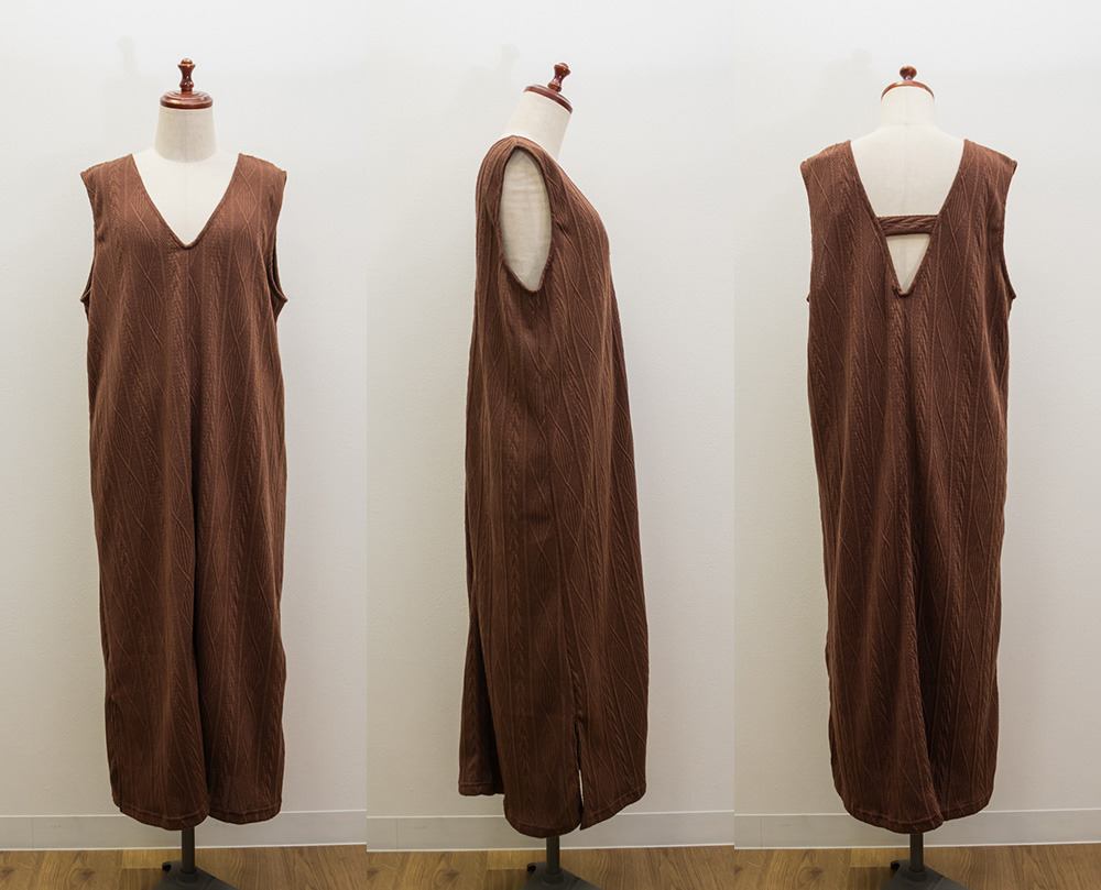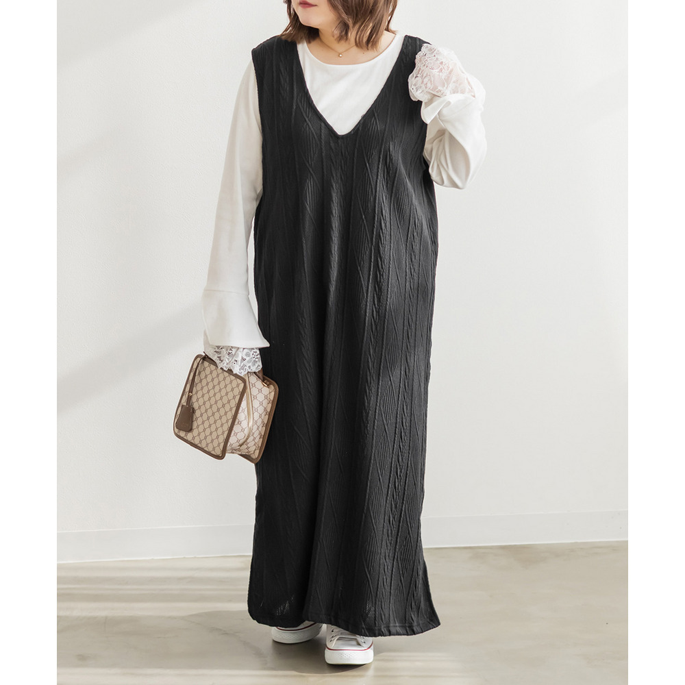 | 3Lサイズを着用して、ゆとりのあるサイズ感でした。3Lのサイズ感です。縦ラインのシルエットのワンピースですっきりとスタイルアップも期待できます!ケーブル編みのデザインのような生地だけど伸縮性もあり着心地が楽なのも嬉しいです。ブラウスやTシャツ、シアーインナーなどインナー次第でたくさん着回ししていただけます◎ |