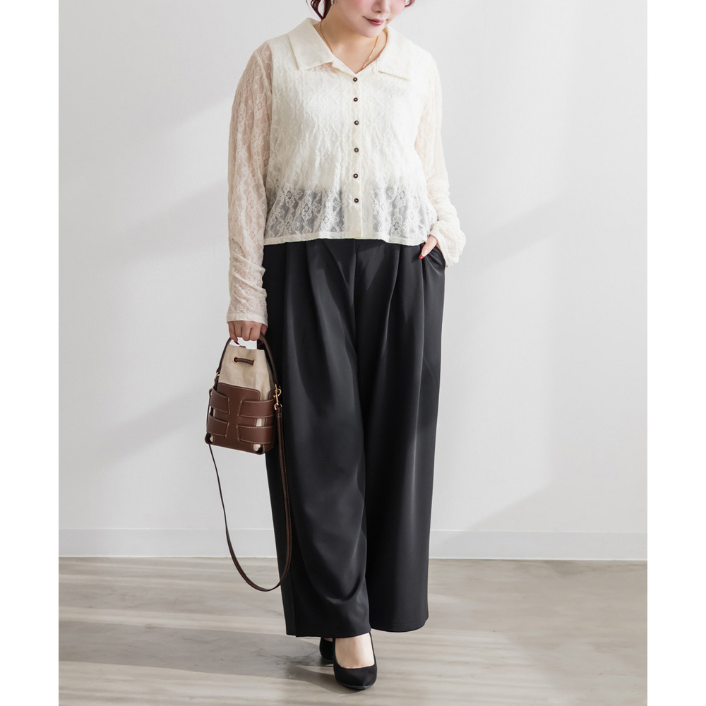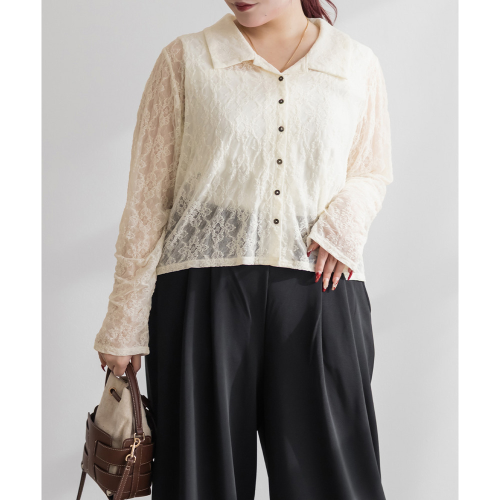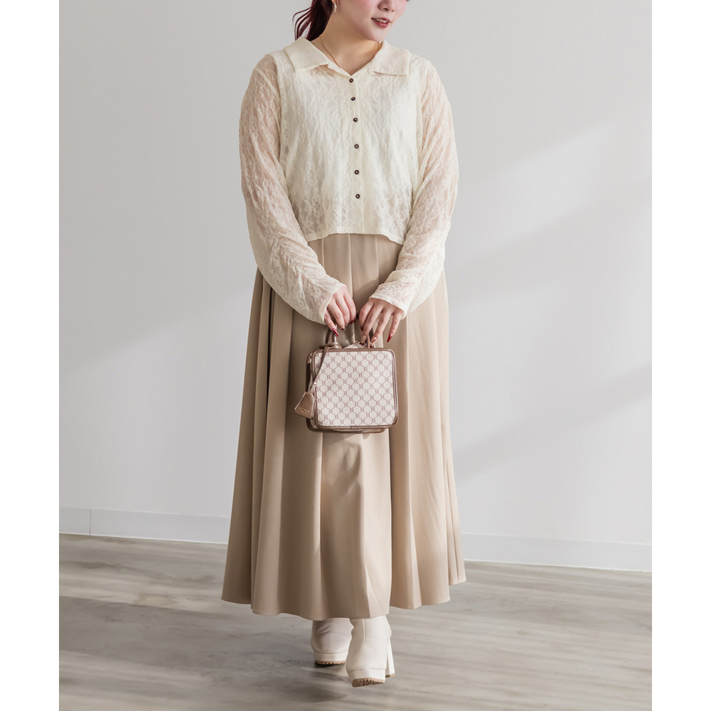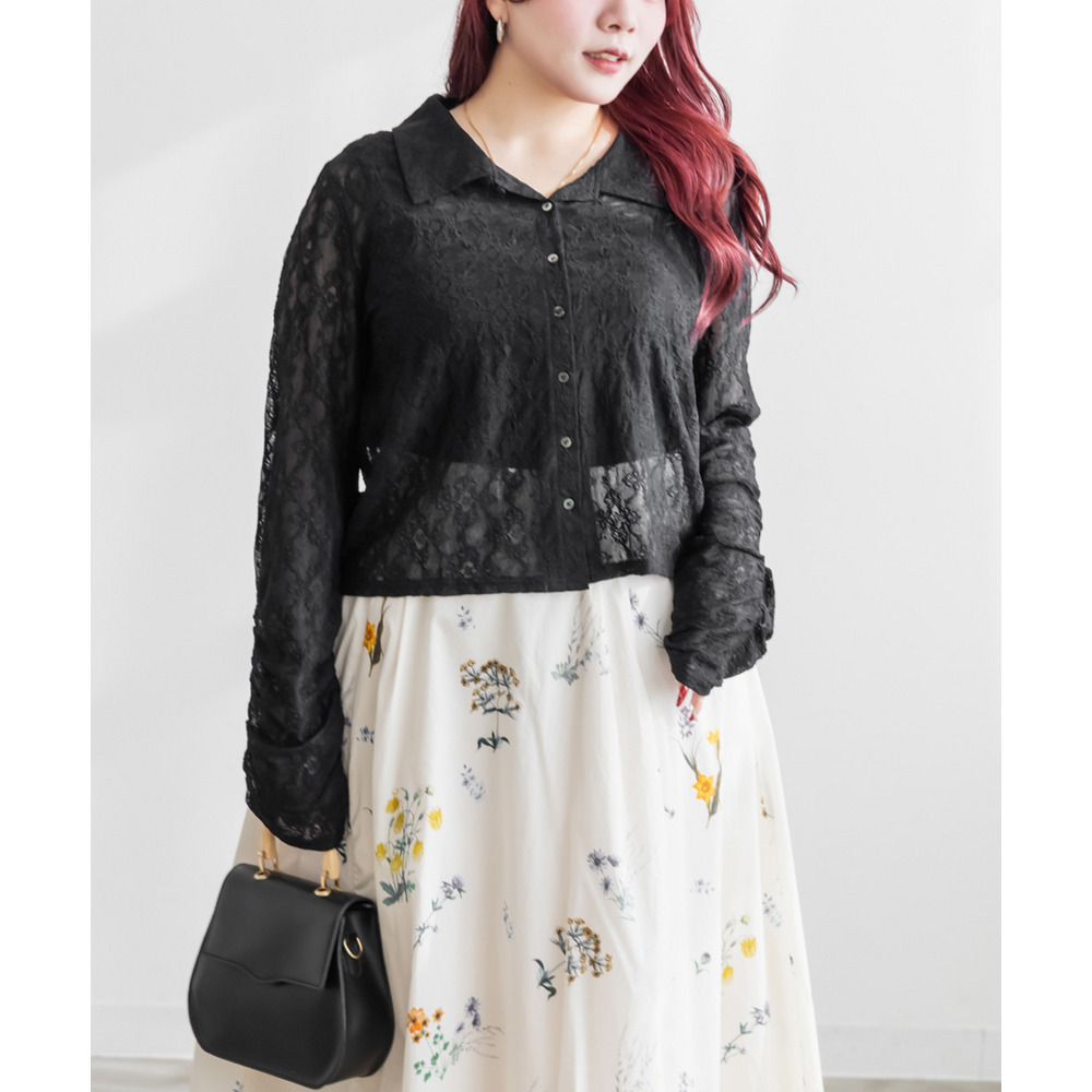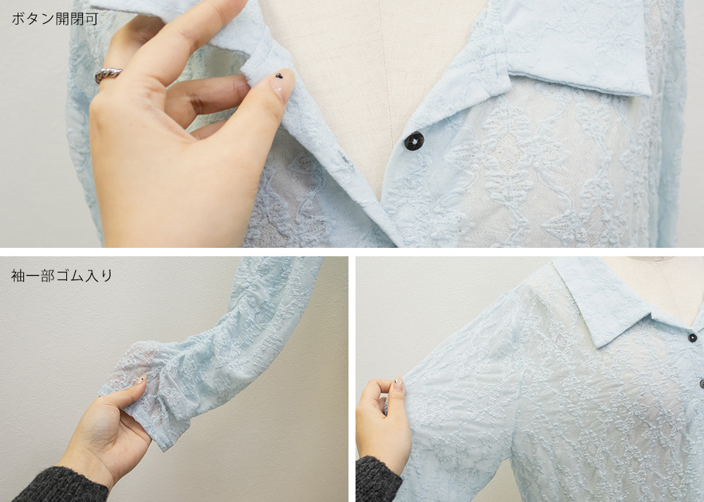 3Lを着て着用感はちょうどよく、伸縮性のあるレース素材なので窮屈さは感じませんでした。襟の開きがきれいで、デコルテや肩まわりがすっきり見えるのが嬉しいポイントです。薄手ですが体に張り付きすぎず、1枚着でも安心感がありました。袖下のゴムで自然にくしゅっと立体感が出て、二の腕もさりげなくカバーできます。スカート合わせでフェミニンにも、パンツ合わせで大人っぽくも着られて着回し力◎ キャミワンピのインナーにすると、程よい透け感がコーデのアクセントになっておすすめです♪