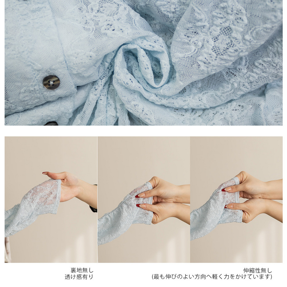 素材 ■素材 ナイロン95%、ポリウレタン5% ■裏地・透け感・伸縮性 裏地無し、透け感有り、伸縮性有り ■ポケット 無し ■生地感 伸縮性のある、薄手のレース素材