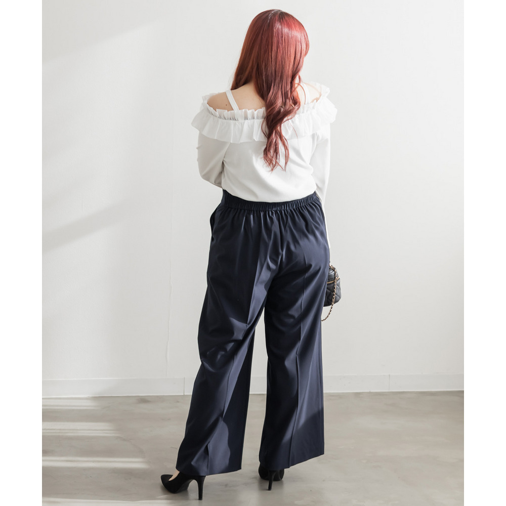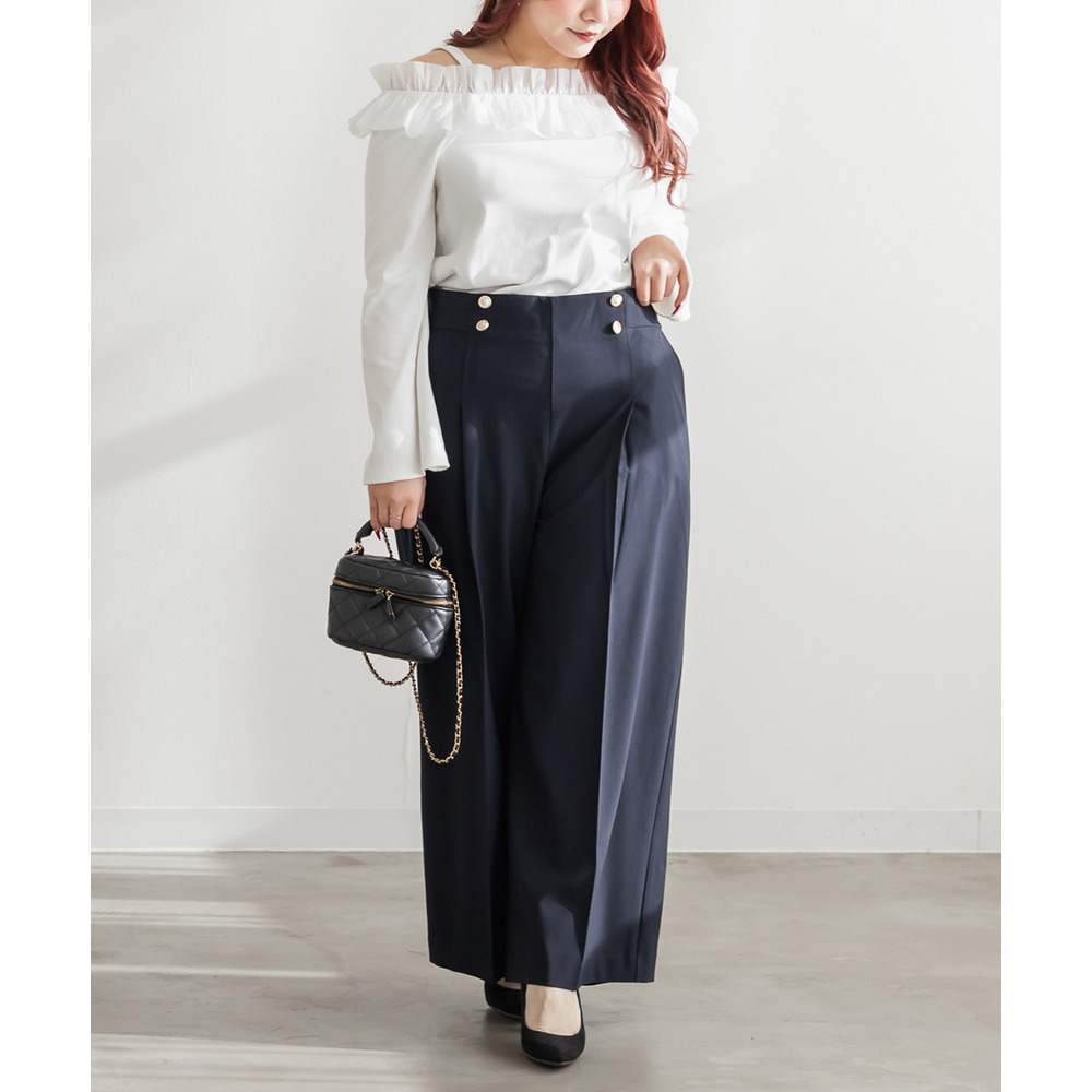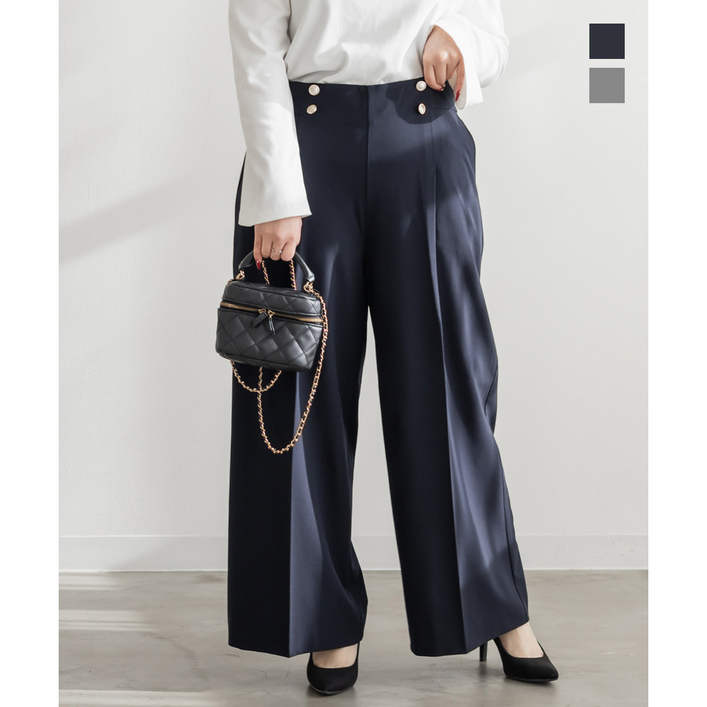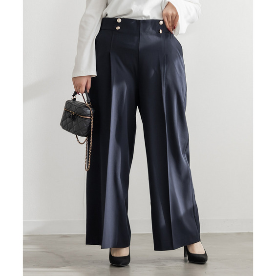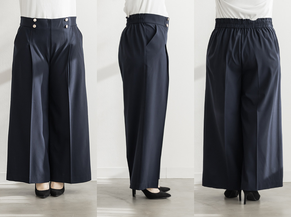 3Lサイズを着用して、楽な着心地でした!後ろはゴムなのと、脚のラインを拾わないワイドシルエットで、すっきりとした印象のアイテムです。フロントはゴールドボタンがついていてお腹周りもメリハリのある印象です◎どんなトップスとも相性良く着られて、コーデに困らないのが嬉しい!マリンっぽい雰囲気もあって、オールシーズン使える便利な1枚です!ちょっとキッチリ感を足したいシーンや通勤着としても良さそうです。トレンドに流されない王道パンツだから長いシーズン使えるのも嬉しいです!